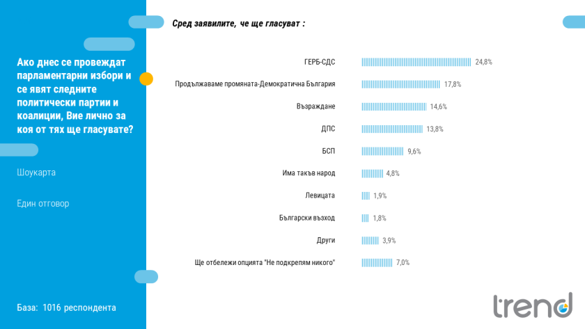 237 Основните институции у нас остават с ниско ниво на положителна оценка у нас показва изследване на обществените нагласи на социологическа агенция „Тренд“. Електоралните нагласи остават без особена промяна В обществото няма очакване, че ротацията ще доведе до съществена промяна в управлението Близо половината от българите не са запознати с промените в Конституцията Изследването е проведено в периода 17-24 януари по поръчка на в. „24 часа“. Анкетирани са 1016 пълнолетни граждани по метода на пряко полустандартизирано интервю „лице в лице“. Максимално допустимата стохастична грешка е +/- 3,1%. Партия ГЕРБ запазва първото място с дял от 24.8% сред гласуващите, следвана от „Продължаваме промяната-Демократична България“ (17.8%). „Възраждане“ запазва третата си позиция с подкрепа от 14.6% от гласуващите. Четвъртият в подредбата е ДПС (13.8%), а петото място остава за БСП (9.6%). За пореден месец и ИТН запазва позицията си с малко над бариерата за влизане в парламента с 4.8%. При евентуални нови парламентарни избори, 7% биха отбелязали опцията „не подкрепям никого“. Наблюдава се лек ръст в желанието за предсрочни парламентарни избори от 30% през ноември до 34% през януари. 42% са на мнение, че предсрочен вот не е необходим. Предстоящата ротация на министър-председателя Николай Денков с Мария Габриел не води до сериозно очакване за промяна в управлението. Според 56% ротацията няма да промени съществено управлението. Почти идентични са дяловете на хората, които смятат, че управлението ще се стане по-добро (15%) или обратното – по-лошо (16%). Близо половината от българите (46%) признават, че не са запознати по същество с промените в Конституцията. Само 17% изразяват одобрение към тях, като това се отнася за приблизително половината от избирателите на ГЕРБ и ПП-ДБ, както и около една пета от тези на ДПС. 30% не одобряват промените. Запазват се ниските нива на положително отношение спрямо работата на основните институции, но без задълбочаване на ерозията. Парламентът получава най-нисък дял положителни оценки (15%). Правителството се ползва с подкрепата на 22%. Симпатизантите на ПП-ДБ стоят плътно зад кабинета „Денков“. Сред избирателите на ГЕРБ 4 от 10 души подкрепят правителството, но мнозинството от тях не споделят това мнение. Положително отношение към работата на правителството декларират и около една трета от симпатизантите на ДПС. Без съществена промяна и в оценката за работата на президента – 36% го оценяват положително, а отрицателно – 52%. Може да ви хареса също Ще има ли оставки в БФС? Черпят скъпоценни имена, почитаме велик българин Фармацевтите обявиха протестна готовност заради новите правила за аптеките Букет от шест различни вируса ни атакуват в момента