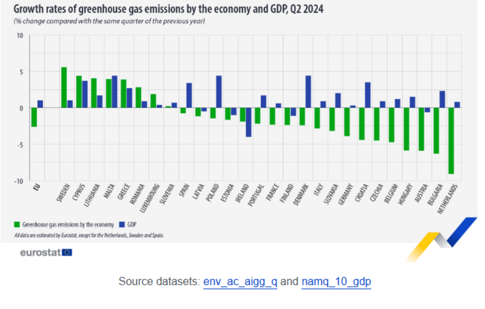 126 През второто тримесечие на 2024 г. емисиите парникови газове в ЕС са 790 милиона тона еквивалент на въглероден диоксид, което е спад с 2,6 на сто спрямо същото тримесечие на 2023 г. (812 милиона тона еквивалент на въглероден диоксид), според данни на Евростат. Въпреки регистрираното понижение на показателя брутния вътрешен продукт (БВП) на ЕС регистрира увеличение с 1 на сто през второто тримесечие на 2024 г. спрямо същия период на 2023 г. През второто тримесечие на 2024 г. спрямо същия период на 2023 г. икономическите сектори, които са допринесли в най-голяма степен за намаляването на парниковите емисии са електроенергията и доставките на газ (-12,1 на сто) и домакинствата (-4,2 на сто). През второто тримесечие на 2024 г. емисиите парникови газове са се понижили в 19 страни членки спрямо същото тримесечие на 2023 г. Най-значителен спад на емисиите парникови газове през второто тримесечие е регистрирано в Нидерландия (9,1 на сто), България (6,3 на сто), Австрия и Унгария (5,9 на сто във всяка от двете страни). От 19-е страни , които според оценката на Евростат, са намалили емисиите, пет са отчели спад на БВП (Ирландия, Финландия, Естония, Латвия и Австрия). Останалите 14 страни (Полша, Дания, Хърватия, Испания, България, Словакия, Португалия, Унгария, Белгия, Италия, Чехия, Нидерландия, Франция и Германия) са намалили емисиите, но БВП е нараснал./БТА Може да ви хареса също НОИ отчете 12% ръст на осигурителния доход, пенсиите с очаквани 7,8% нагоре Жълт и оранжев код за обилни валежи утре Годишната инфлация в България за януари е 3,5 на сто Кои имена се спрягат за служебни министри