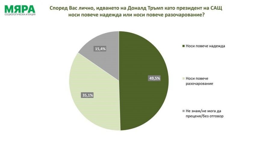 182 Новият кабинет с премиер Росен Желязков стартира с близо 60% обществена подкрепа. 37,4% от пълнолетните българи приемат формулата на създаденото току-що правителство, други 21,4% я приемат, но не твърдо. 16,5% по-скоро не приемат формулата, а 20,8% съвсем не я приемат. Останалите се затрудняват да отговорят. Така правителството на Желязков с мандат на ГЕРБ-СДС, с участие на БСП и ИТН и с подкрепа на ДПС на Ахмед Доган, получава стартов обществен толеранс, макар и неголям. Това сочат данни от кратък експресен телефонен сондаж на новата социологическа агенция „Мяра“. Той представя мненията на пълнолетното население на страната и е проведен на 16 и 17 януари сред 800 души. Данните кореспондират с очакванията на българите да се направи компромис и да се създаде правителство, които агенцията на Първан Симеонов отчете още в края на 2024 г. В същото време, не са малки дяловете на негативните реакции. Обществената възприемчивост не е тъждествена на доверие или одобрение. Най-положителни са оценките сред електоратите на участващите партии. При останалите се долавя в най-добрия случай облекчение, че се е създал някакъв кабинет. Сходна е картината по отношение на встъпването в длъжност на американския президент Доналд Тръмп: за 49,5% от запитаните неговото идване носи повече надежда. За 35,1% обаче това е разочарование. Не са малко и колебаещите се – 15,4%. Колебанията стават пък съвсем видими при задаване на прословутия въпрос за войната – 47% вярват, че Тръмп действително може да намери изход от ситуацията с руската агресия в Украйна, 44,3% обаче не вярват в това. Данните са от независим телефонен сондаж на социологическа агенция „Мяра“, проведен на 16 и 17 януари 2025 г. сред 800 пълнолетни български граждани. Максималното стандартно отклонение е ±3,5 при 50% дялове. 1% от извадката се равнява на около 54 000 души, допълват социолозите. Може да ви хареса също Запрянов: Повишена е готовността на системите за противовъздушна и противоракетна отбрана на страните от Източния фланг Хасан Адемов: Социалната работа изисква не само знания и умения, но и съпричастност Министър Нейнски: Европа е единна за високите цени на горивата, България няма проблем с доставките Дечев: Знаем кои са рисковите секции, които обикновено гласуват по съмнителен начин