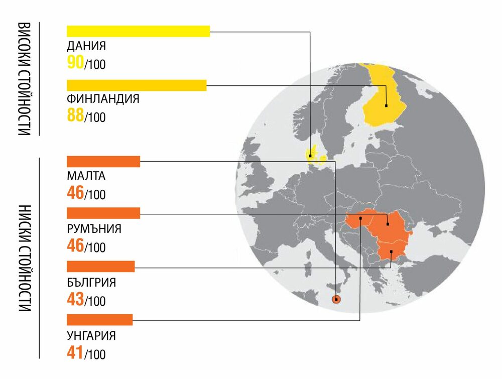 227 Според Индекса за възприятие на корупцията за 2024 г., публикуван днес от неправителствената организация „Трансперънси Интернешънъл“ („Transparency International“) на официалния ѝ сайт за България, глобалните нива на корупция остават тревожно високи, а усилията за нейното ограничаване се оказват неуспешни. В тазгодишното издание на индекса България получава 43 точки, което е под критичния праг от 50 точки и „сигнализира за сериозни предизвикателства в борбата с корупцията в страната“. България е само преди Унгария от страните в Европейския съюз (ЕС), показват резултатите. С този брой точки България остава сред държавите с високи нива на корупция в публичния сектор, според индекса. Той измерва нивата на политическа корупция и показва, че тя е бариера за доброто управление, несъвместима е с функционирането на демократичните институции и устойчивото икономическо развитие, обясниха от неправителствената организация. Докладът на „Трансперънси Интернешънъл“ сочи, че повече от две трети от държавите по света получават резултат под 50, а средната глобална стойност на индекса остава непроменена – 43 точки. Дания оглавява класацията с 90 точки, докато държави като Сомалия (9), Венецуела (10) и Сирия (12) остават на дъното. В контекста на Европейския съюз България продължава да изостава в сравнение със средното ниво за стария континент, което остава около 62,33 точки, показват също данните. Най-големите предизвикателства за страната остават борбата с безнаказаността, укрепването на институциите и повишаването на общественото доверие в управлението, пишат още от „Трансперънси Интернешънъл“. Може да ви хареса също Цените на горивата у нас продължават да се покачват Екологична опасност край Пясъчево: замърсена почва след влаковата катастрофа през 2025 г. 9 делфина и над 300 буревестници са открити мъртви на Северното Черноморие, предстои аутопсия Дечев: Миграционната обстановка по държавната граница на България към момента е спокойна