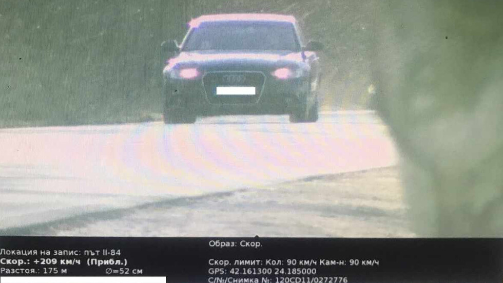 184 Шофьор е засечен да кара с 209 км/ч между пазарджишките села Звъничево-Братаница-Ветрен дол. Това съобщи Мирослав Стоянов, говорител на Областната дирекция (ОД) на МВР в Пазарджик. Ограничението на този път извън населените места е 90 км/час, допълни той и поясни, че мъжът е хванат в резултат на засиления контрол по пътищата. През август 2024 година водач на автомобил беше засечен да шофира със 120 км/ч над допустимата скорост на пътя Пазарджик – Пловдив – с 210 км/ч. Може да ви хареса също Андрей Гюров: Купуването на гласове не е битка само на служебния кабинет, а на обществото Правителството преговаря с ЕК за допълнителна подкрепа от 50 млн. евро за транспортния сектор Хотелите по Южното Черноморие ще останат празни за Великден България е сред водещите страни в ЕС по запаси от природен газ