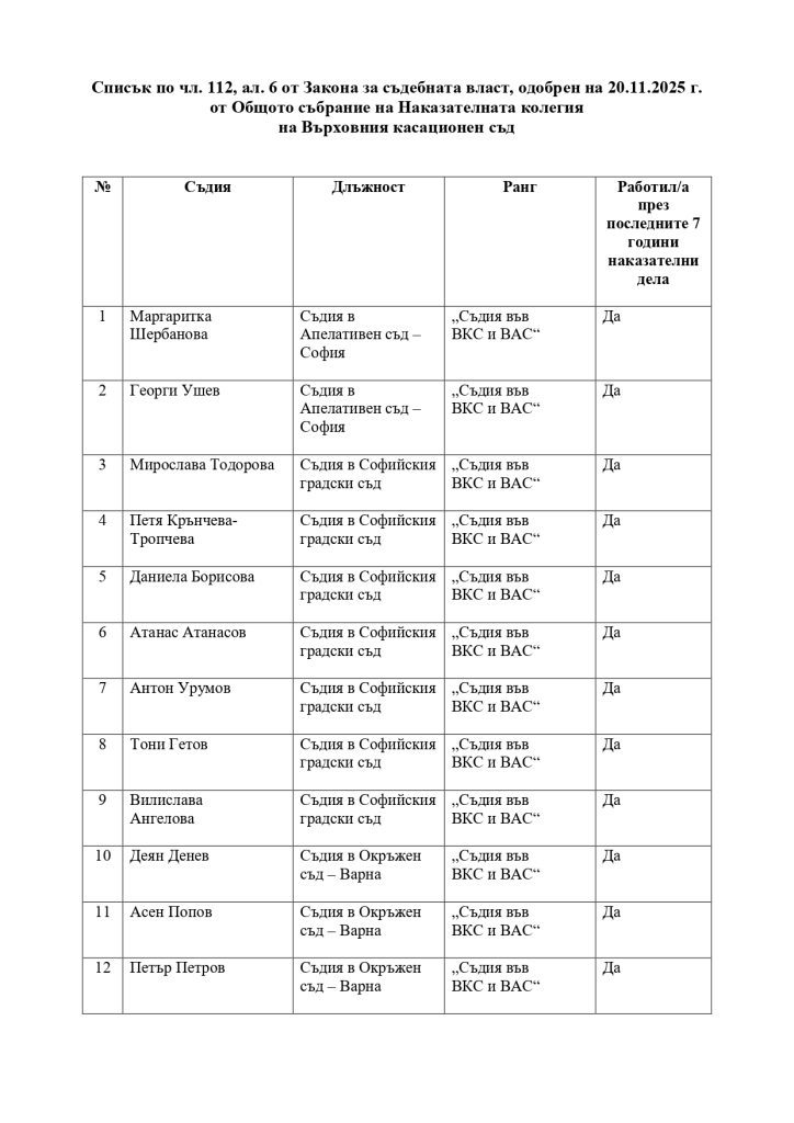 140 12 съдии от Софийския апелативен съд, Софийския градски съд и Окръжния съд във Варна са дали съгласие да бъдат включени списъка, от който ще бъде избран следващият прокурор, разследващ главния прокурор. На 20 ноември Общото събрание на Наказателната колегия на Върховния касационен съд е одобрило списъка, съобщиха от ВКС. Става дума за действащи магистрати на длъжност съдия във Върховния касационен съд от Наказателната колегия или с ранг на съдия във ВКС от наказателните отделения на апелативните и окръжните съдилища. Преди 2 г. при старта на механизма желаещите съдии да разследват главния прокурор бяха 21. Сред тях имаше и магистрати от Върховния касационен съд за разлика от настоящия списък от съдии. По закон за ad hoc прокурори могат да бъдат действащи съдии от Наказателната колегия на ВКС или съдии с ранг „съдия във ВКС“ от наказателните отделения на апелативните и окръжните съдилища, които последните седем години преди включването им в списъка са работили като наказателни съдии. Участието на съдиите в процедурата е след тяхно изрично съгласие. Мандатът на първия съдия, който разследва главния прокурор и неговите заместници, Даниела Талева изтича през декември. Ако към дата 7 декември т.г. има висящи производства, на случаен принцип ще се избере кой от 12-имата съдии ще бъде назначен за нов специален прокурор. За първи път списък със съдии е одобрен на 20 юни 2023 г., припомня Nova. На принципа на случайния подбор на включената в този списък съдия Даниела Талева е разпределена първата преписка, образувана по новия ред в НПК за разследване на престъпления, извършени от главния прокурор или от негов заместник. Може да ви хареса също Президентът Румен Радев ще връчи мандат за съставяне на правителство на ГЕРБ-СДС Банките са приели 150 тона монети за 2 дни, което се равнява на 10 ТИР-а Камион се удари в мост на Подбалканския път и разби арматурата Дига на река Струма край Батановци се скъса
