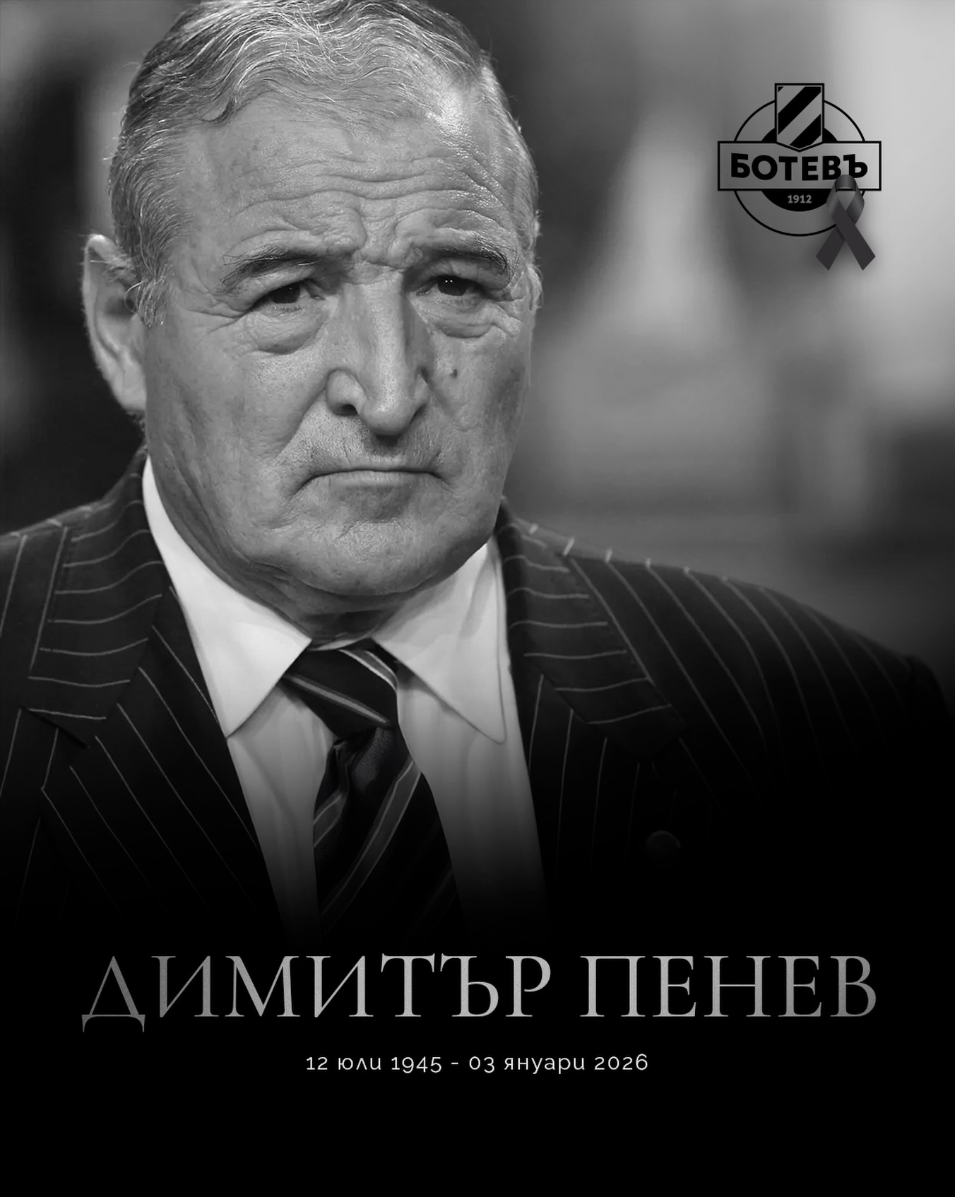 293 Тъжен ден за българския футбол! Това написаха от ПФК Ботев: Напусна ни треньор номер 1 на България за ХХ век – Димитър Пенев. През юли Стратега, който изведе България до най-големия успех във футболната ни история, навърши 80 години. ПФК Ботев Пловдив изказва искрените си съболезнования към близките и роднините на легендарния Димитър Пенев. Почивай в мир, Легендо! Може да ви хареса също Министър Иван Христанов: Продажбата на хижа Петрохан е извършена в необичайно къс срок Гюров: Темата за високите сметки за ток и поскъпването на водата се използва за политически внушения Министър Иван Христанов е сигнализирал премиера за заплаха за националната сигурност Андрей Гюров свика среща с трима министри заради сметките за ток и цената на водата