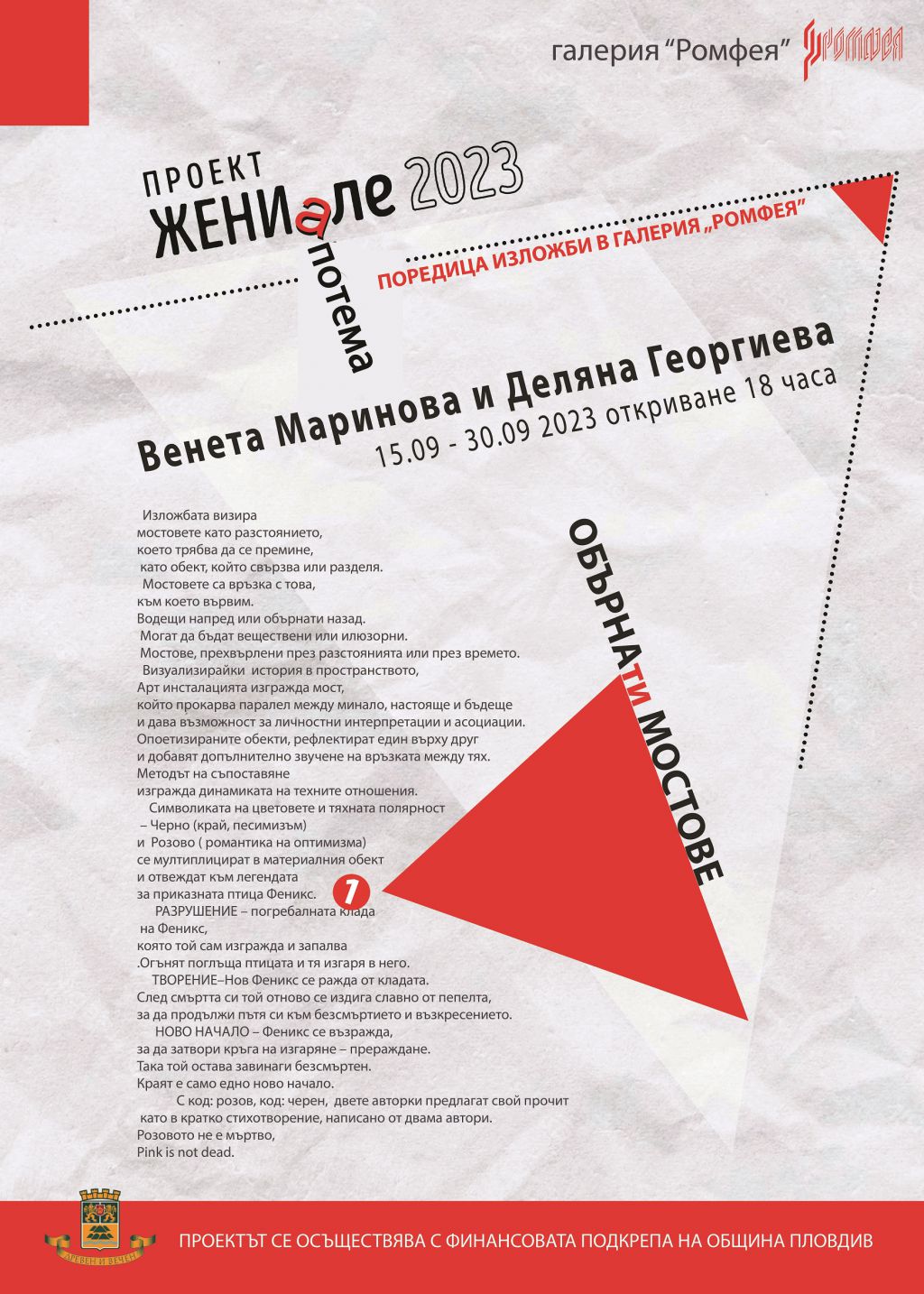 157 Първото издание на проект „ЖЕНИале“ ще се проведе от 15 септември до 11 ноември в галерия „Ромфея“. Добре познатите и обичани Венета Маринова, Надя Генова и Албена Михайлова – Бенджи ще представят три отделни артистични акции. Авторките, които са част от култовата група „Жените на Ръб-а“ (създадена от Албена Михайлова, Венета Маринова, Моника Роменска, Надя Генова), ще работят в творчески тандем с Деляна Георгиева, Севдалина Кочевска и Елица Рива. „ЖЕНИале“ е проект на СД „Ромфея-Ватев и с-ие“ и се финансира от община Пловдив като част от Културния календар на града за 2023 година. Темата на първото издание е „АПОТЕМА“.Чрез това понятие от геометрията, с което се бележи разстояние, художничките изследват идеята за дистанцията и отстоянието на обекти, състояния и действия от техния източник и как това ги определя или променя, погледнато през призмата на визуалното изкуство и музиката. Чрез използването на различни медии, нещо изключително характерно в работата на авторките през годините – видео, обект, пърформанс, звук и светлина, се формира нова действителност, която чертае пред зрителя различни времеви и пространствени граници. Първото събитие по проекта носи заглавието „Обърнати мостове“. Представлява изложба-арт инсталация на Венета Маринова и Деляна Георгиева. Откриването е на 15 септември от 18.00 часа в галерия „Ромфея“, като в рамките на изложбата ще се проведе и уъркшоп. Закриването е на 30 септември. „Изложбата- арт инсталация визира мостовете като разстоянието, което трябва да се премине, като обект, който свързва или разделя. Мостовете са връзка с това, към което вървим. Водещи напред или обърнати назад. Могат да бъдат веществени или илюзорни. Мостове, прехвърлени през разстоянията или през времето. Визуализирайки история в пространството, арт инсталацията изгражда мост, който прокарва паралел между минало, настояще и бъдеще и дава възможност за личностни интерпретации и асоциации. Опоетизираните обекти рефлектират един върху друг и добавят допълнително звучене на връзката между тях. Методът на съпоставяне изгражда динамиката на техните отношения. Символиката на цветовете и тяхната полярност – Черно (край, песимизъм) и Розово ( романтика на оптимизма) се мултиплицират в материалните обекти и отвеждат към легендата за приказната птица Феникс и преминаването през РАЗРУШЕНИЕ – погребалната клада, която сам изгражда и запалва.Огънят поглъща птицата и тя изгаря в него. ТВОРЕНИЕ – нов Феникс се ражда от кладата. След смъртта си той отново се издига славно от пепелта, за да продължи пътя си към безсмъртието и възкресението. НОВО НАЧАЛО – възражда се, за да затвори кръга на изгаряне – прераждане. Така остава завинаги безсмъртен“, разказват детайли от концепцията си авторките Венета Маринова и Деляна Георгиева. С код „Черен“ и код „Розов“, двете художнички предлагат свой прочит на пространството, прокарвайки мост между двата полюса. Общият дух в арт инсталацията се допълва от синтеза на опоетизиране и визуализация, като в кратко стихотворение в стил „Тан-ренга“ – вид кратко стихотворение, написано от двама автори. Може да ви хареса също Премиера в Драматичен театър Пловдив – „Дреднаути. Пиеса за женска публика“ AL BANO: Да пея на сцена като Античния театър в Пловдив е чест и вдъхновение Ансамбъл „Тракия“ с нов м