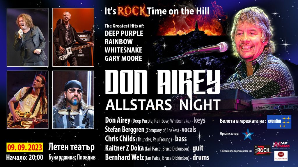 160 „Когато голяма британска хард-рок или хеви-метъл банда се нуждаеше от клавирист на гениално ниво, те знаеха, че могат да повикат Дон Еъри. Той е човекът, когото Black Sabbath и Rainbow наеха през седемдесетте, за да им помогне с албуми като „Never Say Die” и „Down To Earth”. През 80-те Ози Озбърн го привлича, за да довърши Blizzard of Ozz. През следващите години Дон Еъри е с Judas Priest , Брус Дикинсън от Iron Maiden, Whitesnake, Jethro Tull, Brian May, UFO, Gary Moore и много, много други”. Това е само част от визитката на рок легендата, която идва за концерт у нас в Пловдив на 9 септември, събрана от престижното издание „Rolling Stone”. Дон Еъри е наистина голямо име сред култовите банди, белязали златната ера на рока. Но нищо не свършва до там. В последните повече от 20 години Дон Еъри е неизменна част от състава на великаните Deep Purple, поел щафетата от Jon Lord през 2002 г. Защо всички обичат Дон и защо концертът му в Пловдив на 9 септември ще бъде коренно различно преживяване от всяко друго рок събитие у нас? На първо място – това със сигурност не е поредният Purple концерт! Проектът му Don Airey Allstars Night, с който идва в България, е всъщност пътуване – екстремно и нахъсано през любими на поколения фенове парчета. „Ще свирим най-доброто от WHITESNAKE, Gary Moore, RAINBOW, JUDAS PRIEST…”, подсказа самият Еъри в обръщение към българската публика седмици преди концерта. Всичко, което ще прозвучи в Летния театър на „Бунарджика”, са титанични рок хитове, в записването на които Дон има пряко участие, включително и като съавтор. В сета са включени и неща на Ozzy Osbourne, с когото Еъри прави албуми като Blizzard Of Ozz и Bark At The Moon. Е, в Пловдив „дори може да направим и няколко парчета на DEEP PURPLE”, подхвърля с характерния си английски хумор Еъри. Момчето от Съндърланд – Доналд Смит Еъри, преминава през шеметна въртележка от рок групи и изпълнители, които търсят именно него за записи или участия в световни турнета. Макар в детските си години да се вижда по-скоро като джаз пианист и да свири в училищна група, той също толкова отрано се сблъсква с енергията, която носи рокендрола. Втрещен е от ефекта, често граничещ с истерия, с който още ранните рок изпълнители като Бил Хейли и Елвис Пресли взривяват публиката. Признава обаче, че „един ден животът се промени, когато излезе сингълът на Бийтълс „Please Please Me“. Следват години на учене на литература и музика, свирене с различни групи, запознанства и приятелства, продължили десетилетия – с Бърни Марсдън(Whitesnake), Гари Мур. С последния участват в общ проект на Андрю Лойд Уебър (албума Variations, 1978). Същата година записват и първия солов албум на Гари Мур „Out In The Fields“. Пиковите години на хардрока и метъл рока са наистина шеметни за Дон Еъри – като част от студийни записи и турнета на BLACK SABBATH, RAINBOW, Gary Moore, Ozzy Osbourne, WHITESNAKE, JUDAS PRIEST, JETHRO TULL, ELO, Uli Jon Roth, Graham Bonnet и много, много други. Именно в този период Дон Еъри записва името си в рок историята като пряк участник в култови албуми, сред които: „Never Say Die“( Black Sabbath, 1978), „Down To Earth”(Rainbow, 1979), „Blizzard Of Ozz”(1980) и „Bark At The Moon”(1983) на Ози Озбърн, едноименния албум на Whitesnake от 1987, също и „Still Got The Blues“(1990), отново на Гари Мур, и още и още… Именно това богатство на рока очаква българските фенове на концерта в Пловдив на 09.09 на хълма „Бунарджика”. Магичният импровизатор на клавишните пристига в града на тепетата още на 7 септември и обещава паметна рок вечер. „Be There or Be Square!”, провокира Дон Еъри родната публика. Концертът D