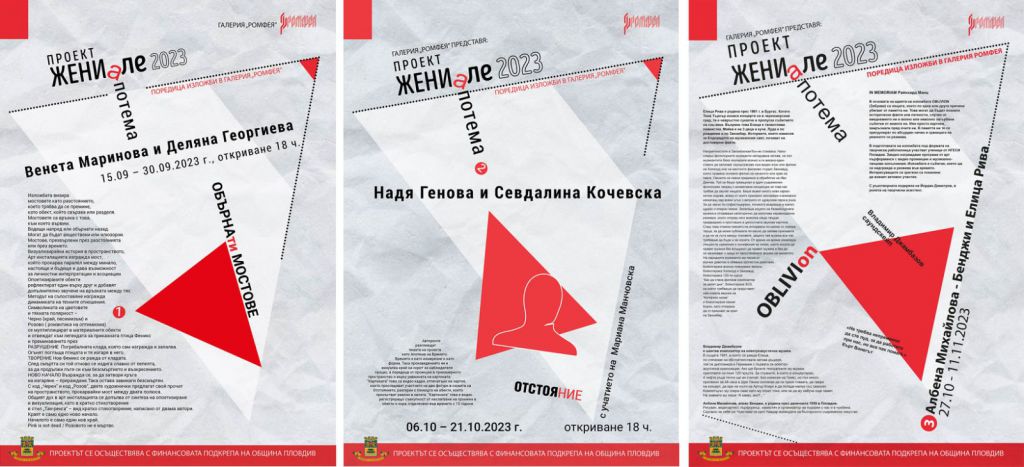 172 „ЖЕНИале“ е името на новия проект на добре познатите художнички Венета Маринова, Надя Генова и Албена Михайлова – Бенджи от Жените на Ръб-а“. Първото издание ще се проведе от 15 септември до 11 ноември 2023г. в галерия „Ромфея“ и включва три отделни артистични акции. Авторките ще работят в творчески тандем с Деляна Георгиева, Севдалина Кочевска и Елица Рива. „ЖЕНИале“ е проект на СД „Ромфея-Ватев и с-ие“ и се финансира от община Пловдив като част от Културния календар на града за 2023 година. Темата, по която са избрали да работят Венета Маринова, Надя Генова и Албена Михайлова – Бенджи е „АПОТЕМА“. (Понятие от геометрията, с което се бележи разстояние). Чрез него художничките изследват идеята за дистанцията и отстоянието на обекти, състояния и действия от техния източник и как това ги определя или променя, погледнато през призмата на визуалното изкуство и музиката. Чрез използването на различни медии, нещо изключително характерно в работата на авторките през годините – видео, обект, пърформанс, звук и светлина, се формира нова действителност, която чертае пред зрителя различни времеви и пространствени граници. На 15 септември от 18.00 часа в галерия „Ромфея“ е първата артистична акция по проекта със заглавие „Обърнати мостове“. Освен изложба-арт инсталация на Венета Маринова и Деляна Георгиева, ще се проведе и уъркшоп. Закриването е на 30 септември. Второто събитие се казва „Отстояние“ и е на Надя Генова и Севдалина Кочевска. Откриването е на 6 октомври от 18 часа. В него авторките разглеждат темата на проекта като Апотема на Времето. Времето – и като измерение, и като форма. Третата артистична акция е изложбата „Oblivion/Забрава“ на Албена-Бенджи Михайлова и Елица Рива. Представлява изложба-арт инсталация с пърформативни представяния и видео прожекции. Откриването е на 27 октомври от 18 часа в галерия „Ромфея“, (закриване 11.11.2023). Посветено е на Райнхард Манц (28.09.1951 -29.12.2022). Подготовката и уъркшопа са от 23.10. до 26.10.23. Съществена част от проект „Oblivion/Забрава“ е творческата работилница с ученици от НГСЕИ в Пловдив. В артистичната акция ще видим съвместната работа на Албена-Бенджи Михайлова с Елица Рива, пиано /текстове, Владимир Джамбазов, аудио композиции / саундскейп и учениците от Националната гимназия по екранни и сценични изкуства, Пловдив. Зрители и посетители ще имат възможност да вземат активно участие в трите акции! Може да ви хареса също Премиера в Драматичен театър Пловдив – „Дреднаути. Пиеса за женска публика“ AL BANO: Да пея на сцена като Античния театър в Пловдив е чест и вдъхновение Ансамбъл „Тракия“ с нов мащабен спектакъл, вдъхновен от река Марица България с пълен национален отбор за Европейското първенство по стрелба с лък в Пловдив