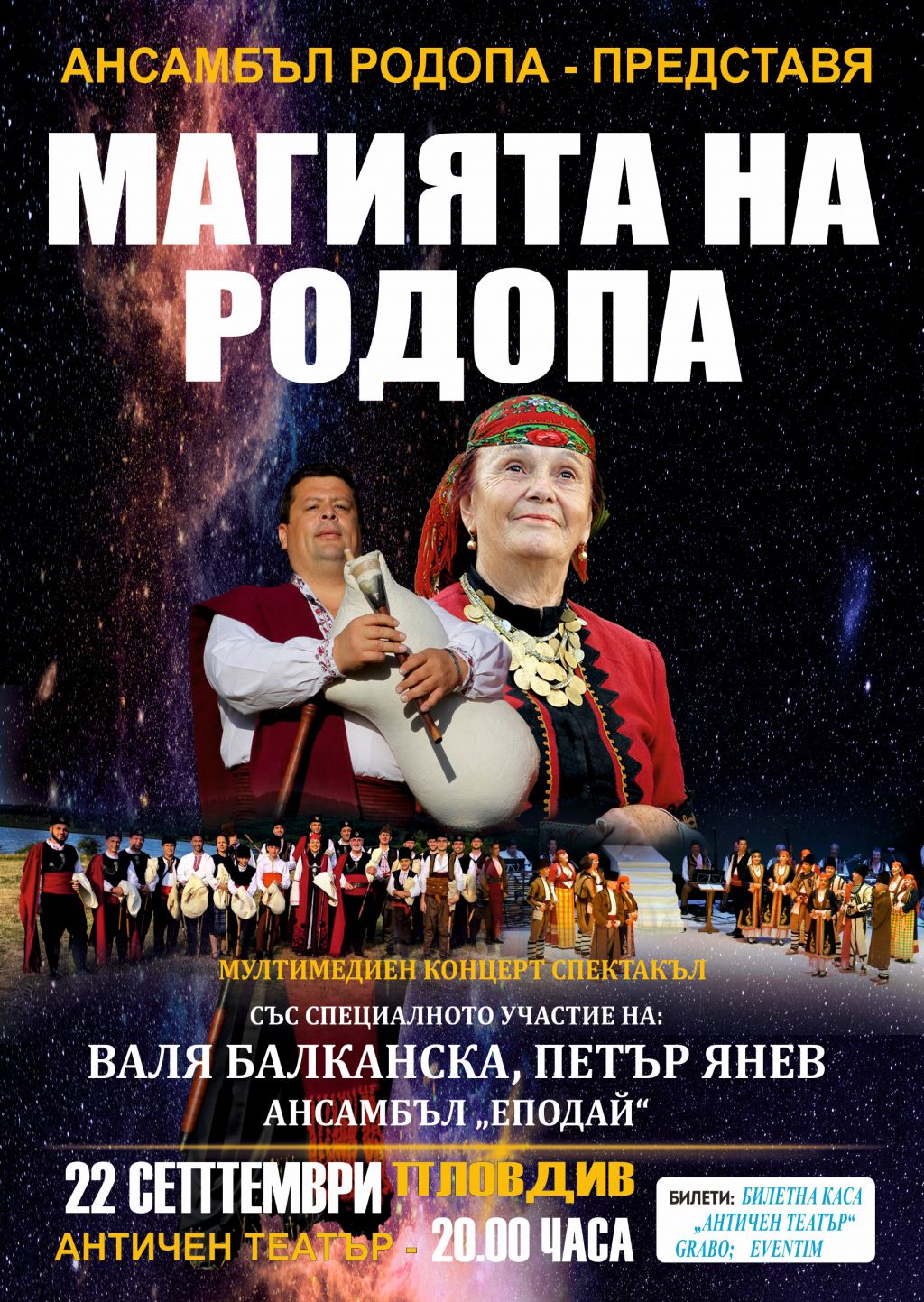 130 В деня, в който България ще отбележи 115 години от Независимостта си, ансамбъл за народни песни и танци „Родопа“ Смолян ще потопи пловдивчани и гостите на града в Магията на Родопа планина. На сцената на Античния театър творците от ансамбъла ще пресъздадат емблематични фолклорни мотиви като Предой, Гурбетчии, Керкели, Невястата и други. „Магията на Родопа“ е поклон и към необятния талант на Космическата Валя Балканска и гайдаря Петър Янев. В мултимедийния спектакъл ще вземе участие гайдарският ансамбъл „Еподай“. Режисьор на спектакъла и водещ е главният художествен ръководител на ансамбъл „Родопа“ Адриан Петров. Билети могат да бъдат закупени на касите на Ивентим и онлайн, a също така и от Грабо Може да ви хареса също Археологическият музей представя обновената си постоянна експозиция и нововъведения аудиогид Читалище „Шалом Алейхем – 1945“ – Пловдив открива модерен Дигитален клуб Водещият театрален режисьор Диана Добрева поставя „Вълшебната флейта“ от Моцарт в Опера Пловдив Пиратски уикенд очаква децата на Пловдив в Природонаучния музей