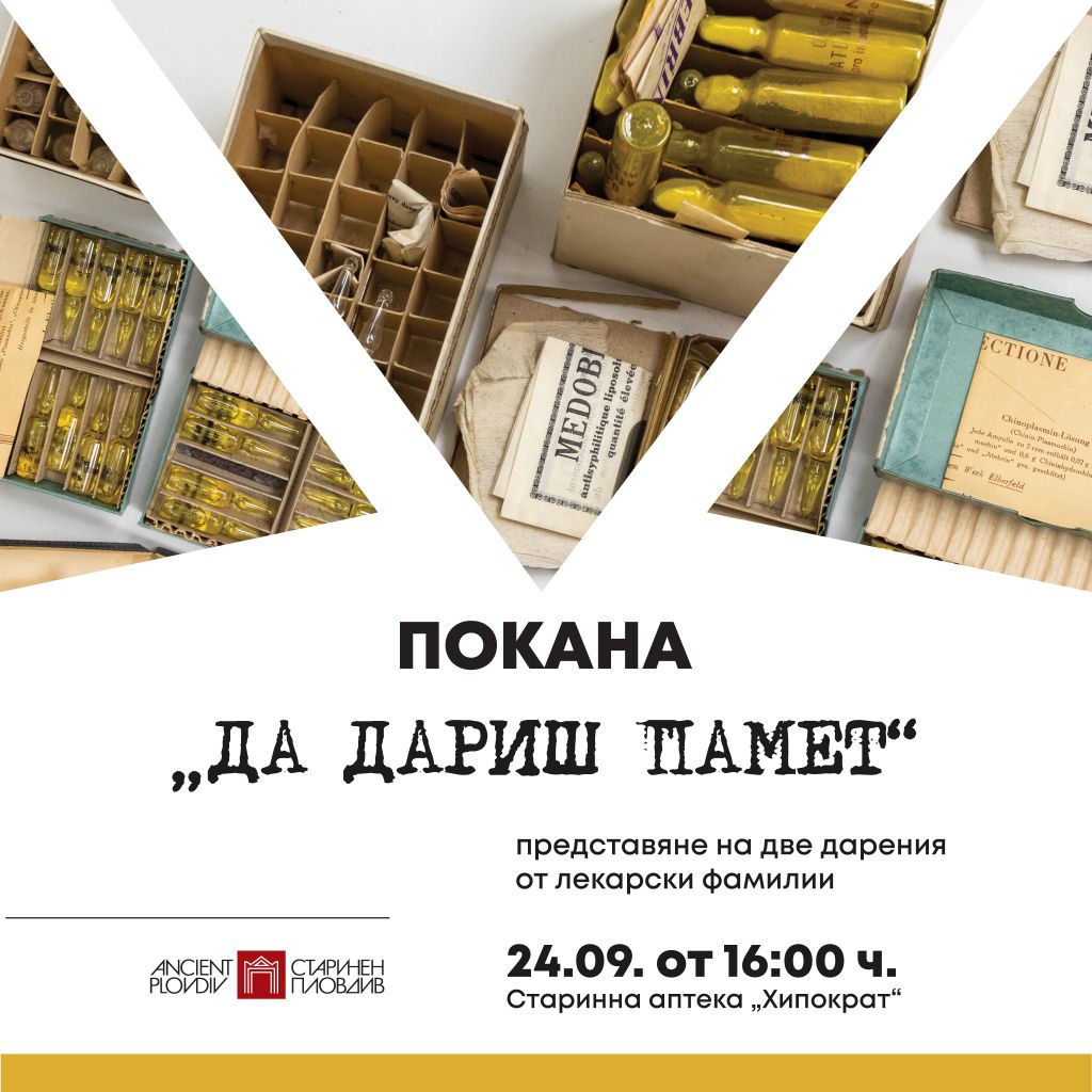 142 Общински институт „Старинен Пловдив” кани пловдивчани и гости на града на 24 септември (неделя) от 16:00 ч. в Музейна аптека „Хипократ”, където ще бъдат представени за първи път нови и ценни експонати, дарени от две известни лекарски фамилии. Проектът „Да дариш памет” е част от програмата на „Празници на стария град“ 2023 и се осъществява във връзка със Световния ден на дарителството и Европейските дни на наследството. Първото дарение, обогатяващо фонда на музейната аптека е от наследниците на д-р Стоил Попов – съградил и управлявал първата модерна частна акушеро-гинекологична болница в Пловдив, проектирана от арх. Чинков (днес болница „Тримонциум”). Д-р Попов завършва медицина в Германия, участва в двете световни войни и има забележителен професионален път. Другото дарение е от наследниците на д-р Тодор Николов Танков – учил медицина в Лозана, Монпелие и Неапол, работил в Кайро и Конго, участник в Първата и Втората световни войни. Екипът на ОИ „Старинен Пловдив“ изразява огромна благодарност към наследниците от двете лекарски фамилии за даренията в полза на Музейна аптека „Хипократ”. Идеята на проекта „Да дариш памет” е чрез възобновяване на спомена за видните лекари и времената, в които са живели и работили, не просто ще се оживи паметта, но и посетителите да имат възможност чрез предметите да преминат през знакови исторически моменти и ярки следи на национална памет. Може да ви хареса също Премиера в Драматичен театър Пловдив – „Дреднаути. Пиеса за женска публика“ AL BANO: Да пея на сцена като Античния театър в Пловдив е чест и вдъхновение Ансамбъл „Тракия“ с нов мащабен спектакъл, вдъхновен от река Марица България с пълен национален отбор за Европейското първенство по стрелба с лък в Пловдив