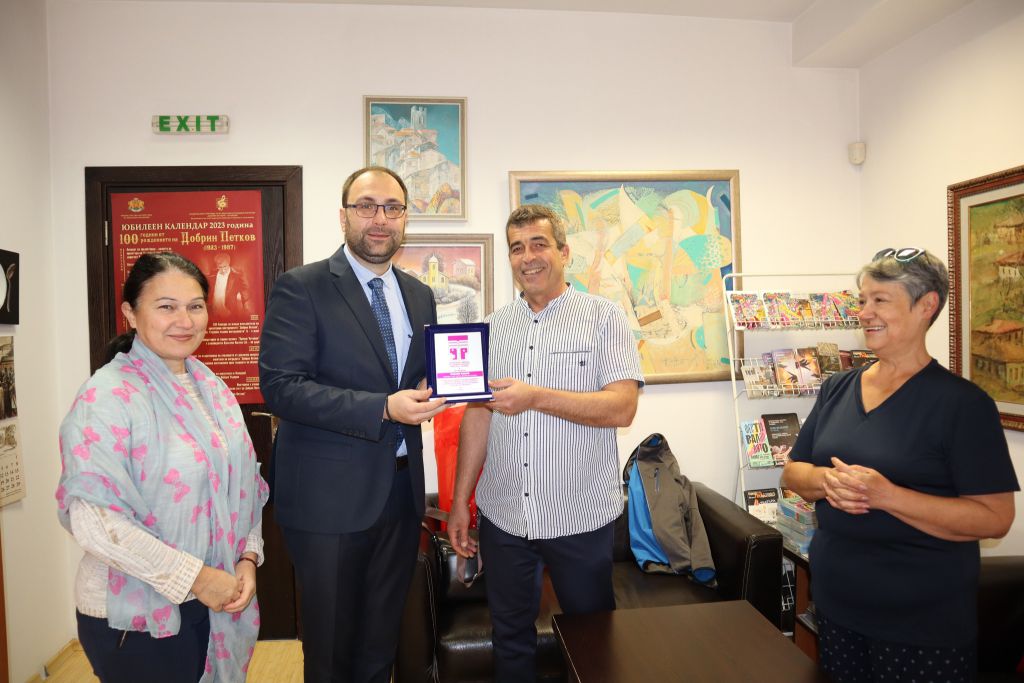 259 Директорът на Националната гимназия за сценични и екранни изкуства в Пловдив – Николай Томов, придружаван от Ваня Бетуховска – зам.-директор по учебната дейност и Паулина Алексиева – доскорошен зам.-директор на гимназията, посетиха изненадващо днес заместник-кмета по култура, археология и туризъм на община Пловдив – Пламен Панов в кабинета му в ДК „Борис Христов“. Целта на визитата, която искрено развълнува заместник-кмета, бе да изкажат своята благодарност към него за подкрепата му – лична и институционална към дейността, каузите и изявите на училището през изминалите четири години от мандата. Пламен Панов бе удостоен с Почетен плакет на НГСЕИ – Пловдив, на който пише: „В знак на благодарност за дългогодишната подкрепа, отличното институционално партньорство и лични заслуги за издигане имиджа на гимназията“. Видимо развълнуван, трогнат и с благодарност за високата оценка и жеста, заместник-кметът получи още живописна картина, нарисувана специално за повода от Николай Томов, озаглавена „Приказка“ с надпис „За Пламен Панов от един добър приятел от сърце!“ , както и бутилка бутиково червено вино. Историята на Националната гимназия за сценични и екранни изкуства в Пловдив, създадена през есента на 1975 година като ССХУ за Сценични кадри, е белязана с високи постижения както като учебна институция – много от завършилите ученици са вече утвърдени творци в различни сфери на сценичните и визуални изкуства, така и като творчески постижения в реализирането на проекти в професионални творчески институти – театър, опера и кино. Едно от много ценните неща, с които училището се гордее е, че в него цари дух на разбирателство, толерантност, коректност, дух на свобода – неотменен елемент от сложния път на изкуството. Може да ви хареса също Премиера в Драматичен театър Пловдив – „Дреднаути. Пиеса за женска публика“ AL BANO: Да пея на сцена като Античния театър в Пловдив е чест и вдъхновение Ансамбъл „Тракия“ с нов мащабен спектакъл, вдъхновен от река Марица България с пълен национален отбор за Европейското първенство по стрелба с лък в Пловдив