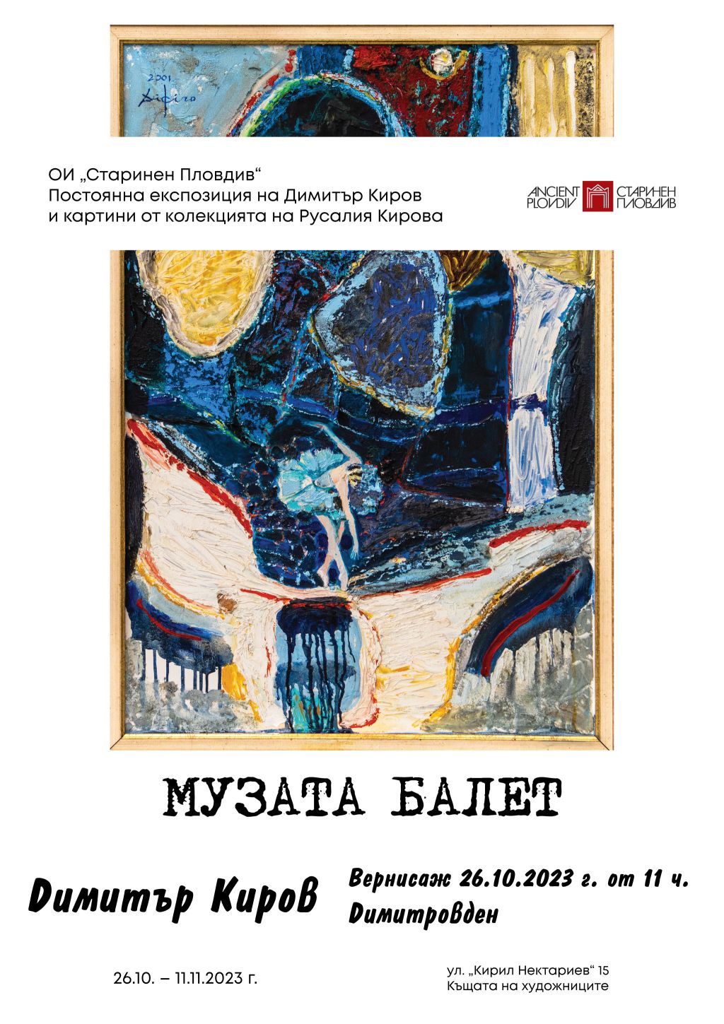 132 Краят на октомври винаги е бил специален за Димитър Киров – големият художник отбелязваше имения си ден с изложба. Пазейки тази традиция, утре, 26 октомври 2023 г. (четвъртък) от 11:00 ч., точно на Димитровден, екипът на ОИ „Старинен Пловдив“ кани на официалното откриване на „Музата балет“ – изложба с творби на Ди Киро в къща на Верен Стамболян (постоянна експозиция на Димитър Киров на ул. „Кирил Нектариев“ 15). Фокус на изложбата е любимата тема и вдъхновение на Димитър Киров – балетното изкуство. По покана на съпругата му Русалия Кирова уредникът на къща на Верен Стамболян – Ангелина Янакиева, подбра от ателието му прекрасни живописни платна от различни периоди на творчеството му, посветени на балета. Изложбата може да бъде разгледана от 26 октомври до 11 ноември 2023 г. Може да ви хареса също Нова галерия за съвременно изкуство отвори врати в Пловдив Най-малката маймунка в света пристигна в Регионалният природонаучен музей – Пловдив Кметът на район Източен Емил Русинов награди призьорите в конкурса Коледни чудеса Остават броени дни до крайния срок за кандидатстване за куратор на Национални есенни изложби 2026 – Пловдив