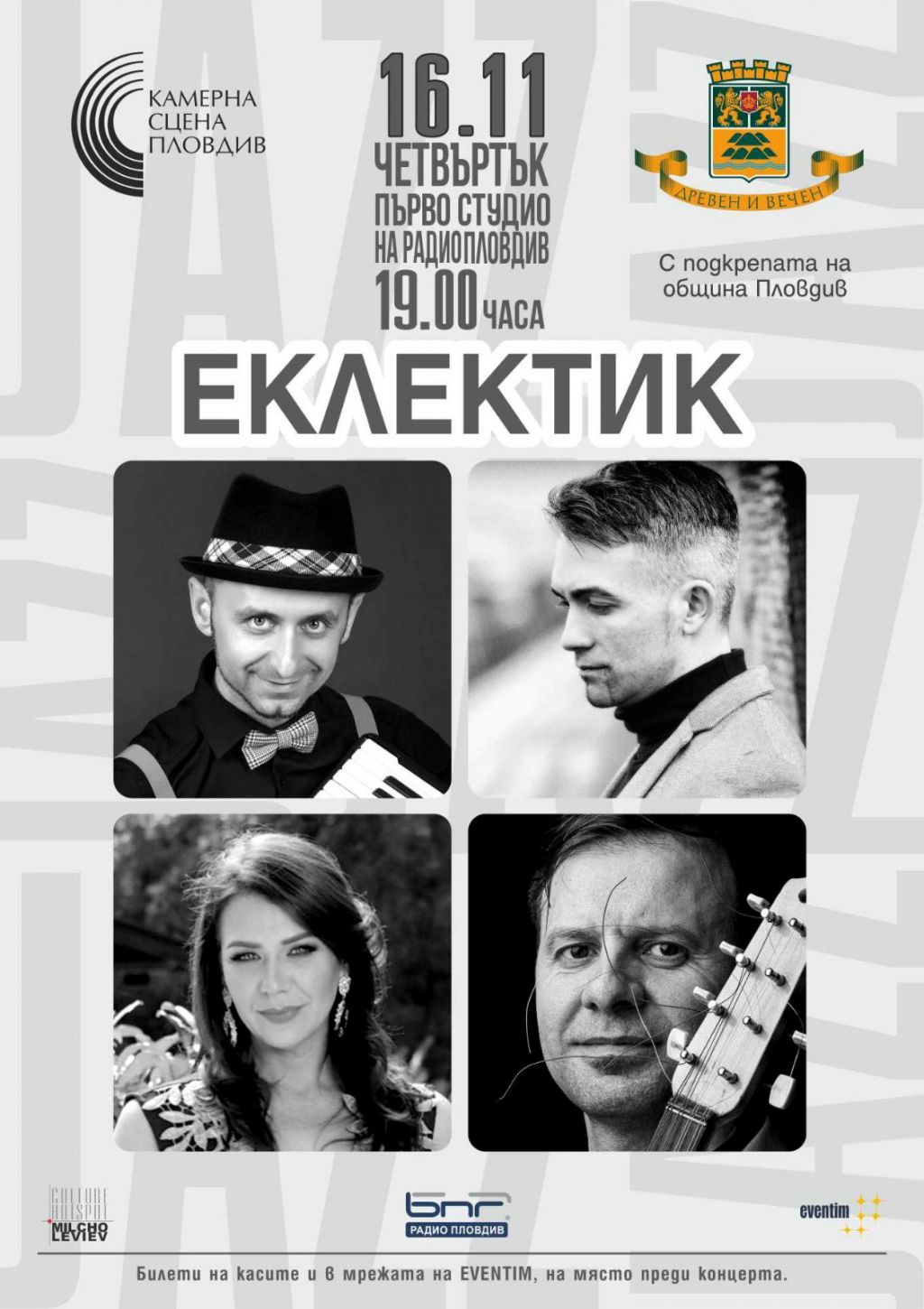 165 Най-новият концертен формат „Еклектик“ на Калоян Куманов е създаден специално за заключителното събитие на платформата “Камерна сцена Пловдив“ за 2023г. и ще бъде представен за първи път пред пловдивска публика. На 16 ноември, от 19ч., в Първо студио на Радио Пловдив ни очаква една прекрасна музикална вечер с „Квартет с Калоян Куманов“. На сцената излиза един от най-атрактивните и успешни акордеонисти у нас Калоян Куманов, който споделя музикалните си идеи с Юлиан Янев-пиано, кийборд, Надя Казакова – вокал и Владимир Владимиров – тамбура. Компилираните музикални стилове в „Еклектик“ ще ни поведат по пътя на Барока, блуса и мистичния български фолклор, като именно това нехарактерно музикално разнообразие е заявка за силната вибрацията в интерпретациите на артистите, мултиплицирано в едно различно душевно преживяване. Калоян Куманов е известен на съвременната българска сцена с оригиналните си проекти и превъплъщения. „Еклектик“ не прави изключение, като и тук артистът остава верен на себе си в един безкомпромисен творчески подход, споделен с едни от най-изтъкнатите имена на родната ни музикална сцена. Юлиан Янев е един от доказаните пианисти в българската музикална сцена, част от големи музикални формати, като „Гласът на България“, дългогодишен музикант, композитор и аранжор на едни от най-известните поп и джаз изпълнители в България. Надя Казакова е сред най-известните изпълнители на фолклорна музика с впечатляващ музикален път. Солист на НФА „Филип Кутев“, след това е част от петорката “5 Stars”, в момента има забележителна музикална солова кариера, също така е солист в ансамбъла на „Трудови войски“ – София. Проф. Владимир Владимиров – изтъкнат наш тамбурист и педагог, преподавател в АМТИИ „Проф.Асен Диамандиев“ гр.Пловдив и диригент на „Академичния народен оркестър“. „Камерна сцена Пловдив“ се осъществява с подкрепата на община Пловдив и е част от Културния календар на града за 2023 година. Билети се продават в цялата мрежа на Ивентим.бг, на каси и онлайн, както и на място преди концерта. За ценителите на стойностната музика името „Камерна сцена Пловдив” е значещо. Класическа музика, джаз, етно, фолклор, кино- и театрална музика – стремежът е да бъдат задоволени и провокирани естетическите вкусове на възможно най-широка аудитория. Така обяснява целите на проекта авторът му Петър Салчев. В концертите през годините са участвали утвърдени имена от българската, европейската и световна музикална сцена. „Камерна сцена Пловдив“ работи активно и в посока на младите творци и изпълнители, давайки им възможност да се представят на голяма сцена. Традиционен домакин на концертите от „Камерна сцена Пловдив“ е Първо студио на Радио Пловдив. Проектът се финансира от Община Пловдив. Може да ви хареса също AL BANO: Да пея на сцена като Античния театър в Пловдив е чест и вдъхновение Ансамбъл „Тракия“ с нов мащабен спектакъл, вдъхновен от река Марица България с пълен национален отбор за Европейското първенство по стрелба с лък в Пловдив Регионален етнографски музей – Пловдив с работилници за мартеници