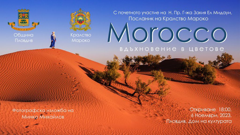 157 Община Пловдив и Посолството на Кралство Мароко в България имат удоволствието да поканят пловдивчани и гостите на града на 6 ноември, понеделник, от 18:00 часа в Дом на културата „Борис Христов“ на вълнуващо, виртуално пътуване из северноафриканската държава. Събитието ще бъде открито от Нейно Превъзходителство г-жа Закия Ел Мидауи, Посланик на Кралство Мароко. Посетителите ще могат да се докоснат до традициите и културата на Кралство Мароко като опитат от специалитетите на мароканската кухня и мароканския чай – запазена и до днес вековна традиция, както и да се запознаят с типичните марокански женски костюми – Кафтани. Тези ръчно ушити приказни одежди, които мароканските жени носят само на специални поводи, ще бъдат представени от момичетата на Фолклорен танцов ансамбъл „Дилянка“. Освен да се докоснат до мароканската кухня и традиции, гостите ще могат да се насладят на изложбата на известния пловдивски фотограф Мино Михайлов „Мароко – вдъхновение в цветове“. Кадрите в експозицията са заснети в период от 10 години и включват пейзажи, портрети, архитектура и улични сюжети. Представените фотоси ще срещнат посетителите с колоритни хора и впечатляващи места от Кралство Мароко. Пречупени през погледа на фотографа Минко Михайлов, те предават духа на тази екзотична северноафриканска страна. В експозицията има включени непоказвани кадри пред пловдивската публика от последното му пътешествие през 2023. Може да ви хареса също Премиера в Драматичен театър Пловдив – „Дреднаути. Пиеса за женска публика“ AL BANO: Да пея на сцена като Античния театър в Пловдив е чест и вдъхновение Ансамбъл „Тракия“ с нов мащабен спектакъл, вдъхновен от река Марица България с пълен национален отбор за Европейското първенство по стрелба с лък в Пловдив