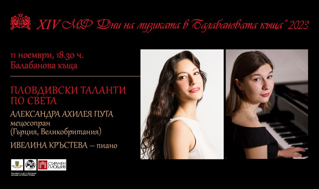 145 На 8 и 11 ноември Международният фестивал “Дни на музиката в Балабановата къща” представя изключителни музиканти с респектираща международна кариера на сцената на емблематичната Балабанова къща. За двата концерта от различни краища на света пристигат Ержан Кулибаев – един от най-изтъкнатите цигулари от новото поколение, лауреат на конкурсите “Виенявски”, на цигулковите надпревари в Манхатън, Берлин, Лисабон, Буенос Айрес; гръцкото мецосопрано Александра Ахилея Пута – двукратен финалист от конкурса “Мария Калас” – Атина; именитите пианистки Виктория Василенко – лауреат на Първа награда от международния конкурс „Джордже Енеску” (Букурещ, Румъния), от клавирния конкурс-фестивал „Музикални четвъртъци” (Женева, Швейцария) и Ивелина Кръстева – пловдивската гордост в концерта, която от години гради успешна кариера във Великобритания. Международният фестивал “Дни на музиката в Балабановата къща” – носител на лейбъл “Европейски фестивал” на Европейската фестивална асоциация – е част от Календара на културните събития на Община Пловдив и се осъществява с подкрепата на Община Пловдив, Министерство на културата, Фондация “Музикартисимо”, НФК и др. Билети онлайн в мрежата на Ивентим.бг и на място преди концертите. Ержан Кулибаев (цигулка) твърдо се налага като един от най-вълнуващите и талантливи млади концертиращи солисти днес. Спечелил наградата S&R Washington за 2015, той е лауреат и на международните цигулкови конкурси „Виенявски” и „Джордже Енеску”, както и носител на първа награда от международните конкурси Демидовски, Лисабон, Новосибирск, Хиндемит, Буенос-Айрес. Наскоро той получи първа награда с отличие на Първия международен музикален конкурс в Манхатън и Златен медал на Първия международен музикален конкурс в Берлин – 2017. Концертните му ангажименти включват солови дебюти в престижни концертни зали като Berliner Philharmonie, Carnegie Hall Stern Auditorium в Ню Йорк, Mariinsky Theatre Concert Hall в Санкт Петербург, St. James Church Piccadilly в Лондон, Auditorio Nacional в Мадрид, Sony Center for Performing Arts в Торонто, Концертхаус в Берлин, Опера Бастилия в Париж, Театро Колон и Театър Гран Рекс в Буенос-Айрес, Аудиторио де Тенерифе. Свирил е с много световноизвестни оркестри, като Berliner Symphoniker, Poznan Philharmonic Orchestra, Sinfonia Iuventus Warsaw, Кралски камерен оркестър на Валония, Royal Camerata Orchestra, Amadeus Chamber Orchestra на Полското радио, Orquesta Sinfónica de Tenerife, Симфоничния оркестър на Кастилия и Леон, Камерният оркестър на Московската филхармония, Камерният оркестър на Държавната капела на Санкт Петербург и др.. Работил е с артисти като Валери Гергиев, Владимир Ашкенази, Давид Герингас, Максим Венгеров, Джания Аубакирова, Шломо Минц и мн.др. В момента Ержан Кулибаев заема преподавателска позиция в гимназията по музика „Катарина Гурска” в Мадрид. Изявеният артист е подкрепен от „Talent Unlimited“ Виктория Василенко (пиано) завършва магистърска степен в Брюкселската Музикална Академия при проф. Боян Воденичаров. Носител е на „Кристална Лира“ за млад изпълнител за концертните сезони 2007-2008 и 2011-2012. През 2009 става Лауреат на Голямата награда на фондация „Д. Бербатов” за върхови постижения в областта на изкуствата. Виктория печели Първа награда на международния конкурс „Джордже Енеску” (Букурещ, Румъния), победител е на клавирния конкурс-фестивал „Музикални четвъртъци” (Женева, Швейцария) и носител на престижната награда