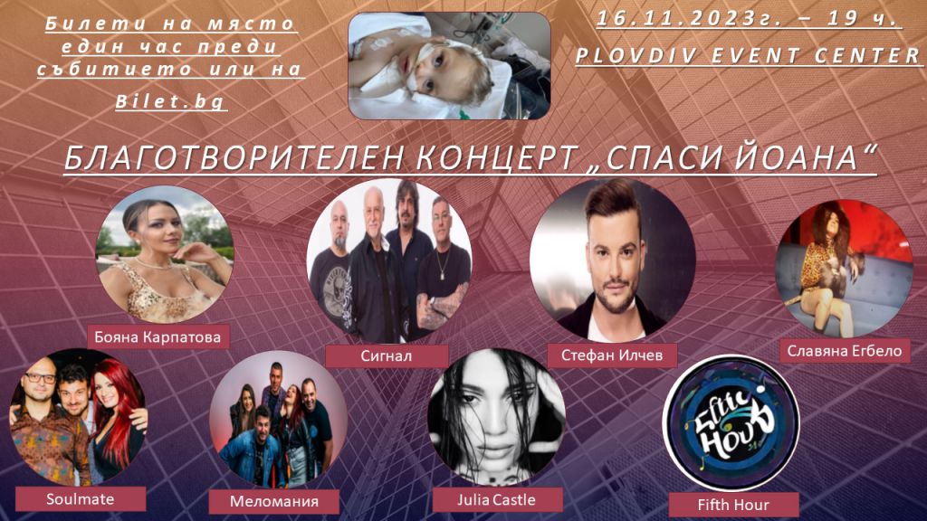 182 На 16 ноември 2023 г. от 19.00 часа в Plovdiv Event Center ще се състои благотворителен концерт „Шанс за бебе Йоана“/ „Спаси Йоана“ с участието на групите Меломания, Soulmate, Сигнал, както и соловите изпълнители Стефан Илчев и Славяна Егбело, които обещават да създадат такава магия на сцената, която ще остави публиката без думи! Всички средства, събрани от билетите и даренията, ще бъдат използвани за подкрепа на бебе Йоана. Не пропускайте тази невероятна възможност да съчетаете удоволствие и благотворителност. „16 ноември 2023 г. е денят, в който Пловдив ще се превърне в музикално убежище, благодарение на Plovdiv Event Center, които ни предоставят залата, както и на изпълнителите, които подкрепят каузата ни. Молим ви, помогнете на една майка да даде детство на дъщеря си!“, апелират организаторите на концерта. Билети може да закупите като използвате линка: https://bilet.bg/bg/events/spasenie-za-bebe-ioana-4439-4439 или на място, час преди събитието. Повече информация за каузата https://pavelandreev.bg/campaign/shans-za-bebe-ioana?fbclid=IwAR3CPRS52dLM_LnmVO5UWxZxRhYCB7DQ9WxUeRTUFT1J4_rtfKW9oaGvyhg https://www.facebook.com/groups/153176095316323 Може да ви хареса също Рекорден брой участници на V-тия Национален младежки театрален фестивал „Малката Мелпомена“ в Пловдив Мъжете предпочитат да излъжат с Йоана Буковска и Димо Алексиев гостува в Пловдив през май България пее събира 19 хора в Пловдив за десето юбилейно издание и век хорова традиция Пловдив пулсира от днес в ритъма на Plovdiv Vibes – Интеракции 2026