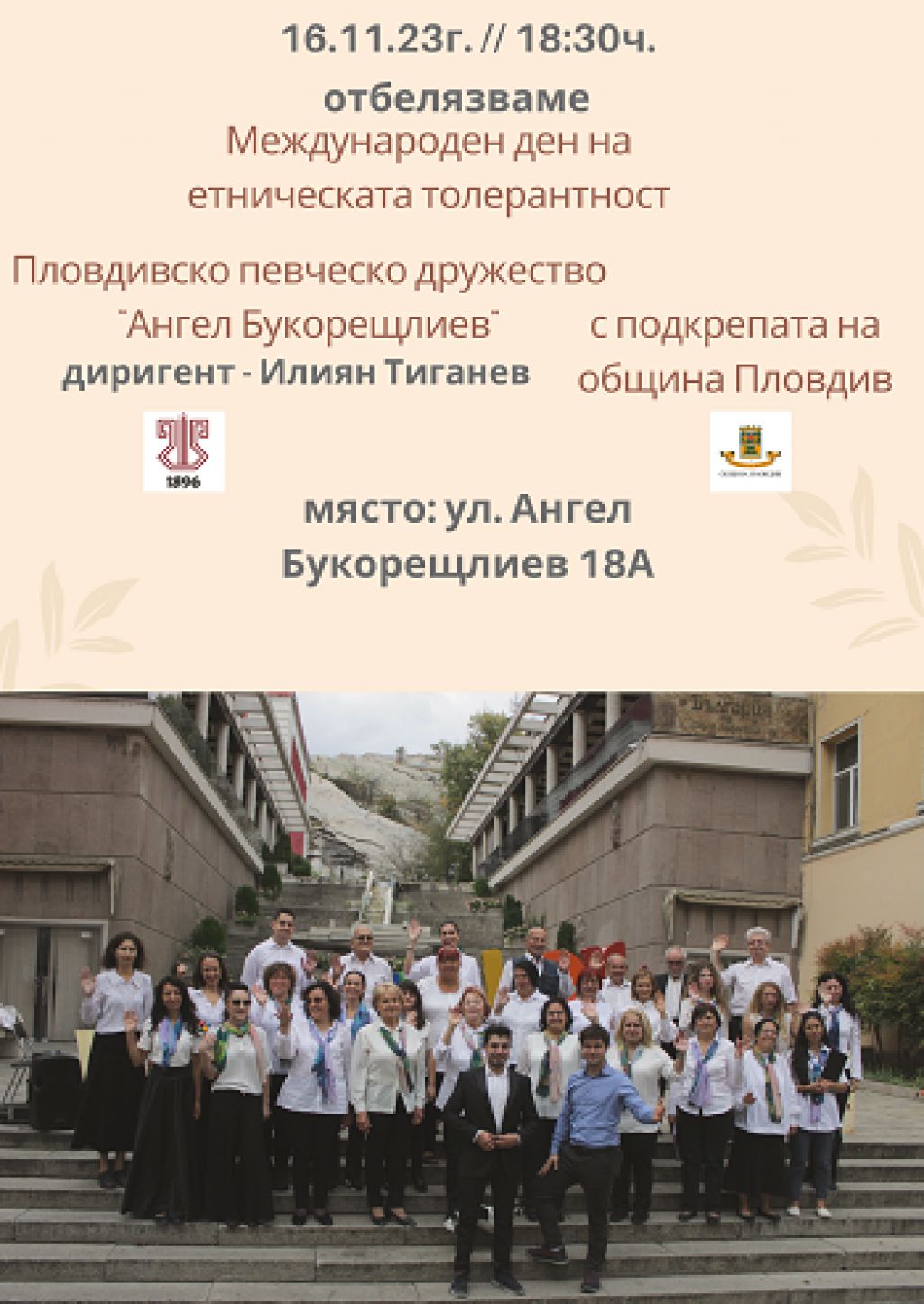 284 Пловдивското певческо дружество „Ангел Букорещлиев“ ще отбележи Международния ден на етническата толерантност с концерт на 16 ноември (четвъртък) от 18:30 часа пред сградата на ППД „Ангел Букорещлиев“, която се намира на едноименната улица „ Ангел Букорещлиев“№ 18А. Присъстващите на събитието ще имат възможността да чуят песни, представящи фолклора на различни етноси. Пловдивското певческо дружество „Ангел Букорещлиев“ е основано през далечната 1895 година в къщата на Никола Попов. Там се събират 18 ентусиазирани почитатели на музиката, които решават да създадат хор. За диригент е поканен Ангел Букорещлиев – учител по пеене в Пловдивската мъжка гимназия. Няколко месеца по-късно – на 4 март 1896г. – се провежда Учредително събраниe, на което любителският мъжки хор е преименуван на Пловдивско певческо дружество. Член 1 на неговия Устав гласи: „Певческото дружество се създава, за да развива и разпространява българското и славянско пеене и въобще художествената музика“. Изявата на ППД „Ангел Букорещлиев“ в Деня на толерантността се организира с любезното съдействие на отдел „Култура, археология и културно наследство“ към Община Пловдив. На 16 ноември 1995 година държавите членки на ЮНЕСКО приемат Декларация с принципите на толерантността. Година по-късно Генералната асамблея на ООН предлага ежегодно на тази дата да се отбелязва Международния ден на толерантността. Толерантността е морална стойност, която предполага пълното зачитане на другите, техните идеи, практики или убеждения, независимо дали са различни от нашите. В този смисъл тя е признаване на разликите, присъщи на човешката природа, разнообразието от култури, религии или начини на поведение. Някои считат толерантността за основна ценност за хармонично мирно съжителстване. Смята се, че толерантността е в основата на добрите отношения между хората от различни култури, вероизповедания, раси и начин на живот. Може да ви хареса също AL BANO: Да пея на сцена като Античния театър в Пловдив е чест и вдъхновение Ансамбъл „Тракия“ с нов мащабен спектакъл, вдъхновен от река Марица България с пълен национален отбор за Европейското първенство по стрелба с лък в Пловдив Регионален етнографски музей – Пловдив с работилници за мартеници