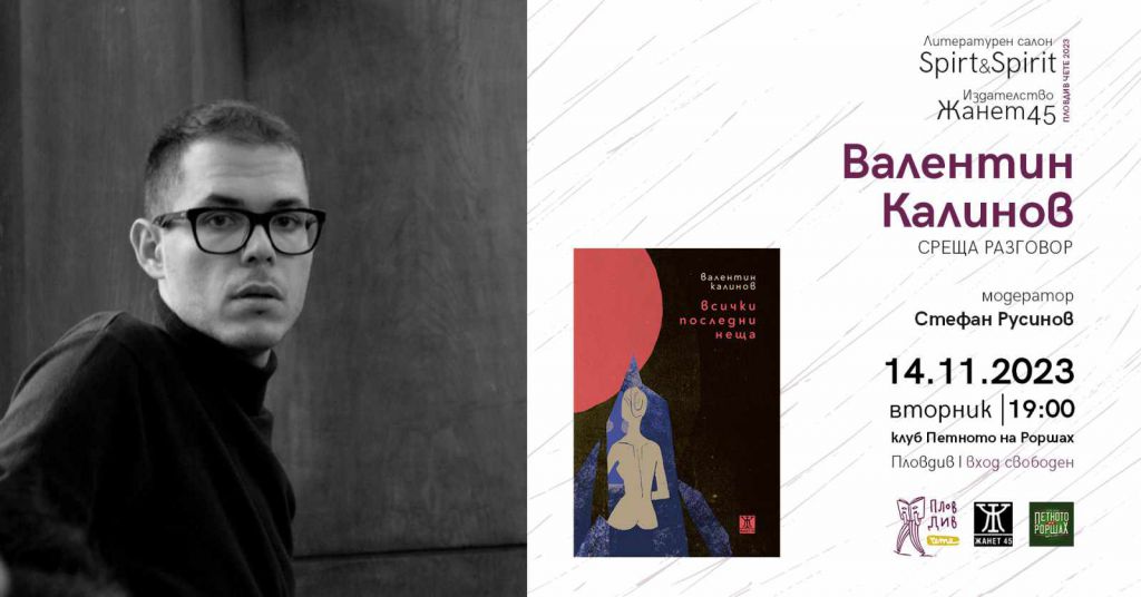 184 На 14 ноември 2023 г. от 14:00 часа в актовата зала на Хуманитарна гимназия „Св. св. Кирил и Методий“ – Пловдив ще гостува Валентин Калинов – философ, университетски преподавател, писател. „Човешкото съществуване между трагедията и комедията” ще бъде тема на дискусията. Това е втората среща от планираните инициативи в Дейност: Обновяване и осъвременяване на училищната библиотека по НП „Осигуряване на съвременна, сигурна и достъпна образователна среда“ на МОН. На 7 ноември 2023 г. гост на гимназията беше една от най-известните и четени български писателки – Теодора Димова. Ученици от 12-те класове се запознаха с дъщерята на Димитър Димов и нейното творчество; поговориха за писането като творчески акт и посланията на романите „Майките“ (заложен в програмата по БЕЛ) и „Поразените“; за колизиите в семейството и обществото, за личните човешки драми и др. Валенти Калинов също е и гост на Литературния салон Spirt & Spirit отново на 14 ноември, по традиция във вторник, в 19:00 часа в клуб Петното на Роршах. Разговора ще води Стефан Русинов. За книгата: Първоначално исках да напиша книга за унищожението на човека. Когато започнах да пиша, от унищожението на човека не остана много. Останаха, по-точно казано, тези неща, тоест всички последни неща. Само за тях си струва да се говори, и за нищо друго. Някои от главите в тази книга са посветени на детството, други на проблемите на семеизпразването у човека, трети на това, което се нарича любов. Също и на онова, което се сънува денем и нощем. Всички до една, разбира се, са посветени на смъртта, защото писането е разговор с мъртвите. А и без това мъртвите са навсякъде. Валентин Калинов (1992) е роден в Силистра. Завършва философия и психология в СУ „Св. Климент Охридски“. Преподава, превежда хуманитарна литература, пише. „Всички последни неща“ е първата му книга. Може да ви хареса също Живот по ноти, от първия до последния акорд, продължава и през 2026 Премиера на единствената по рода си фотореалистична анимация в страната 50 години история в кадри: Хорът на пловдивските момчета „Стефка Благоева“ кани на юбилейна фотоизложба „На крилете на песента“ Международният фестивал 6Fest превръща Пловдив в столица на уличните изкуства