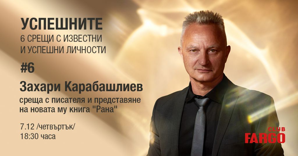 219 Захари Карабашлиев ще представи в Пловдив новата си книга „Рана“ в рамките на „Успешните“. Събитието представя поредица срещи с известни хора от света на спорта, културата и обществения живот, които в непринуден разговор споделят с пловдивчани своята визия за успеха, за кариерата, творчеството и други теми. Захари Карабашлиев ще гостува в клуб “Fargo” тази вечер, 7 декември, от 18:30 часа. Това е последната за годината среща от поредицата „Успешните“.Акцент в събитието ще бъде представянето на новата му книга „Рана“, която само преди броени дни спечели награда „Златен лъв“ в рамките на Международен панаир на книгата в НДК за най-добър издателски проект с най-голяма обществена значимост. „Рана“ която разказва за саможертвата – историята на бежанец от Одринска Тракия след Балканските войни и Елиза – генералска дъщеря, между които пламва любов в София. Книгата е номинирана от „Ozone.bg“ за „Книга на годината“ в категория „Сърцето на родната литература“, а самият Захари Карабашлиев в категория „Виртуозът в писането“.Захари Карабашлиев е сред най-популярните български автори, а сред най-харесваните му романи са „Хавра“, „Опашката“ и „18% сиво“. Успешните се провежда с подкрепата на Община Пловдив. Може да ви хареса също Премиера в Драматичен театър Пловдив – „Дреднаути. Пиеса за женска публика“ AL BANO: Да пея на сцена като Античния театър в Пловдив е чест и вдъхновение Ансамбъл „Тракия“ с нов мащабен спектакъл, вдъхновен от река Марица България с пълен национален отбор за Европейското първенство по стрелба с лък в Пловдив