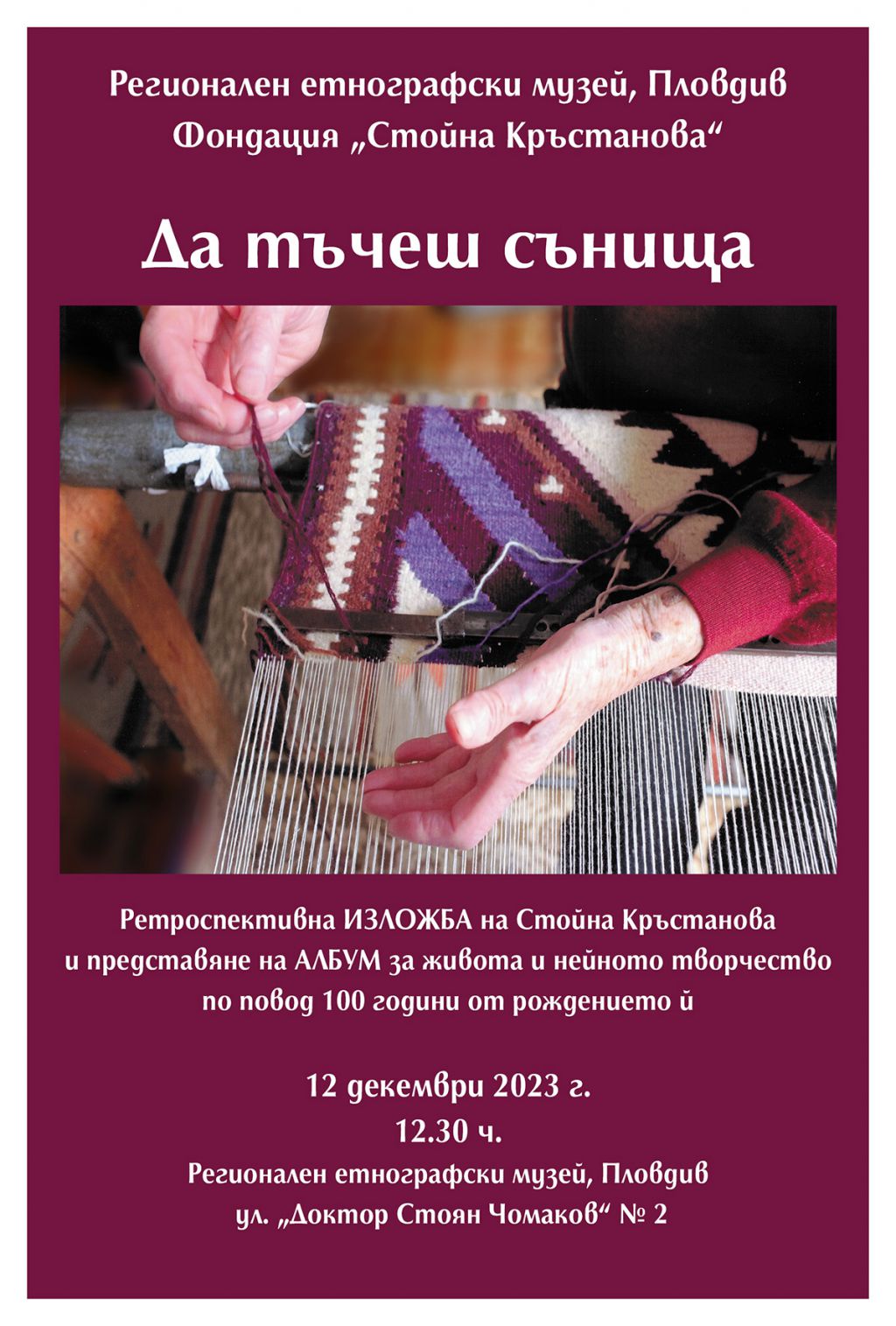178 По повод честването на 100 години от рождението на Стойна Кръстанова – текстилец, майстор на народните художествени занаяти, Фондация „Стойна Кръстанова“ и Регионален етнографски музей – Пловдив канят на откриване на Ретроспективна изложба „Да тъчеш сънища“, което ще се състои на 12 декември 2023 г. от 12.30 ч. в Етнографския музей. Изложбата се съпътства с албум, представящ житейския път и текстилните произведения на Стойна Кръстанова, за да припомним за силата на творческия дар, преклонението пред постиженията на предишните поколения и мисълта какво ще оставим след себе си. Албумът „Да тъчеш сънища“ се издава от Фондация „Стойна Кръстанова“ с подкрепата на Община Пловдив по компонент 4 „Книги на пловдивски автори и важни за града издания“, Le Comité de Jumelage de Pernes-les-Fontaines, France и Françoise Cezanne, Danièle Malcuit, Ginette Bohu, Patrice Bohu, на които благодарим. Очакваме ви на 12 декември 2023 г. от 12.30 ч. в Регионален етнографски музей – Пловдив, ул. „Д-р Стоян Чомаков“ № 2. Може да ви хареса също Драматичен театър – Пловдив с премиера на спектакъла „Записки по българските въстания“ Живот по ноти, от първия до последния акорд, продължава и през 2026 Премиера на единствената по рода си фотореалистична анимация в страната 50 години история в кадри: Хорът на пловдивските момчета „Стефка Благоева“ кани на юбилейна фотоизложба „На крилете на песента“