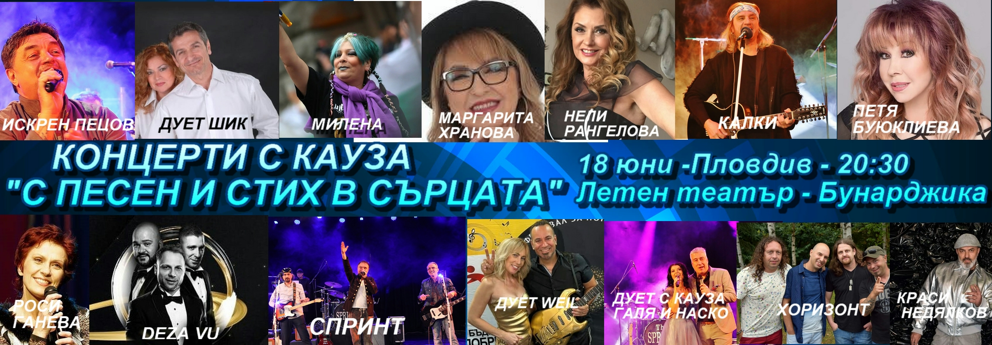 427 Пловдив става част от националното турне „Концерти с кауза“ 2024 – „С песен и стих в сърцата“. Събитията в страната и в Пловдив са в подкрепа на хората с репродуктивни проблеми и каузата „За повече българска музика в национален ефир“. На 18 юни, вторник, от 20:30 ч. на Летния театър на Бунарджика в Пловдив, публиката ще се наслади на незабравимите хитове на популярни български изпълнители, прегърнали каузите и убедени в мисията да бъдат техни посланици. Това са обичаните Маргарита Хранова, Нели Рангелова, Петя Буюклиева, Милена Славова, Росица Ганева, Дует „Шик“, Дует WEIL, Коцето – Калки, Искрен Пецов, Красимир Недялков, „Дует с кауза“ – Галя Георгиева и Атанас Лазаров, Вокално трио „DEJA VU“ (Мирослав Станчев, Дражо Бошнаков и Бранимир Недков), Група „Спринт“, Група „Хоризонт“, група „Жестим“. Концертите се провеждат в съпровода на оркестър „София“. Водещ е Веселин Пренеров – телевизионен журналист и общественик. Специални гости на събитието в Пловдив са децата и младежите от „Арт войс център“ – гр. Пловдив, с ръководител и музикален педагог – Румяна Иванова. Името на турнето е избрано специално, тъй като подкрепя две каузи с изключителна важност за България. Първата е свързана с информационната кампания в подкрепа на хора с репродуктивни проблеми под надслов „Да сверим биологичния си часовник навреме“. Втората е във връзка с националната кампания „За повече българска музика в национален ефир“, която се превърна в кауза на огромна част от българските музиканти и изпълнители. Тяхната цел е да има над 50 % присъствие на българска музика в националните ни медии. По време на турнето ще бъдат раздавани листовки с полезна информация за възможностите и изследванията, които показват репродуктивния статус на жените, а част от средствата ще бъдат предоставени за инвитро процедура на семейство, на което мисията да станат родители е кауза. Организатори на националното турне са Сдружение „Независими автори, музиканти и продуценти“ /СНАМП/ и Студио Спринт Проджект. Провежда се с помощта на Конфедерация на труда „Подкрепа“, както и със съдействието на Комисията по труда, социалната и демографска политика и Комисията по култура и медии към Народното събрание. Билети се продават в системата на Еventim в цялата страна, в Пловдив – каса „МаскАрт“ в Дом на културата „Борис Христов“, Билетен център пред Община Пловдив, в Туристически информационен център на пл. Римски стадион, каса на Античен театър и онлайн на Eventim.bg. Можете да се снабдите с билети и чрез системата на Bilet.bg, касите на EasyPay и EPAYGO. Партньори са Фондация „Искам бебе“, Агенция за публични комуникации „Профайл“, Сдружение „Жени с кауза“, ХайЛайф. Мотото на всички участници в турнето е: „Всеки решен проблем прави живота ни по-сигурен и по-добър“! Може да ви хареса също Международрн конкурс за музикално, танцово и изобразително изкуство „ОРФЕЕВИ ТАЛАНТИ“ Регионален природонаучен музей – Пловдив кани децата на „ПРИКЛЮЧЕНИЕ С ДИНОЗАВРИ“ Невена Цонева и „Баш Бенд“ пристигат утре в Пловдив за концерт, част от турнето „ЗАЕДНО“ Пловдив празнува 7 години от Европейска столица на културата с градския фестивал „Пловдив си ти“