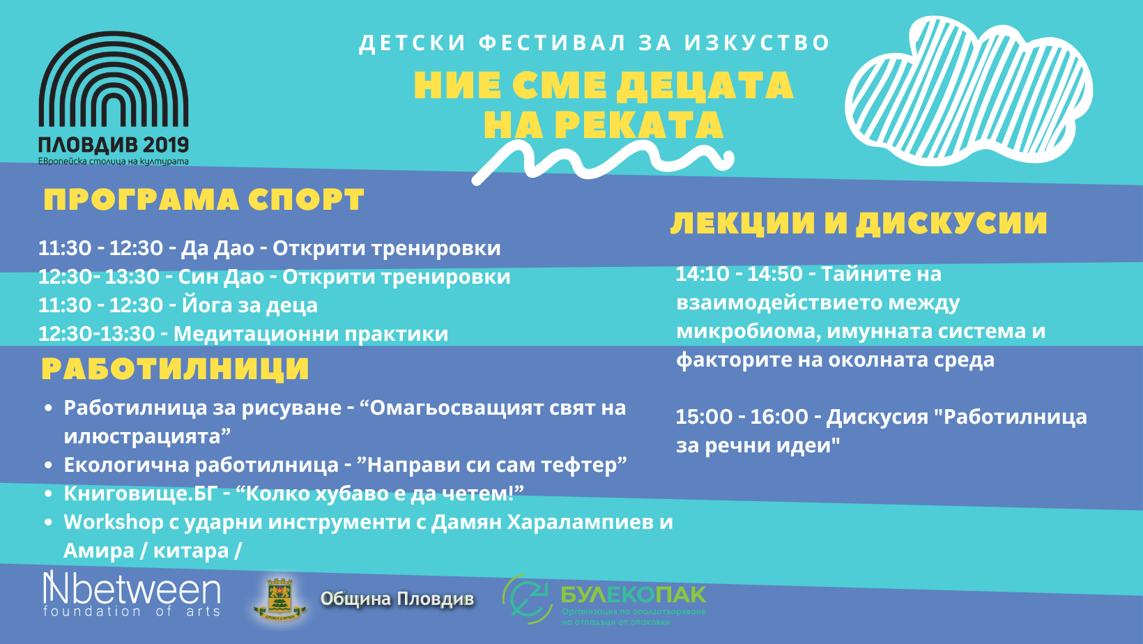 234 Детски фестивал “Ние сме децата на реката” с богата програма от работилници, спорт, семинари и развлекателни дейности, фокусирани върху екологичния градски живот Taзи събота, 21 септември, Пловдив и река Марица посрещат фестивала „Ние сме децата на реката“, едно вълнуващо събитие, което обединява деца, младежи и семейства в стремежа им към по-зелен и по-устойчив град. Програмата на деня стартира точно в 11 часа и ще включва различни работилници, семинари и развлекателни дейности, фокусирани върху екологичния градски живот. Към програмата на събитието като участници ще се включат художници, екологични организации и експерти от различни области. Точната локация на провеждане на фестивала: Южен бряг на река Марица, по дължина на алеята от Водната палата в посока моста на Адата. Може да ви хареса също Международрн конкурс за музикално, танцово и изобразително изкуство „ОРФЕЕВИ ТАЛАНТИ“ Регионален природонаучен музей – Пловдив кани децата на „ПРИКЛЮЧЕНИЕ С ДИНОЗАВРИ“ Невена Цонева и „Баш Бенд“ пристигат утре в Пловдив за концерт, част от турнето „ЗАЕДНО“ Пловдив празнува 7 години от Европейска столица на културата с градския фестивал „Пловдив си ти“
