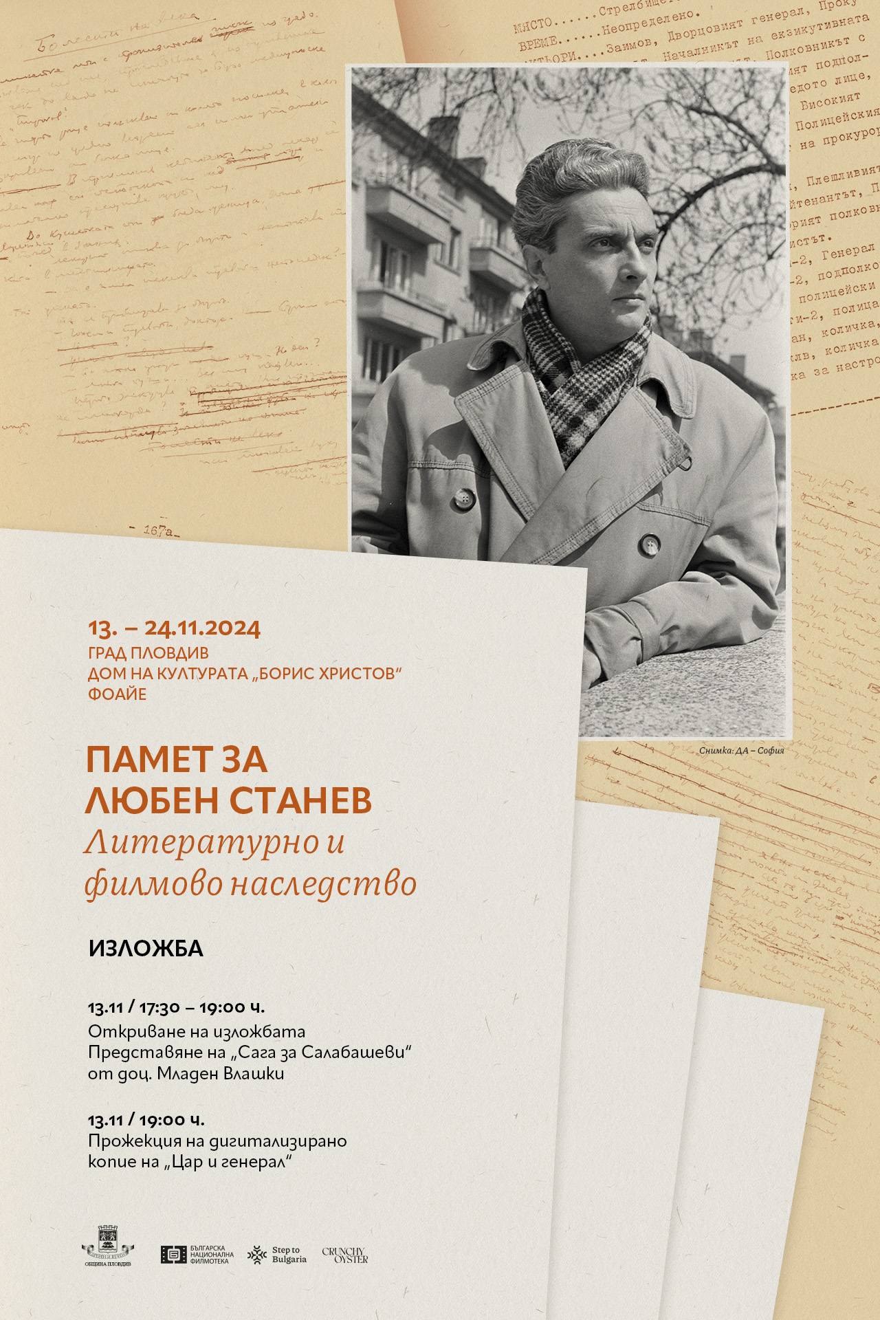 243 Тази вечер в Дома на културата „Борис Христов“ ще се състои едно специално събитие, посветено на българския писател и сценарист Любен Станев, роден преди 100 години в Пловдив. Вечерта започва в 17:30 ч. във фоайето с откриване на документалната изложба „Памет за Любен Станев. Литературно и филмово наследство“. (Изложбата може да бъде разгледана до 24.11.2024 г.) След изложбата ще бъдат представени новите издания на поредицата от шест романа „Сага за Салабашеви“, писани в продължение на повече от десетилетие в края на миналия век. „Сага за Салабашеви“ ще представи доц. д-р Младен Влашки. В 19.00 часа в Голямата конферентна зала на Дом на културата започва прожекция на дигитализираното копие на филма „Цар и генерал“. „Цар и генерал“ е български игрален филм от 1966 година на режисьора Въло Радев, по сценарий на Любен Станев. Оператор е Борислав Пунчев. Музиката във филма е композирана от Симеон Пиронков. Филмът е направен по историческа случка, носител на Голямата награда „Златната роза“, ФБФ Варна, 1966 и Първа награда за актьорско изпълнение на Наум Шопов на МКФ Карлови Вари, ЧССР, 1966. В основата на филма е психологически, политически и идеологически конфликт между генерал Владимир Заимов и цар Борис III. Двубоят между двамата мъже е в плоскостта на отговорността за съдбата на България. И двамата са загрижени за бъдещето на страната, но го виждат по различен начин. В ролите: Наум Шопов, Петър Слабаков, Евгени Урбански, Стойчо Мазгалов, Руси Чанев, Георги Черкелов, Андрей Аврамов, Северина Тенева, Сотир Майноловски, Александър Притуп, Тодор Колев, Таня Тодорова, Тихомир Златев, Васил Кирков, Константин Димчев и др. Модератор на вечерта, посветена на 100 години от рождението на Любен Станев ще е дъщерята на писателя Надя Станева, която е и куратор на изложбата, а племенникът му доц. Георги Лозанов ще е сред специалните гости. Събитието се осъществяват с финансовата и логистична подкрепа на Община Пловдив. Входът е свободен! Любен Станев (1924 – 2009 г.) е роден в Пловдив. През 1949 година завършва Медицина в родния си град, а след това работи като военен лекар. Става един от създателите и председател на Съюза на писателите-лекари в България и вицепрезидент на Международния съюз на писателите лекари (UMEM). През 1953 година постъпва в Студия за игрални филми „Бояна“, където работи като редактор, главен редактор и сценарист. Автор е на повече от 30 книги, между които „Поглед от хълма“, „Софийска история“, „Недей ми казва сбогом“, сценарист на 15 филма, по-известни от тях са „Цар и генерал“, „Мъже в командировка“, „Тази хубава зряла възраст“. През 1966 година става носител на наградата „Златна роза“ за филма „Цар и генерал“. Станев е и съавтор (съвместно с Иванка Гръбчева) на сценария на сериала „Жребият“ по романа на Свобода Бъчварова. Може да ви хареса също Пловдивско читалище гостува в Перущица, Кричим и с. Динката с „Фестивал на шевицата“ Признание за екипа на Регионален археологически музей – Пловдив Студенти и художници – среща на поколенията в Галерия „Капана“ Пловдивски пианисти с празничен концерт във Варшава за Националния празник
