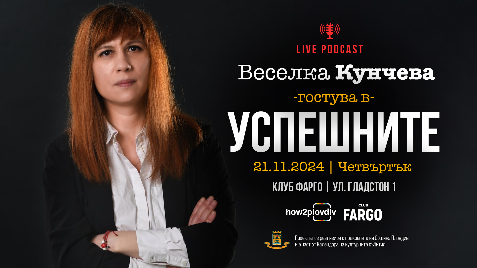 306 На 21 ноември Club Fargo отново ще посрещне пловдивчани и гости на града за една вълнуваща среща. Изтъкнатият български режисьор Веселка Кунчева застава пред микрофона в четвъртата среща от формата „Успешните“. Тя е режисьор на редица спектакли, като „Нос“ по Гогол, „Аз, Сизиф“, „Последният човек“ по Оруел и „Дама Пика“. Работи активно и в международни проекти, изследвайки границите между традиционния и съвременния куклен театър. През 2014 г. основава „Пъпетс Лаб“ заедно със сценографа Мариета Голомехова, с която разработва иновативни спектакли. Творчеството ѝ е отличено с множество награди, включително „ИКАР“ и „Аскеер“ за куклен и драматичен театър. Срещата ще се състои на 21 ноември от 19:00ч. в Club Fargo. Форматът „Успешните“ предоставя възможност на своите гости да се докоснат в близка среща до любими образи от музикалната сцена, киното, литературата, културата и спорта, всеки специалист в своята област. В първите две издания през 2022 г. и 2023 г., гости в поредицата бяха писателят и журналист Иво Иванов (два пъти), великият майстор по бойни изкуства сенсей Тадаши Ямашита – участвал в множество холивудски филми, режисьорите Диана Добрева и Явор Гърдев, аниматорът Тео Ушев, Иван Бърнев, Керана, Стефан Вълдобрев, Васил Върбанов, Радо Бимбалов, Алекс Алексиев и Яна Титова, Стефан Командарев и Ели Скорчева, както и Захари Карабашлиев. В първите три срещи за тази година гости на формата бяха фронтменът на група Остава – Свилен Ноев, джаз дамата на България – Мирослава Кацарова и знаменитият български актьор – Малин Кръстев! Можете да откриете всички видеа от предходните издания – тук. https://www.youtube.com/@clubfargo4383 Организаторите от How2Plovdiv и Club Fargo отново поемат по пътя към дефиницията на думата „Успех“. Предстоят още 2 вълнуващи срещи до края на 2024 г. Можете да следите страниците на How2Plovdiv и Club Fargo, където ще бъдат оповестявани всички предстоящи срещи. Разговорите ще бъдат споделени в официалните YouTube, Facebook, Instagram и TikTok канали на How2Plovdiv и Club Fargo. Хората, които нямат възможност да посетят на място биха могли да гледат разговорите и да се докоснат до гостите виртуално. Срещите са с вход свободен. Проектът се реализира с подкрепата на Община Пловдив и е част от Календара на културните събития. Може да ви хареса също Премиера в Драматичен театър Пловдив – „Дреднаути. Пиеса за женска публика“ AL BANO: Да пея на сцена като Античния театър в Пловдив е чест и вдъхновение Ансамбъл „Тракия“ с нов мащабен спектакъл, вдъхновен от река Марица България с пълен национален отбор за Европейското първенство по стрелба с лък в Пловдив