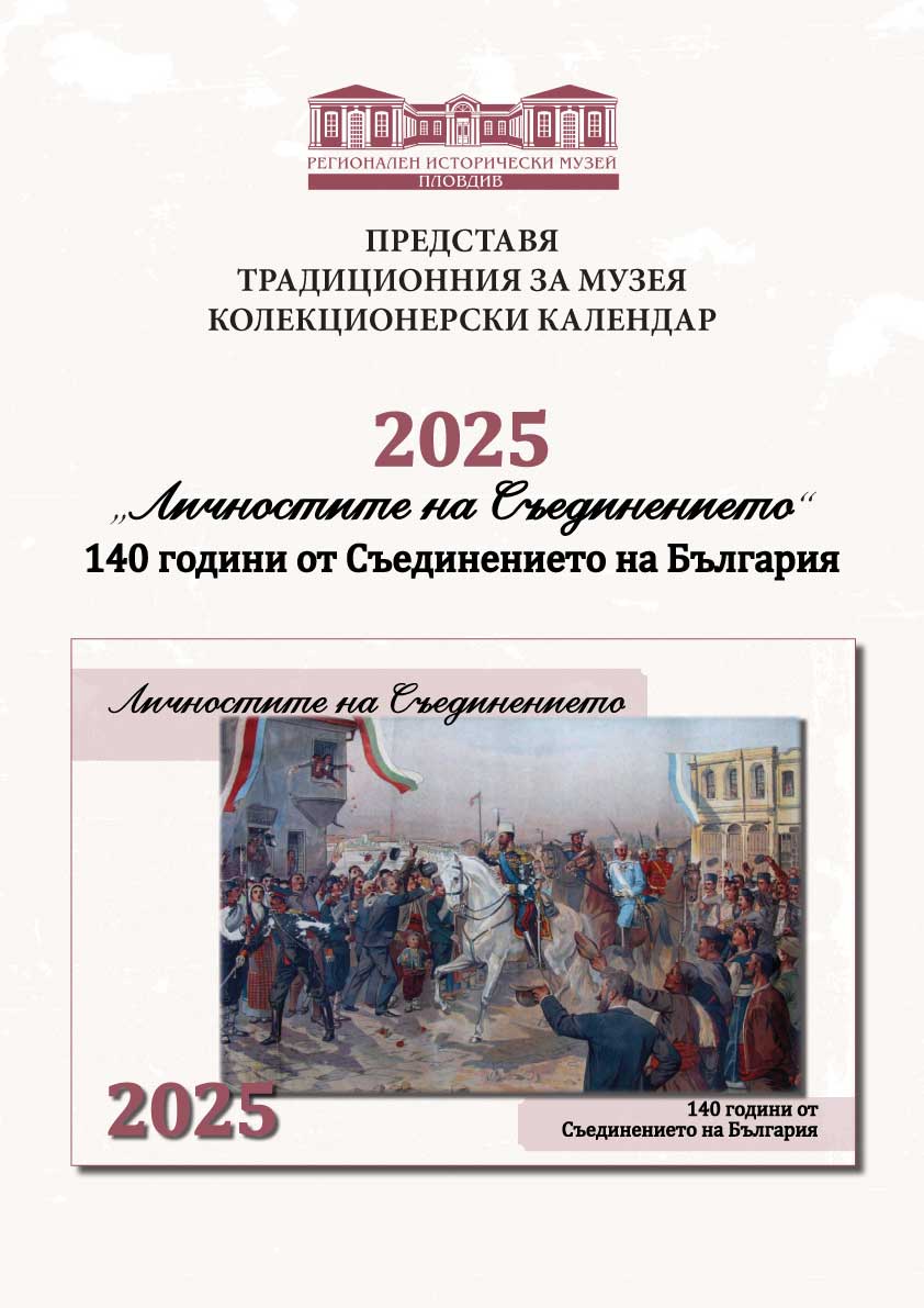 488 Регионален исторически музей – Пловдив има удоволствието да Ви представи тематичния календар за 2025 година, посветен на 140-годишнината от Съединението на България. Календарът разкрива лицата и историите на личностите, допринесли за този ключов момент от нашата история. Всяка страница е вдъхновение, отдаващо почит на тяхната смелост и всеотдайност. Наличен от 10 декември в експозиция „Съединение на България 1885 г.“ на Регионален исторически музей – Пловдив (пл. Съединение №1). Идеален подарък, който ще внесе духа на българската история във Вашия дом или офис. Може да ви хареса също Пловдив стана част от европейския културен маршрут „Кирил и Методий“ Мюзикхолен театър Пловдив играе в неделя най-награждавания си спектакъл „Прераждане“ 130 години история в звуци: Пловдивското певческо дружество „Ангел Букорещлиев“ отпразнува своя юбилей Два дни, две локации и много емоция очакват малки и големи на „Празник на танца и спорта“ 2026