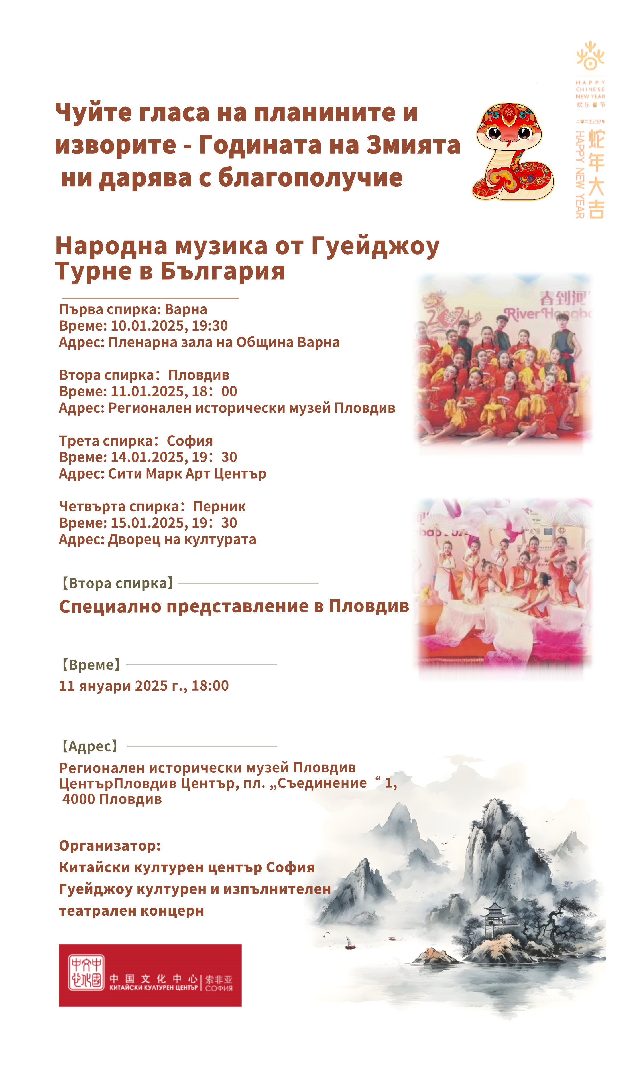 392 На 11 януари 2024 г. от 18:00 часа, зала „Съединение“ на Регионален исторически музей – Пловдив ще бъде домакин на музикално събитие – „Чуйте гласа на планините и изворите – Годината на змията ни дарява с благополучие“. В този спектакъл танцьорите от Театъра на фенерите в провинция Гуейджоу ще покажат на публиката богатото културно наследство и артистичния чар на етническите малцинства в Гуейджоу чрез традиционни етнически народни танци, а певците им ще накарат българската публика да оцени уникалния характер на китайската провинция. Провинция Гуейджоу, разположена във вътрешността на Югозападен Китай, е една от провинциите с най-голям брой етнически малцинства в Китай. Гуейджоу притежава богата етнокултурна традиция и многообразни местни характеристики. Там уникалният географски чар се слива с човешкото – „Почвата и водата издигат човека“. Сред този великолепен пейзаж издръжливият и оптимистичен народ на Гуейджоу е създал голям брой литературни и художествени съкровища, наситени с местни особености. Не пропускайте тази възможност да се потопите в магията на китайската култура! Вход свободен! Може да ви хареса също Премиера в Драматичен театър Пловдив – „Дреднаути. Пиеса за женска публика“ AL BANO: Да пея на сцена като Античния театър в Пловдив е чест и вдъхновение Ансамбъл „Тракия“ с нов мащабен спектакъл, вдъхновен от река Марица България с пълен национален отбор за Европейското първенство по стрелба с лък в Пловдив