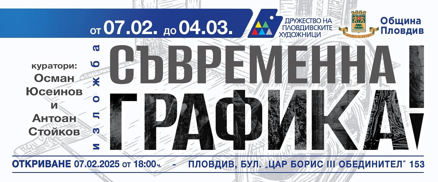 343 Дружество на пловдивските художници кани на следващата мащабна изложба от годишния си календар, посветена на „Съвременната графика“. Графиката е елитарно изкуство, тя изисква своите условия на създаване и специфичен за проявата форум, затова и настоящата изложба с куратори Осман Юсеинов и Антоан Стойков, е организирана чрез отворена покана към творците, които работят в областта на изящната графика. Изложбата е с награден фонд, като наградите ще бъдат определени от тричленно жури от доказани професионалисти в областта на графиката. Официалното откриване е на 7 февруари 2025 г., петък, в галерия „Дружество на пловдивските художници“ на бул. „Цар Борис III Обединител“ № 153. Събитието се осъществява с финансовата подкрепа на Община Пловдив и е част от Културния календар на града за 2025 година. Първото издание на „Съвременна графика“ бе през февруари 2024 г. В него взеха участие голям брой автори и събитието получи широк обществен отзвук сред публиката. След успеха на изложбата, Дружеството взе решение проявата да стане ежегодна. Търсеният ефект е създаването на изложба с богато разнообразие на класически и съвременни графични техники, създаване на значима експозиция, която отразява постиженията на българското графично изкуство в момента. В настоящата изложба отново участват голям брой автори – от млади до утвърдени имена – от града и областта. Предстои и издаване на каталог с експозицията. Екземпляри от него ще бъдат предоставени на НБ „Иван Вазов“ в дигитален и печатен вариант, специализирани по изкуствата учебни заведения – АМТИИ Пловдив, ПУ „Паисий Хилендарски“ /Катедра „Естетическо възпитание“/, НХГ„Цанко Лавренов“, НГСЕИ – Пловдив в печатен вариант. Изложбата ще продължи до 04.03.2025 г. За дружеството: Дружество на пловдивските художници е създадено като ЮЛНЦ през 1990 г. като продължител на дейността на Дружество на Южнобългарските художници, основано през 1911 г. Осъществява редица прояви, които популяризират творчеството на местни творци и спомагат за осъществяването на връзки и взаимодействие между местни, регионални и международни артисти. Основно място заемат изложбите: общи, групови, гостуващи и самостоятелни, както и организиране на собствени и участие в международни пленери, симпозиуми, конференции и срещи за осъществяване на контакти както с подобни структури в страната, така и в чужбина, размяна на изложби и творци, организиране на съвместни прояви с други творчески обединения. ДПХ е организатор на: Международен пленер по живопис за осъществяване на контакти на художници от България и чужбина; Международен литографски пленер, за насърчаване на съвременните творчески търсения в областта на графиката; Симпозиум по скулптура, чиято цел е насищането на парковите пространства в Пловдив с подходяща пластика, която да естетизира парковата среда; международен симпозиум (временно прекъснати) „Арт колаж – Пловдив“, който допринася за развитието на колажа и за утвърждаването му като отделен жанр в изкуството; Периодични издания на изложба „Южнобългарски художници“ и др. Дружеството осъществява няколко значими регулярни прояви, част от Културния календар на Пловдив, като: „Изложба „Цветове“, „ Изложба 15х5“, „Юбиляри 5,6,7“, „Годишна изложба“, регулярни пленери и изложби от годишния културен календар на гра