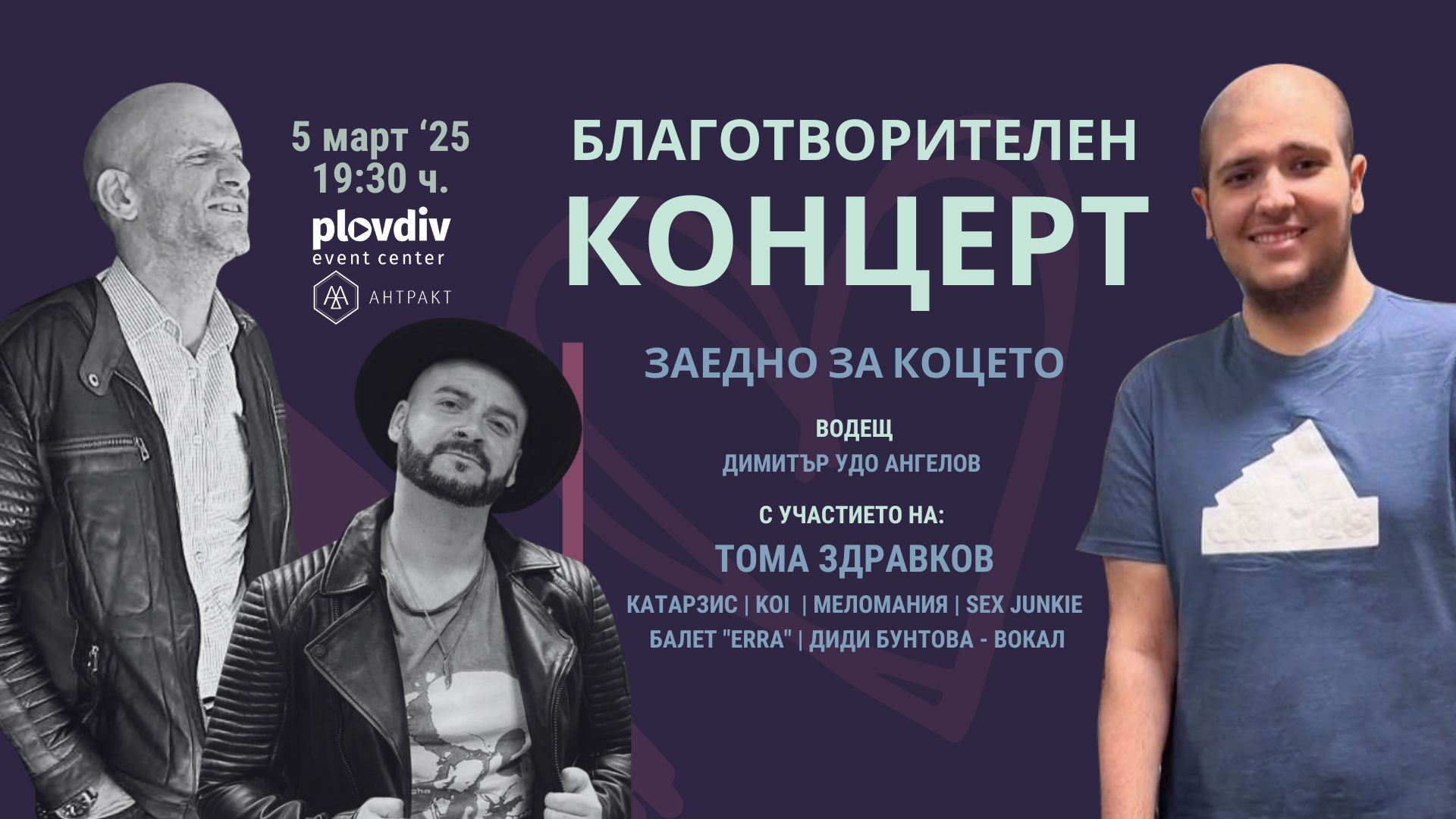 194 На 5 март в Plovdiv Event Centеr от 19.30 часа ще започна концерт под надслов „Крила от ритъм“ в подкрепа на каузата за спасяването на живота на 20-годишния Коце от Пловдив. В концерта ще вземат участие Тома Здравков – Тома, група “Меломания”, група “KOI”, “Sex Junkie”, група “Катарзис”, Диди Бунтова, балет “ЕРРА”. Водещ е Димитър Удо Ангелов. На следващия ден (6 март) в зала „Сила“ от 19 часа ще се състои и втората благотворителна акция, обединена във фолклорния спектакъл „Сърца в такт“. В него ще вземат участие ансамблите „Тракия“, „Дилянка“, „Седенчица“, танцова формация „Хоро“, гайдарски ансамбъл „Еподай“, Петя Панева и Митко Денев, Ваня Вълкова, Десислава Лалева, Орк. Фолк Палитра. Водещ ще е Стефан Лозанов. Билети за двата концерта може да закупите онлайн ТУК и ТУК или в следните търговски обекти, партньори на събитието – магазините на „ИМИКС“ (сребърни бижута), ул. „Райко Даскалов“ 26, Пловдив, МОЛ Плаза, Пловдив (ул. Д-р Странски 3, ниво 0), ТЦ Форум Тракия, Пловдив (партер), МОЛ Пловдив (ул. Перущица 8, ниво 1) ТЦ Гранд, Пловдив (ул. Капитан Райчо 56, партер), хранителен магазин „При Здравко“ – кв. Коматево, Пловдив (на обръщалото). А сега за историята на Коце, едно младо, упорито и умно момче на 20 години. Историята на Коце започва с болки в гърба последвани от Парализа. След лутане в България и операция, той заминава за Турция за второ мнение, защото разбират, че диагнозата е рядка, едва 1.5 човека на 1 000 000, а в България нямат опит с нея! Лекарският екип незабавно назначава лечение, което да спаси живота му! Лечение, което обаче е непосилно за семейството, защото излиза на стойност над 400 000 Евро! Благодарение на близки, приятели и добри човеци за Коце се организира благотворителна кампания за набиране на средства, базари, концерти! Коце преминава през 12 курса химиотерапия и множество лъчетерапии, успява да се изправи на крака, да проходи отново! Коце има волята за живот, и за минута не се отказва да се бори. Това става благодарение на всички добри Човеци. Сега е изправен пред ново предизвикателство и отново той не се отказва. След операцията, която е наложителна, за да продължи успешно лечението, той получава белодробна емболия и сърцето му спира! Волята му за живот, обаче отново надделява! След повече от две седмици на апаратно дишане, той се събужда! Вече месец е в интензивно отделение, като е необходимо да се стабилизира. За втори път, трябва да се изправи на крака! Всичко това е свързано с много средства, с които семейството не разполага. Месечен престой в болницата е около 30 000 евро! Така всички, близки и приятели отново организират събития за набиране на средства! Всички желаещи да помогнат на младия мъж могат да се присъединят и с дарение на следната сметка: Банка ДСК IBAN: BG84STSA93000030654749 BIC: STSABGSF Титуляр: Костадин Стефанов Бозуков Може да ви хареса също Премиера в Драматичен театър Пловдив – „Дреднаути. Пиеса за женска публика“ AL BANO: Да пея на сцена като Античния театър в Пловдив е чест и вдъхновение Ансамбъл „Тракия“ с нов мащабен спектакъл, вдъхновен от река Марица България с пълен национален отбор за Европейското първенство по стрелба с лък в Пловдив