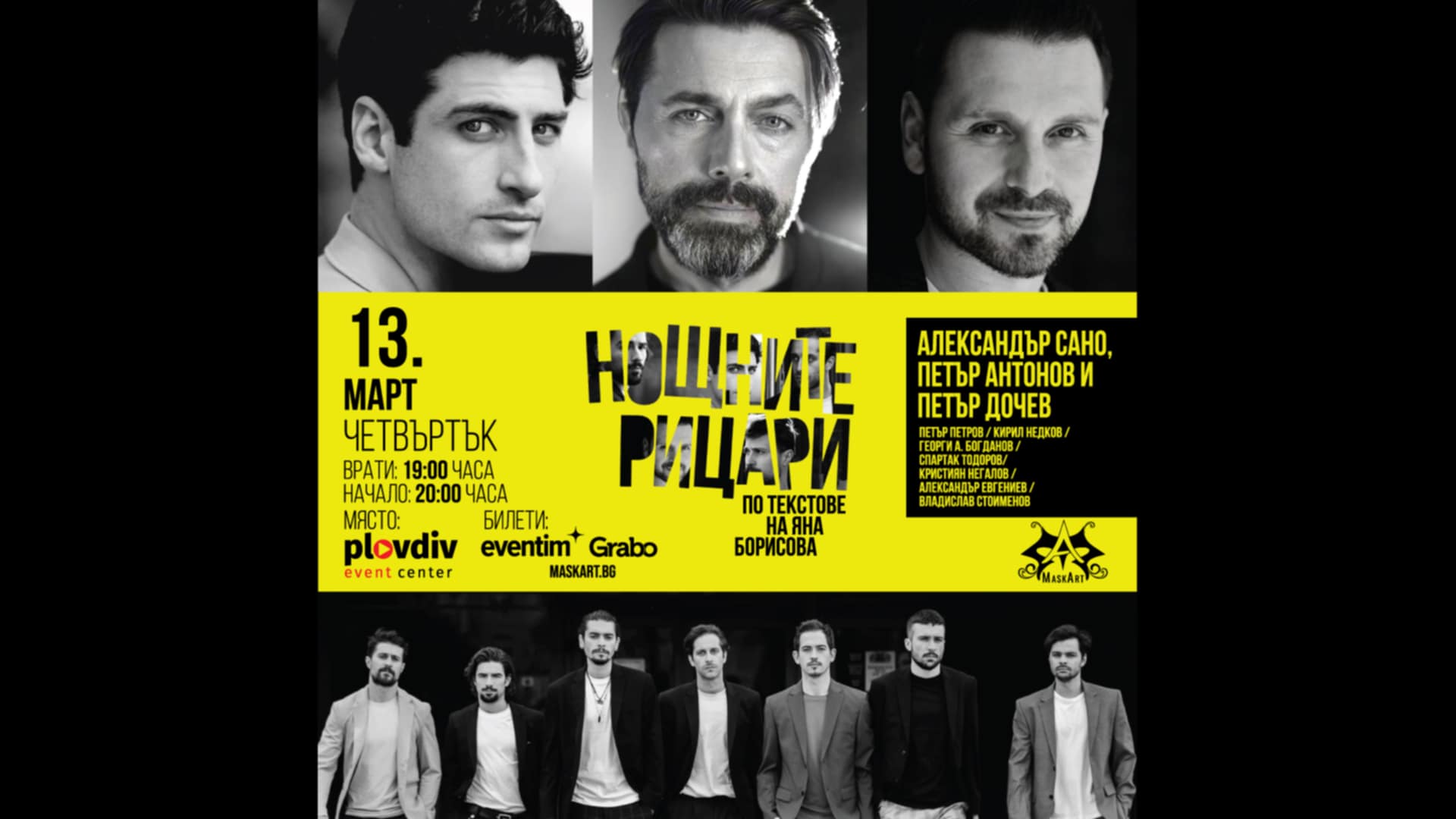 318 Хитовият спектакъл „Нощните рицари“ по драматургични текстове на Яна Борисова ще гостува в Пловдив на 13 март, четвъртък в Plovdiv Event Centre Антракт, началото е от 20.00 часа. В „Нощните рицари“ говорят за любовта по начин, по който никой не го е правил до този момент. Те са пазители на нощта – времето, когато всичко забранено е позволено и всичко неизказано може да се изрече. Това са гласове, които разцепват мрака и говорят за любов. Спектакълът е със специалното участие на Александър Сано, Петър Антонов и Петър Дочев и актьорите Александър Евгениев, Владислав Стоименов, Спартак Панталеев, Кристиян Негалов, Георги А. Богданов, Кирил Недков, Петър Петров. Сценографията е дело на Елис Вели, музиката е на Милен Кукошаров. „Нощните рицари“ е уникален спектакъл по текстове на Яна Борисова, в който няколко млади мъже говорят за любовта брутално откровено, без цензура и без задръжки. Те са млади, талантливи, красиви и разказват за мъжката гледна точка на този емоционален водовъртеж, в който всички рано или късно попадаме. Хитовият спектакъл успява да ни развълнува, да ни разплаче и разсмее до сълзи, защото смисълът му е да освети всичко онова, което ни е срам да признаем в реалността. „В „Нощните рицари“ всички можем да отворим сетивата си за това огромно емоционално море наречено любов…или влюбване. Моята голяма страст, моята голяма тема като автор, която аз винаги ще следвам, а тя винаги ще ми предстои. Любовта е свързана с оцеляването, с вдъхновението от живеенето, с дишането, с радостта, и с концепцията за щастие. Тя е сериозна работа и не е за всеки. Това е може би единствената безпогрешна формула досега, която е спасявала човечеството. Огромна стихия с размери и сила без аналог. Която единствена превръща хората в богове и обратното! И както каза един мой много скъп човек: Никой не може да се изложи, когато става дума за любов“, споделя свои мисли за любовта и спектакъла авторката Яна Борисова. Билети се продават на билетна каса „МаскАрт“ в ДК „Борис Христов“, мрежата на Ивентим и Грабо. (за контакт 0895/619181) Може да ви хареса също Премиера в Драматичен театър Пловдив – „Дреднаути. Пиеса за женска публика“ AL BANO: Да пея на сцена като Античния театър в Пловдив е чест и вдъхновение Ансамбъл „Тракия“ с нов мащабен спектакъл, вдъхновен от река Марица България с пълен национален отбор за Европейското първенство по стрелба с лък в Пловдив