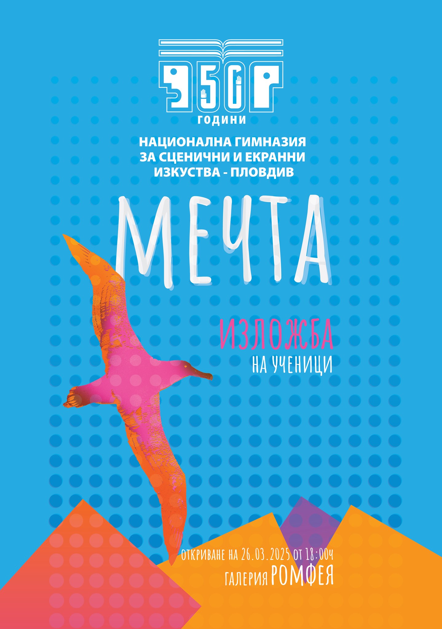 249 На 26 март 2025г. в 18.00 часа в галерия „Ромфея“ ще бъде открита изложба със заглавие „Мечта“ на талантливите възпитаници на Националната гимназия за сценични и екранни изкуства в Пловдив. Изложбата е част от програмата на събитията, с която уникалното за Балканите учебно заведение чества 50 години от основаването си. Защо „Мечта“? „Мечтата преди всичко е свобода и избор. Вярата, че независимо от произход, религиозна принадлежност, пол, възраст, талант, човек е свободен да бъде щастлив, да превърне идеите си в реалност, да постигне успехите, към които се стреми. Мечтата е енергия, желание за живот, чувство за смисъл и стремеж към по-добро. Това, на което искаме да научим нашите ученици е, че поемайки по пътя на своята мечта не трябва да се отказват за миг от нея! Да мечтаем ни дава криле. Сбъдването на една мечта обаче е работа, всекидневна. Изисква се голяма доза самодисциплина, знания, умения, усилия и воля“, коментира директорът на гимназията Николай Томов, който е и бивш възпитаник. Националната гимназия за сценични и екранни изкуства e открита през есента на 1975 година, като ССХУ за Сценични кадри, а през 2005 г. училището получава името Национална гимназия за сценични и екранни изкуства. Историята на гимназията е белязана с високи постижения като учебна институция, много от завършилите ученици са вече утвърдени творци в различни сфери на сценичните и визуални изкуства – у нас и по света. Гимназията е горда с многобройните си творчески постижения в реализирането на проекти в професионални творчески институти – театър, опера и кино. В НГСЕИ – Пловдив се изучават: „Сценичен костюм“, „Театрален, кино и телевизионен декор“, „Художествено осветление за театър, кино и телевизия“, „Театрална кукла“, специалност „Драматичен театър“, специалност „Куклен театър“, „Компютърна анимация“, специалност „Пантомима“, „Театрален грим и перуки“. Наред с общообразователните дисциплини и специфичната подготовка, интерес за учениците представляват т.нар. „общо художествени дисциплини“: история на изкуството, рисуване, перспектива, пластична анатомия, история на музиката, живопис, скулптура, история на костюма, компютърно проектиране и др. Вече 50 години в НГСЕИ се дипломират доказано интелигентни, талантливи, будни и креативни млади хора, които се вливат в културния живот на страната и усилено работят а затвърждаване на позициите ѝ на културната карта на Европа и света. Като част от събитията по повод 50- годишния юбилей предстои и интересна мащабна изложба на бивши възпитаници на гимназията. Тя ще бъде открита на 15 май 2025 г. в галерия „Капана“ към ГХГ. Може да ви хареса също Премиера в Драматичен театър Пловдив – „Дреднаути. Пиеса за женска публика“ AL BANO: Да пея на сцена като Античния театър в Пловдив е чест и вдъхновение Ансамбъл „Тракия“ с нов мащабен спектакъл, вдъхновен от река Марица България с пълен национален отбор за Европейското първенство по стрелба с лък в Пловдив