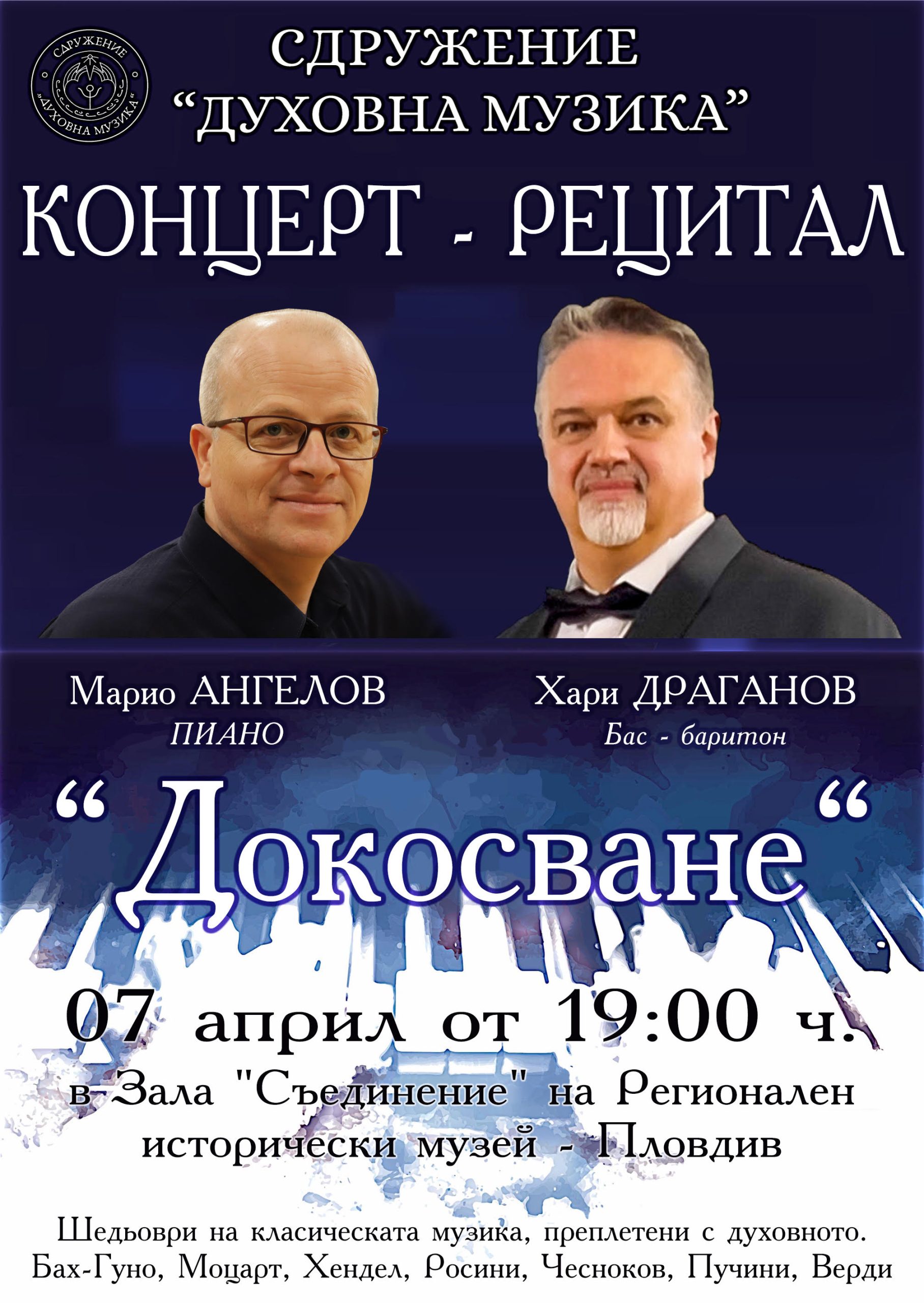 296 Сдружение „Духовна музика“ в партньорство с Регионален исторически музей – Пловдив Ви канят на вълнуващ концерт-рецитал „Докосване“, който ще се проведе на 7 април от 19:00 ч. в зала „Съединение“ на Регионален исторически музей – Пловдив. Събитието е със специално значение за Хари Драганов (бас-баритон), който е наследник на Софроний Врачански и Алеко Богориди (роден на 5 април). Концертът е посветен на тази историческа връзка. В събитието ще вземе участие и Марио Ангелов (пиано) – Директор на „Музикална продукция и състави“ на БНР. Публиката ще има възможност да се наслади на вдъхновяващи произведения от Бах-Гуно, Моцарт, Хендел, Росини, Чесноков, Пучини, Верди и други велики композитори. Концертът се организира с благотворителна цел. Събраните средства ще бъдат използвани за организиране на обучения за професии изискващи използване на гласа, като основен инструмент (опознаване и усъвършенстване на техники). Основната мисия на сдружение „Духовна музика” е създаването на първото в света висше училище за духовна музика. Може да ви хареса също Безплатно занаятчийско обучение на Улица на занаятите – Пловдив по проект „ЗАНАЯТИ С БЪДЕЩЕ“ Академия „Наследство“ превърна пловдивските музеи в център за професионален обмен Ансамбъл BAROCCO от оркестъра на прочутата Миланска Скала открива XVII МФ „Дни на музиката в Балабановата къща“ Пловдив стана център на ключово партньорство между ЮНЕСКО и Сдружение „Български музеи“