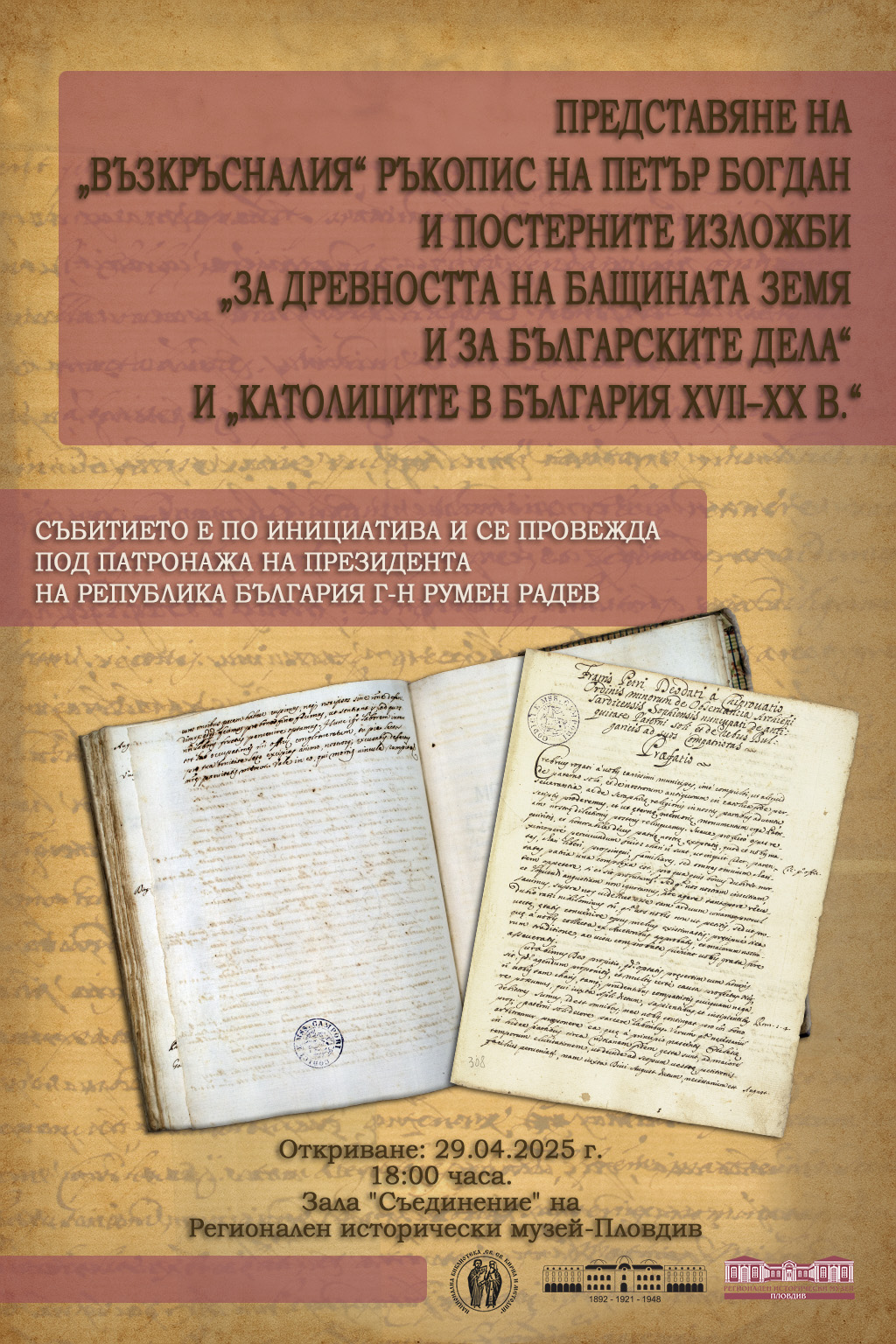 228 Представяне на „възкръсналия“ ръкопис на Петър Богдан в Регионален исторически музей- Пловдив Събитието е по инициатива и се осъществява под патронажа на Президента на Република България г-н Румен Радев. Националният археологически институт с музей при Българската академия на науките (НАИМ при БАН) ще представи на 29 април 2025 г. от 18:00 ч. в зала „Съединение“ на Регионален исторически музей – Пловдив „възкръсналия“ ръкопис на Петър Богдан – „За древността на бащината земя и за българските дела“. С любезното съдействие на държавните власти в Република Италия, на ръководството на Галерии Естенси и на община Модена, на 10.05.2024 г., българската държава, в лицето на Националният археологически институт с музей към Българската академия на науките получи като дарение сертифицирана репродукция на ръкописа на Петър Богдан. Представянето на ръкописа се съпътства от две постерни изложби. 1. „За древността на бащината земя и за българските дела“, посветена на историята на ръкописа на Петър Богдан, организирана и направена от Националният археологически институт с музей. Автор на изложбата и преводач на ръкописа е доц. д-р Цветан Василев към катедра „Класическа филология“ на Софийския университет. 2. „Католиците в България XVII -XX в.“ представя приноса на католическата общност за запазването на духа на свободолюбие и национално самосъзнание в българските земи и за възстановяването на българската държавност. Автори са доц. д-р Радослав Спасов и д-р Бояна Минчева от Националната библиотека „Св. св. Кирил и Методий“. Петър Богдан е първият български католически архиепископ. Ръкописът му е първият исторически трактат, посветен на България, написан по време на нашето Предвъзраждане. Разглежда християнското минало и настояще по българските земи с поглед към бъдещето – един от най-ценните български писмени паметници. Дълго време в научните среди се смята, че трактатът е загубен във времето и до нас не е достигнал негов екземпляр. През 70-те години на миналия век проф. Божидар Димитров открива единични страници от негов редактиран препис в библиотеката на Ватикана. Единственият, известен до момента екземпляр, е издирен от проф. д-р Лилия Илиева през 2017 г. Той е част от богатата колекция на маркиз Кампори, завещана на Библиотека Естенси Университария (Biblioteca Estense Universitaria) в гр. Модена, където се съхранява от 1887 г. до днес. След сензационното откритие, ръкописът е издаден факсимилно в рамките на научния проект „Гутенберговата революция и българите“ през 2020 г., от университетското издателство на Югозападния университет „Неофит Рилски“. с предговор от проф. Лилия Илиева. Също през 2020 г. след тригодишно изследване, излиза от печат и критично издание на латинския текст на трактата на Петър Богдан, с превод и коментар, придружено с отделно изследване, посветено на палеографията, текстологията и езика на трактата, осъществено от д-р Цветан Василев. Двутомното издание е публикувано от университетското издателство „Св. Климент Охридски“. Може да ви хареса също AL BANO: Да пея на сцена като Античния театър в Пловдив е чест и вдъхновение Ансамбъл „Тракия“ с нов мащабен спектакъл, вдъхновен от река Марица България с пълен национален отбор за Европейското първенство по стрелба с лък в Пловдив Регионален етнографски музей – Пловдив с работилници за мартен