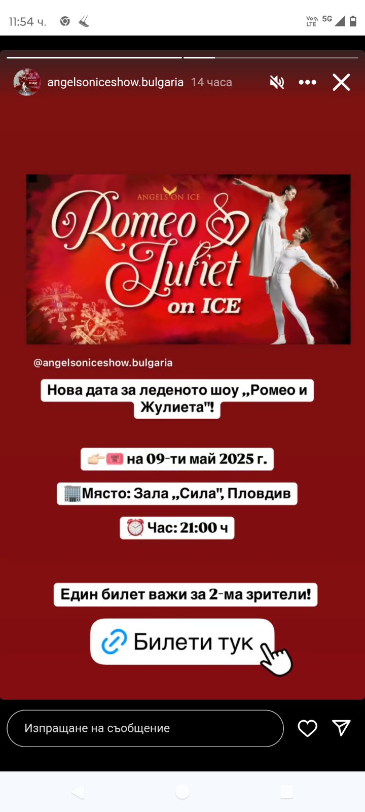 310 Важна промяна за леденото шоу в Пловдив. Ето какво съобщиха организаторите: Шоуто ще бъде с ден по-рано заради обилните дъждове в събота! Едно от най-амбициозните и въздействащи ледени шоута, създавани досега на Балканите – „Ромео и Жулиета на лед“, ще има своята премиера в България. Променени са мястото и датата! Очакваме ви в : петък 9-ти май 2025 г в закрита спортна зала ,,Сила’’ в Пловдив. Часът остава: 21:00 Билети: www.eventim.bg www.grabo.bg Всички билетни каси в Пловдив! За съжаление, не можем да ви посрещнем в Античния театър. Но Шоуто ще бъде все така пищно и в програмата ще участват всички фигуристи. Тези, които имат билети, няма нужда да ги презаверяват. А който си купи сега 1 билет, ще го ползват 2-ма човека – с 1 билет влизат двама посетители. Очакваме ви! Може да ви хареса също AL BANO: Да пея на сцена като Античния театър в Пловдив е чест и вдъхновение Ансамбъл „Тракия“ с нов мащабен спектакъл, вдъхновен от река Марица България с пълен национален отбор за Европейското първенство по стрелба с лък в Пловдив Регионален етнографски музей – Пловдив с работилници за мартеници
