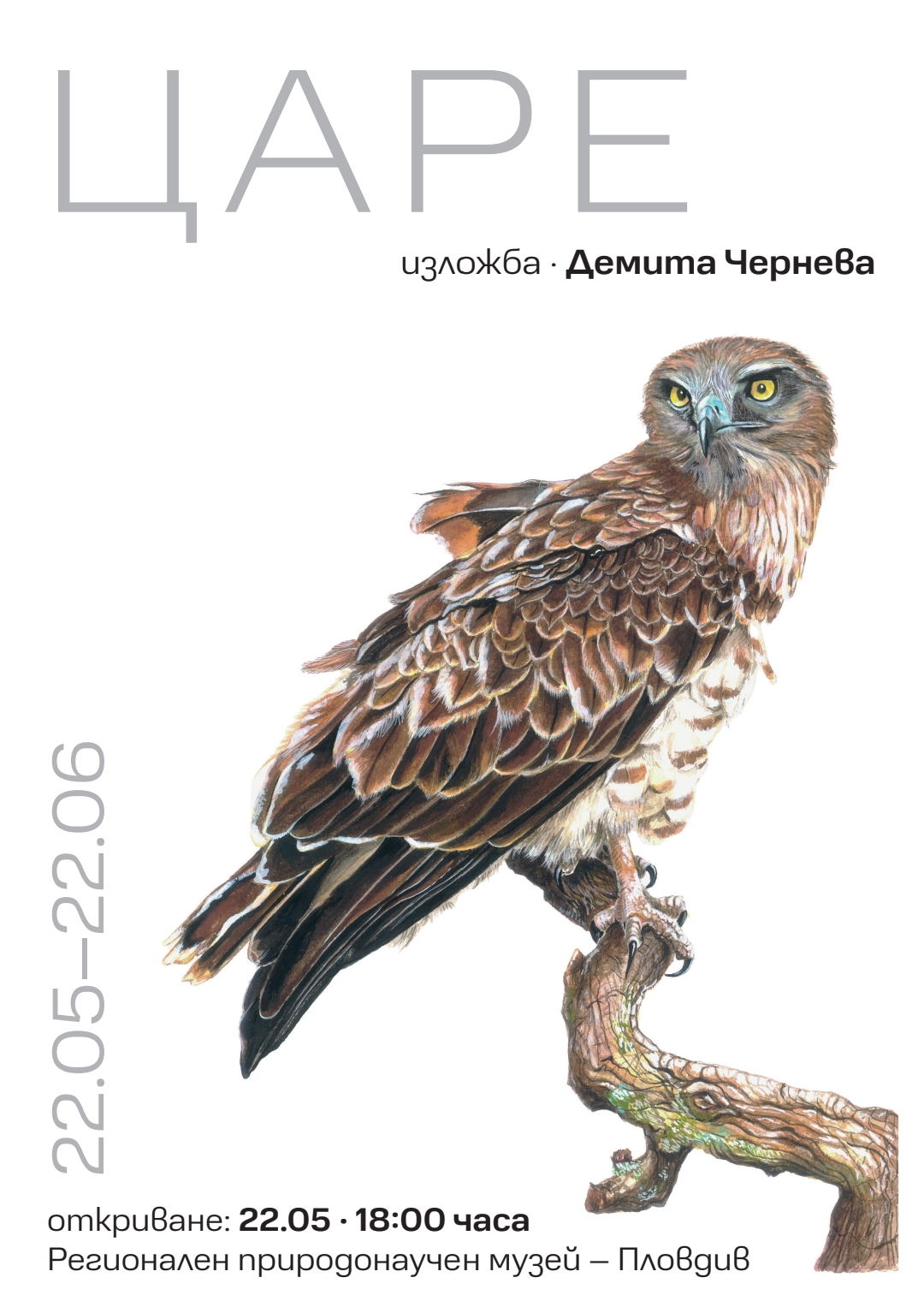 329 На 22.05.2025 (четвъртък) от 18:00 в Регионалния природонаучен музей – Пловдив ще бъде открита първата самостоятелна изложба на авторката Демита Чернева – „ЦАРЕ“. Изложбата е посветена на емблематични и редки видове хищни птици – гнездящи и срещащи се в България орли и лешояди. Серията включва 12 оригинални акварелни творби, представени с изчистена естетика и фин усет към детайла. С почти научна точност, всяка птица е изобразена в характерна поза – кацнала, в пълен покой. Изключение правят царският орел и брадатият лешояд – изобразени в полет и в по-голям мащаб, те внушават движение и сила, превръщайки се в централни акценти на експозицията. „Царе“ е повече от изложба – това е лична почит към природата, визуален архив на един застрашен свят, носеща и природозащитно послание – покана към зрителя да преосмисли крехкото равновесие между човека и дивото. Демита Чернева завършва Националната художествена гимназия „Цанко Лавренов“ в Пловдив и Националната художествена академия в София, специалност Скулптура. В последните години работи активно в областта на рисунката и акварела, като темите ѝ често се свързват с дивата природа и животинския свят. В момента работи и по международния проект Central Asian Vultures, където чрез рисунки допринася за визуалната идентичност и популяризиране на опазването на лешоядите в Централна Азия. „Царе“ е първата ѝ самостоятелна изложба, посветена изцяло на хищните птици на България. Посетителите на Музея могат да видят творбите в Изложбената зала до 22.06.2025. Откриващото събитие е с вход свободен. Може да ви хареса също Премиера в Драматичен театър Пловдив – „Дреднаути. Пиеса за женска публика“ AL BANO: Да пея на сцена като Античния театър в Пловдив е чест и вдъхновение Ансамбъл „Тракия“ с нов мащабен спектакъл, вдъхновен от река Марица България с пълен национален отбор за Европейското първенство по стрелба с лък в Пловдив