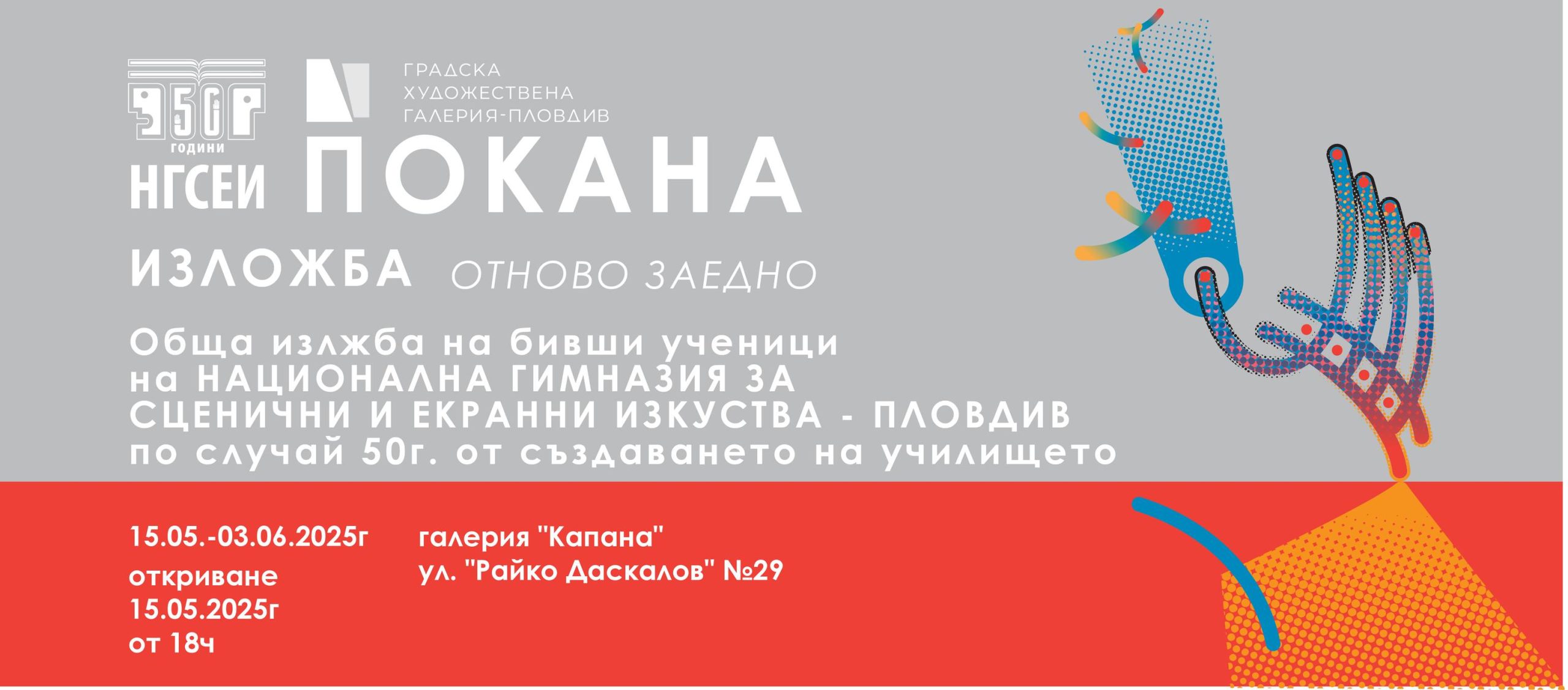 297 Няколко поколения именити творци, завършили уникалното за страната ни училище ССХУ за Сценични кадри, днес Национална гимназия за сценични и екранни изкуства в Пловдив, си дават среща в мащабна обща изложба със заглавие „Отново заедно“. Тя е посветена на 50-тата годишнина от създаването на училището и ще се открие на 15 май 2025 г., четвъртък, от 18:00 часа в галерия „Капана“ към Градска художествена галерия – Пловдив. Общо 65 творци, завършили Сценични кадри от различни випуски на гимназията, сред които и настоящият ѝ директор Николай Томов, участват със свои произведения – живопис, графика, скулптура, съвременно изкуство, видео, костюми от кинофилми, театрални кукли, фотография, бижутерия и много други форми. Изключителното разнообразие на творбите в изложбата представя постиженията на някогашните многообещаващи ученици, а днес международно признати и успешно реализирали се художници, сценографи, аниматори, режисьори, костюмографи и други. Част от тях днес предават опита си като преподаватели в специалностите: сценичен костюм, театрален, кино и телевизионен декор, художествено осветление за театър, кино и телевизия, театрална кукла, драматичен театър, куклен театър, компютърна анимация, пантомима, театрален грим и перуки. Други са поели по своя индивидуален творчески път в страната и в чужбина. Сред възпитаниците са имена като: Кольо Карамфилов, Димитър Митовски, Александър Секулов, Теодор Ушев, Владимир Зомбори, Ангел Гешев, Никола Певичаров, Розалина Панижел, Пламен Русев, Роберт Попов, Тихомир Пенов, Иван Карев, Борис Стоилов, Петко Танчев, Сотир Гелев, Кънчо Касабов, Димитър Марински, Добри Георгиев, Георги Карантилски, Ангел Тоточев и много други талантливи творци. Едва ли има истински професионалист в сферата на драматичния и кукления театър, киното, операта, балета, телевизията, който да не е чувал за легендарното пловдивско училище. Преди години Сценични кадри се помещаваше в сградата на сегашната Духовна семинария, заедно с Музикалното училище и притежаваше една особена, характерна атмосфера. Сградата, в която е в момента на ул. „Петко Д.Петков“, макар и малка, разполага с обособена специална сцена за актьорите, художествено осветление и оборудване и невероятна творческа атмосфера. С помощта на община Пловдив, училището ползва и допълнителна практическа база, която се намира в Цар Симеоновата градина, като в нея се помещават ателиета по специалните предмети. През цялата 2025 година, Националната гимназия за сценични и екранни изкуства празнува 50 години от първия училищен звънец през 1975 г. Общата изложба със заглавие „Отново заедно“ на бившите възпитаници е част от програмата на честванията. През март в галерия „Ромфея“ бе открита изложба със заглавие „Мечта“ на настоящите талантливи ученици от Гимназията. Предстоят още много събития през годината, а кулминацията ще е на 26 септември в Драматичен театър Пловдив. Изложбата „Отново заедно“ се осъществява с подкрепата на Община Пловдив. Тя е с вход свободен и ще може да бъде разгледана до 3 юни. Може да ви хареса също Премиера в Драматичен театър Пловдив – „Дреднаути. Пиеса за женска публика“ AL BANO: Да пея на сцена като Античния театър в Пловдив е чест и вдъхновение Ансамбъл „Тракия“ с нов мащабен спектакъл, вдъхновен от река Марица България с пълен национален отбор з