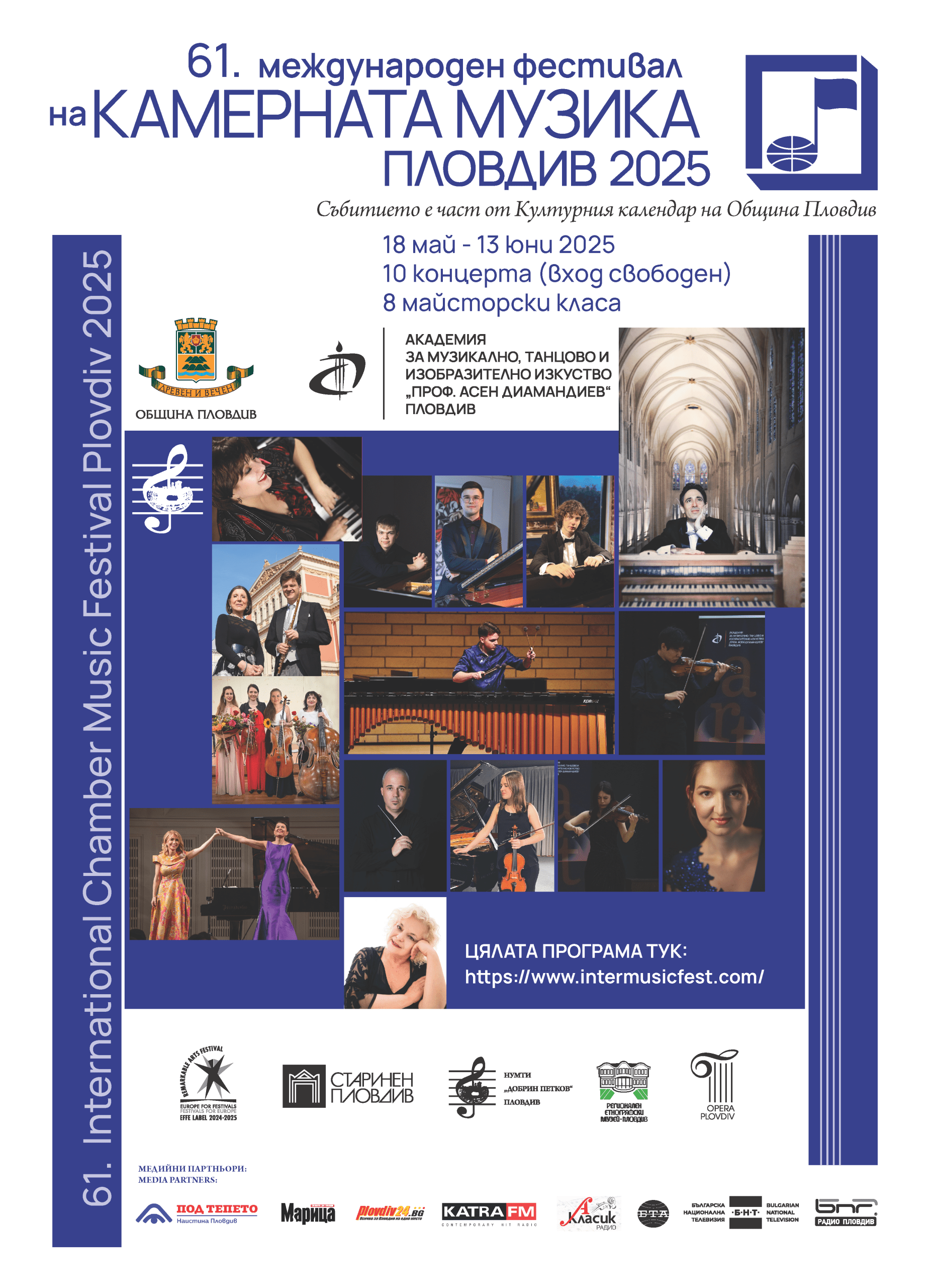 407 На 18 май от 19,30 ч. в емблематичното пространство на Регионален етнографски музей Пловдив стартира 61-то издание на Международен фестивал на камерната музика Пловдив 2025 г. Събитието се осъществява с подкрепата на община Пловдив и е част от Културния календар на града. Тази година всички концерти – общо 10, са с вход свободен! „В първата година на седмото си десетилетие Фестивалът продължава традицията на елитно българско и международно участие, обогатявайки палитрата на афиша си с не толкова често застъпените инструменти: орган и маримба, акцентирайки върху еволюционното набъбване на камерния ансамбъл „Академия музика Пловдив“ в камерен оркестър и значителното разрастване на майсторските класове. С увереност и надежда за успешно 61-во издание – на добър час!“ споделя Артистичният директор на фестивала, проф. д-р Евгений Шевкенов. Новост тази година е и приобщаването на още едно чудесно градско пространство сред локациите, на които ще има концертни прояви – Късноантична сграда „Ирини“ – пешеходен подлез „Археологически“. Програмата на 61-ия фестивал започва с юбилеен концерт „80 години НУМТИ „Добрин Петков“ Пловдив“. На 20 май е клавирният калейдоскоп на Борислава Танева и нейните възпитаници Николай Маринов, Ивайло Василев, Ангел Ялъчков, който ще се състои в концертната зала на Академията. На 22 май, отново в концертната зала, е предвиден един впечатляващ органов концерт, посветен на 340 години от рождението на Бах. Гост-изпълнител е Венсан Дюбоа. Селекцията продължава с концерта на Карлхайнц Шютц, флейта и Мария Принц, пиано, който е предвиден за 28 май в АМТИИ. Следват двата концерта в късноантична сграда „Ирини“, които се реализират в партньорство със ОИ „Старинен Пловдив“, и които представят, на 30май, Квартет АRTE – Десислава Петева, флейта; Демна Гигова, виола; Теодора Атанасова, виолончело; Петя Бъговска, контрабас и на 1 юни – Ивайло Койчев, маримба. Юнските дати във фестивалната програма продължават със станалия традиционен концерт „Звездите на утрешния ден“, който на 3 юни ще срещне публиката с най-младото поколение виртуозни изпълнители: Михаил Гаврилов, цигулка и Ивана Говедарска-Ролдау, пиано. На 5 юни е премиерата на камерния оркестър „Академия Музика Пловдив“ с диригент Хуан Хосе Наварро, с участието на цигуларките Дуня Наварро и Мария Джуклеска, които ще се проведат в концертната зала на АМТИИ. Там, на 10 юни е и вокалният концерт на Зоряна Кушплер, мецосопран и Донка Ангъчева, пиано. Закриването на фестивала е с клавирния концерт на Чинция Бартоли, посветен на 150 години от рождението на Морис Равел и ще бъде в пространството на Етнографския музей в Пловдив. Програмата на фестивала и тази година е отличена с знака на Европейската фестивална асоциация. Началото на всички концерти е 19,30 ч. и публика ще се допуска до изчерпване на свободните местата. Ректорът на АМТИИ, доц. д-р Жан Пехливанов споделя: „Специално е летоброенето на Международен фестивал на камерната музика Пловдив – то отброява неизчерпаема енергия, върховно майсторство, изключително вдъхновение! И така 61 години! Събитието е една от творческите емблеми на града ни, перла в културната карта на Европа и за Академия за музикално, танцово и изобразително изкуство „Проф. Асен Диамандиев“ е изключителна чест да бъде организатор, пазител и иноватар, на т