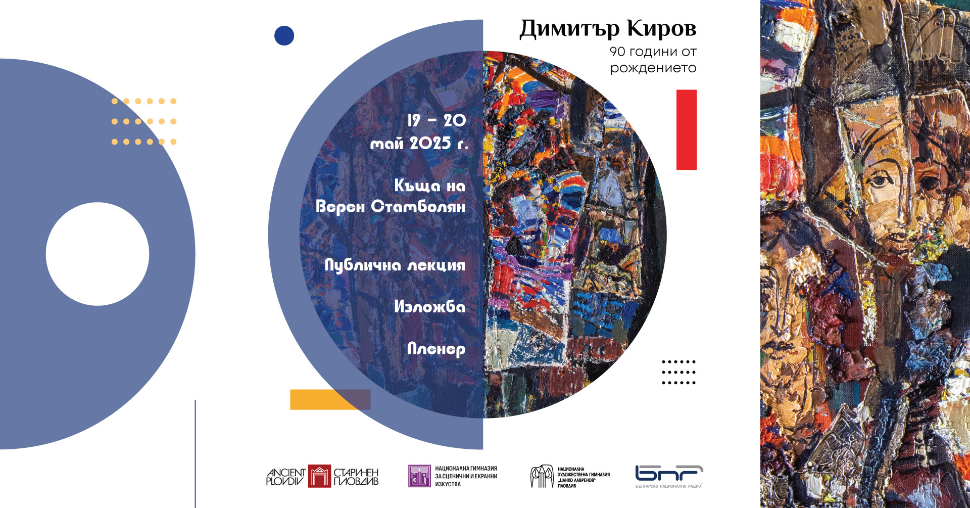 486 Общински институт „Старинен Пловдив“ отбелязва годишнината с пленер, изложба и публична лекция на проф. Галина Лардева с вход свободен Общински институт „Старинен Пловдив“ отбелязва 90 години от рождението на големия български художник Димитър Киров – ДиКиро с поредица от събития. На 19 и 20 май 2025 г. в Къщата на Верен Стамболян, където е Постоянната експозиция на ДиКиро, ще се проведе живописен пленер с участието на ученици и преподаватели от Националната художествена гимназия „Цанко Лавренов“ и на Националната гимназия за екранни и сценични изкуства – Пловдив. На 20 май 2025 г. (вторник) от 16:30 ч. в Къщата на Верен Стамболян е откриването на фотоизложбата „Изкуството на ДиКиро в градска среда“, която представя негови монументални произведения в града. В рамките на откриването е публичната лекция с вход свободен на изкуствоведа проф. Галина Лардева, посветена на творчеството на художника и контекста на времето, в което той твори. Като част от лекцията посетителите могат да чуят гласа на големия български живописец, който разказва как се рисуват пловдивските къщи и защо с изкуството не може да се флиртува. Записът е от интервю на твореца, специално предоставено на Института от Златния фонд на Българското национално радио. В Къщата на Верен Стамболян посетителите могат да се насладят и на постоянната експозиция на твореца, която включва най-добрите образци по теми и етапи от творчеството му и мозайки, вдъхновени от любимите му градове Пловдив, Париж и Истанбул, както и творби от ателието му, предоставени специално за годишнината от неговата муза и спътница в живота – Русалия Кирова Може да ви хареса също Откриване на изложбата „Живот“ на Цветан Узунов в Регионален природонаучен музей – Пловдив Подари книга за Коледа: Драматичен театър – Пловдив стартира благотворителна инициатива Невена Цонева и Баш Бенд канят пловдивчани на незабравимо музикално пътешествие ЗАЕДНО Малки и големи се събират в Дома на науката и техниката за ФУЗА: Фестивал за Устойчиво знание и артистичност