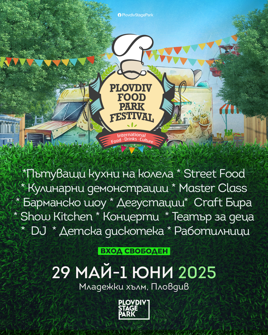 264 От днес до неделя започва най-очакваният- Plovdiv FOod Park FEstival,предлагащ с интернационални вкусове, мобилни кухни на колела, готварски демонстрации, готварски клас, бармански миксове, занаятчийски бири и разбира се много музика. Стартът на събитието ще бъде поставен в 17:00ч. с представяне на разнообразието от участници, представящи апетитни рецепти от цял свят. Публиакта ще опита традиционни тайвански ястия, португалски специалитети, корейски вкусове, традиционна италианска кухня, белгийски вафли,американски бургери и грил. Още тази вечер с ВХОД СВОБОДЕН от 21:00ч. на сцената излизат Sen I & the Roots Rocket feat. Jаhmmy, Bibi and Daria! Една от най-успешните реге банди, прославили България по целия свят с таланта и опита си в жанра с внушителния си състави музика ще гарантират доброто настроение на публиката. Петъчната сцена (30 май) ще бъде посветена на рока, защото на сцената излиза пловдивската банда Richard Manta. През уикенда напреднали и начинаещи кулинари ще застанат рамо до рамо с шеф Даниела Рей, за да се включат в Мастър клас “Вкусове от Азия”, по време на който ще придобият нови умения под ръководството на шеф готвача. Вечерната програма ще бъде под звуците на вечни хитове с музикално бинго и награди, диджеи до края на вечерта и късно излъчване на футболния шампионат в една от зоните на фестивала. Барманско шоу с цветни коктейли, джин бар и разнообразие от занаятчийски бирени вкусове ще допълват настроението на събитието, а съпровода на зоната за храна и напитки ще бъде поднесен от селекция диджеи. На 1-ви юни празнуваме децата с богата детска програма, палачинки за закуска, творчески ателиета, работилници, театрално-марионетно шоу, прясно изцедени сокове и детска дискотека с много танци, подаръци …и вкусен сладолед 🙂 Овкусен със сол-пипер, аромат на мента, карамел и хмел – Plovdiv FOOD Park те очаква на Младежки хълм от днес до неделя. Може да ви хареса също AL BANO: Да пея на сцена като Античния театър в Пловдив е чест и вдъхновение Ансамбъл „Тракия“ с нов мащабен спектакъл, вдъхновен от река Марица България с пълен национален отбор за Европейското първенство по стрелба с лък в Пловдив Регионален етнографски музей – Пловдив с работилници за мартеници