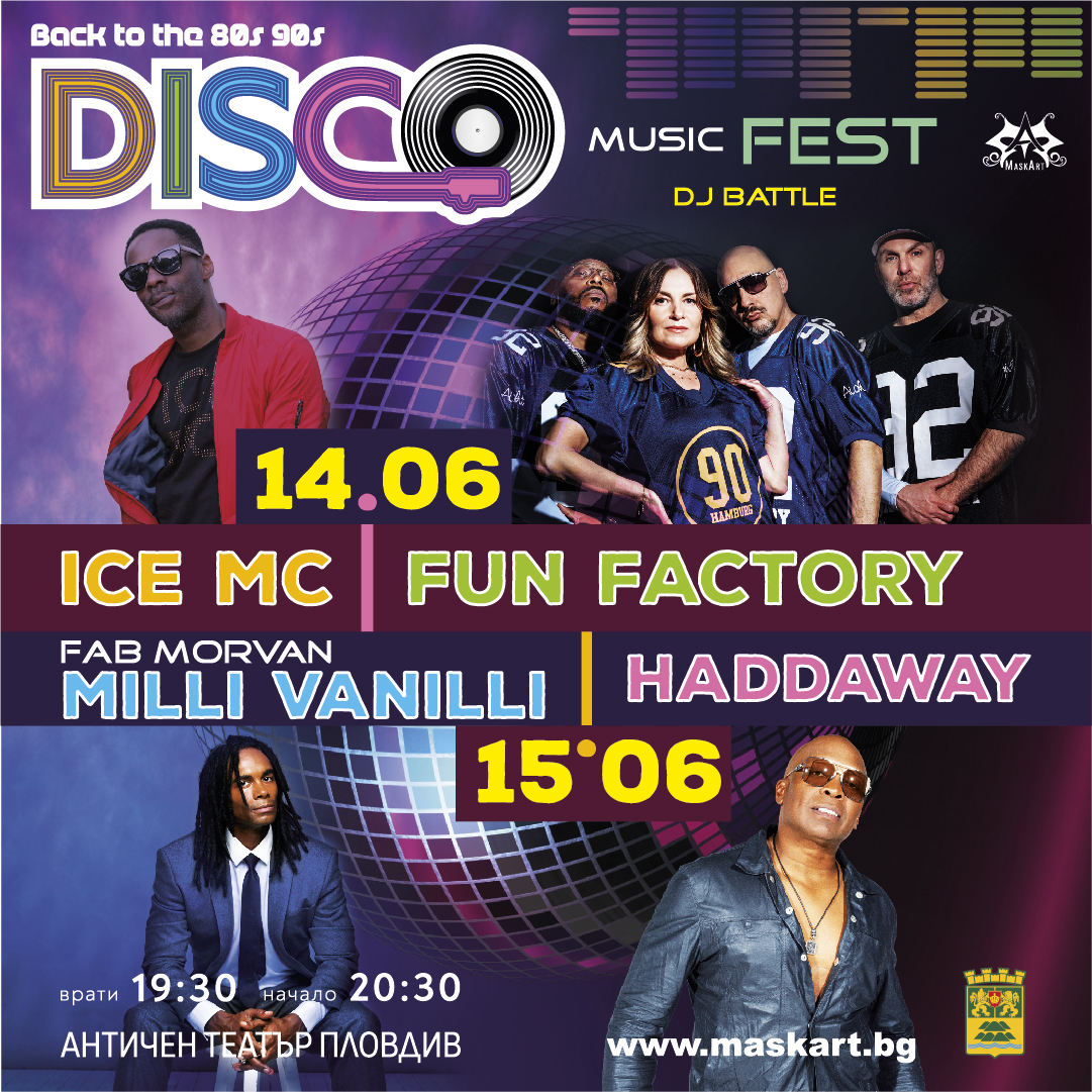 643 За трето издание на Disco Music Fest: Back to the ’80s (’90s) в Пловдив пристигат легендите Ice MC, Fun Factory, Fab Morvan/Milli Vanilli и Haddaway. В две поредни вечери 14 и 15 юни 2025г., фестивалът Disco Music Fest: Back to the ’80s (’90s) отново ще превърне Античния театър в Пловдив в неповторима дискотека на открито. Култовото събитие се случва за трета, поредна година с подкрепата на община Пловдив и е част от Културния календар на града за 2025 г. Изданията до момента са доказателство, че диското не е изчезнало – напротив, то преживява един нов период на възход и модификация и в никакъв случай не е за подценяване. Публиката все още пази вълнуващи спомени от гостувалите в предните две издания – La Bouche, Kool & The Gang, East 17, Snap, No Mercy rDr. Alban. Тази година за диско феста на Античния театър пристигат легендите Ice MC, Fun Factory, Fab Morvan/Milli Vanilli и Haddaway. Старт на фестивала на 14 юни ще дадат ICE MC и FUN FACTORY. Иън Кембъл, известен с псевдонима си Ice MC, е британски хип-хоп и евроденс изпълнител от ямайски произход. През 1989г. се запознава с италиански музикален продуцент и записва дебютния си сингъл „Easy“. През 1993г. Ice MC започва да работи съвместно с певицата Алексия. Заедно с нея записва някои от най-успешните си хитове, сред които са „Take Away the Colour“, „Think About the Way“ и най-вече – „It’s a Rainy Day“. Ice MC се прочу като пионер в смесването на жанра евроденс с рапиране в raggamuffin стил и дамски хорови вокали. Именно той беше предопределен да върне хип хауса и рага в челните списъци на световните класации, съчетавайки традиционни ямайски ритми „а ла Боб Марли“ и модерен електронен звук. Днес хитовете му се смятат за златната класика на евроденса от 1990-те. Fun Factory завладя класациите през 90-те години и повлия на цяло поколение със своята изключително експлозивна комбинация от поп, денс, рап, техно и реге елементи, групата. Fun Factory имат над 7 милиона продадени сингъла и албума по целия свят. Германската евроденс група се радва на голям успех – сингъл след сингъл, клип след клип, постепенно набира огромна популярност, печелейки фенове не само в Германия, но и по целия свят. Групата издава албума Non Stop!, върху който работи две години, а по-късно този албум беше преиздаден под новото име Close to You. Fun Factory се ражда от желанието на четирима души да правят музика. Годината на създаването е 1992г., когато към състава се присъединяват музикантите: Balca, Steve, Rod D. и Smooth T. Още в годината на създаване на групата, те успяват да запишат първия сингъл Fun Factory’s Theme. Сред тези песни: Take Your Chance, Close to You и др. Fun Factory имаха периодични прекъсвания, промени в членовете, но групата успя да се събере и да покорява сцени и до днес. А популярността му се доказва от факта, че към 2016 г. екипът е продал над 22 милиона копия от колекции. На 15 юни диско фестивалът продължава с FAB MORVAN от Milli Vanilli и HADDAWAY. Milli Vanilli (Мили Ванили) е германско-френски ритъм енд блус дует от Мюнхен, Германия. Групата е основана от Франк Фариан през 1988 г. и се състои от Фаб Морван и Роб Пилатус. Milli Vanilli са изключително успешна музикална група в края на 80-те с хитовете си „Girl You Know It’s True“, „Blame it on the Rain“ и „Girl I’m Gonna Miss You“. Постоянно са излъчвани по MTV и дори печелят награда Грами за най-добър нов изпълнител през 1990г. Но всичко се срива през ноември същата година, когато Морван и Пилатус потвърждават упоритите слухове, че не пеят наистина в песните си. Дуото е принудено да върне спечелените награди. Цялата история е разказана в документалния ф