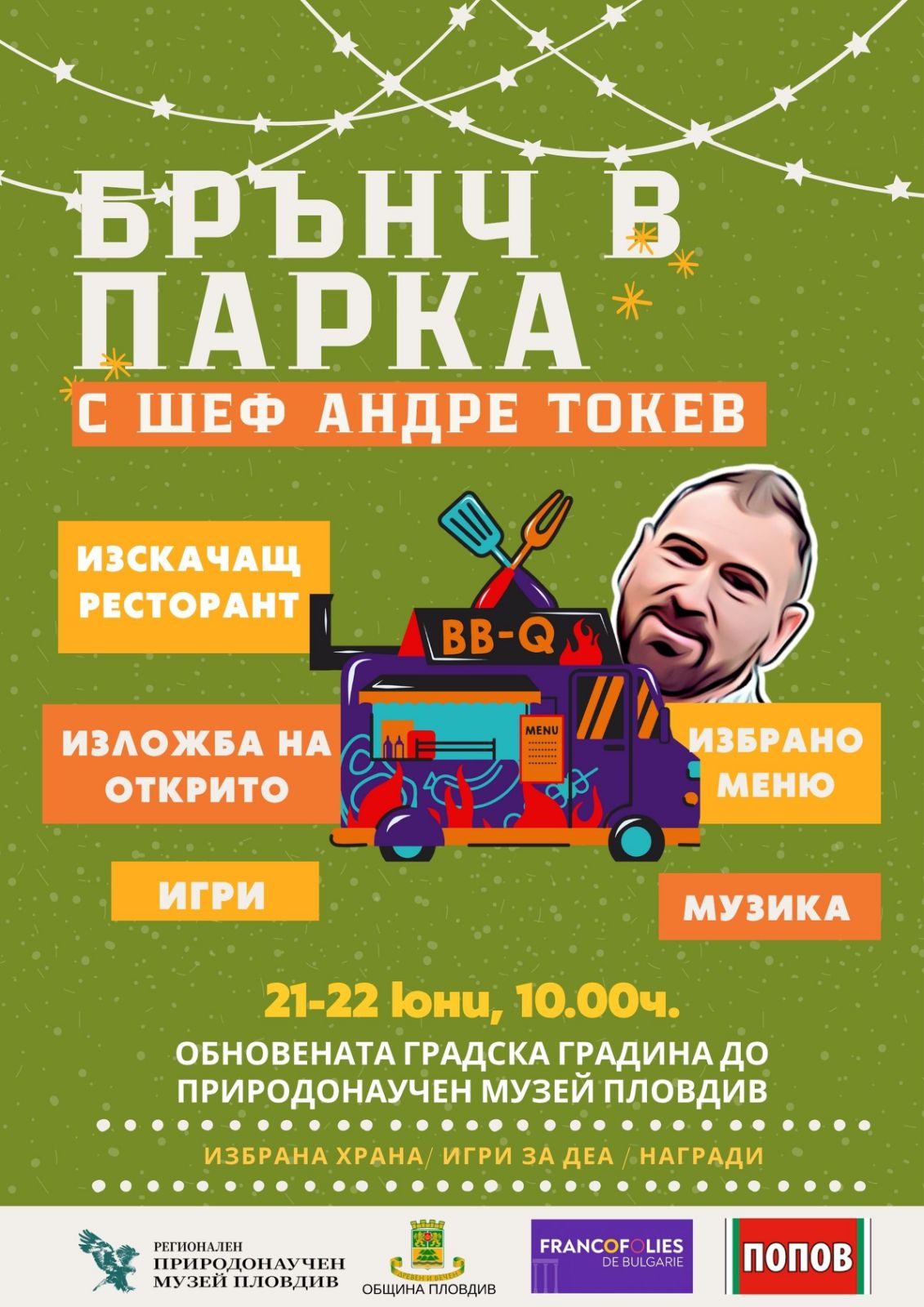 394 Регионалния природонаучен музей – Пловдив се включва като партньор и съорганизатор на събитиео „Брънч в парка с шеф Андре Токев“ (част от фестивала Франкофоли), което ще се състои на открито пред зала „Лотос“ и в парк „Дондукова градина“на 21 и 22 юни 2025. Организаторите от изскачащия ресторант The Kitchen Freaks са подготвили специално брънч меню, а шеф Андре Токев ще предложи приготвени на място ястия с продукти на колбасарска работилница „Попов“. Музеят организира за малките посетители интересна образователна игра „Търсене на съкровища от природата“. Участниците ще се включат в едно истинско приключение с гатанки, скрити животни и награди в парк „Дондукова градина“. Участието в играта е безплатно и ще се проведе на три групи и през двата дни. Часовете, в които стартира Лова на съкровища, са: 10:00, 13:00 и 16:00. Заниманието ще бъде с продължителност около 1 час, а всички участници ще получат специални награди от Музея! На 21.06.2025 от 10:00 ще бъде изтеглена томбола за 5 двойни билета за фестивала Франкофоли, в която могат да участват всички посетители на Музея, които са подали своето заявление за участие в томболата в седмицата преди събитието, и присъстват на тегленето пред зала „Лотос“. Партньори на събитието са още Район Централен и Дружеството на пловдивските художници. Може да ви хареса също AL BANO: Да пея на сцена като Античния театър в Пловдив е чест и вдъхновение Ансамбъл „Тракия“ с нов мащабен спектакъл, вдъхновен от река Марица България с пълен национален отбор за Европейското първенство по стрелба с лък в Пловдив Регионален етнографски музей – Пловдив с работилници за мартеници