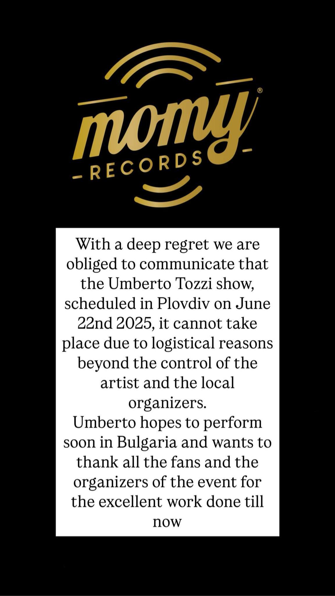 539 ВАЖНО СЪОБЩЕНИЕ от името на артиста @Umberto Tozzi Official и местния организатор „МаскАрт”: „С дълбоко съжаление сме длъжни да съобщим, че концертът на Умберто Тоци, планиран в град Пловдив на 22 юни 2025г., не може да се състои поради логистични причини, извън контрола на артиста и местния организатор. Умберто се надява скоро да се изяви в България и иска да благодари на всички фенове и организаторите на събитието за отлично свършената работа досега“. Всички закупени билети може да върнете и да възстановите сумите по тях от понеделник – 23.06.2025г. Можете да възстановите сумите за закупените от Вас билети, по начина и от местата, по които и откъдето сте ги купили. Сумите за билетите, закупени посредством партньорската мрежа на Eventim.bg, се възстановяват от конкретния обект, от който са закупени. В случай, че са закупени от сайта на Eventim.bg: – с кредитна карта – трябва да се изпратят до централния офис на Eventim или да ги върнат лично и до 7 работни дни ще бъде възстановена сумата по кредитната карта, с която са закупени. – с наложен платеж или по банков път – зрителите трябва да върнат билетите си по пощата с банкова сметка, по която да бъде възстановена сумата, заедно с име на титуляр на сметката и телефон за връзка. Могат да се върнат и в централния офис на Eventim bg, намиращ се на ул. „6-ти септември“ 58, където ще бъде възстановена сумата в брой. Приемете нашите извинения за причиненото неудобство! С уважение „МаскАрт” ЕООД Umberto Tozzi Official Може да ви хареса също Виртуозният пианист Монах Авел, превърнал изкуството в молитва, за първи път с концерт в Пловдив Латино джаз вулкан избухва в Пловдив: Dan Costa Quartet свири в Клуб В Джаза С награждаване и откриване на изложба приключва VIII Национален ученически конкурс Плакат – Костадин Отонов 2025 г. БГ ДУЕТЪТ представя Коледен концерт в Пловдив