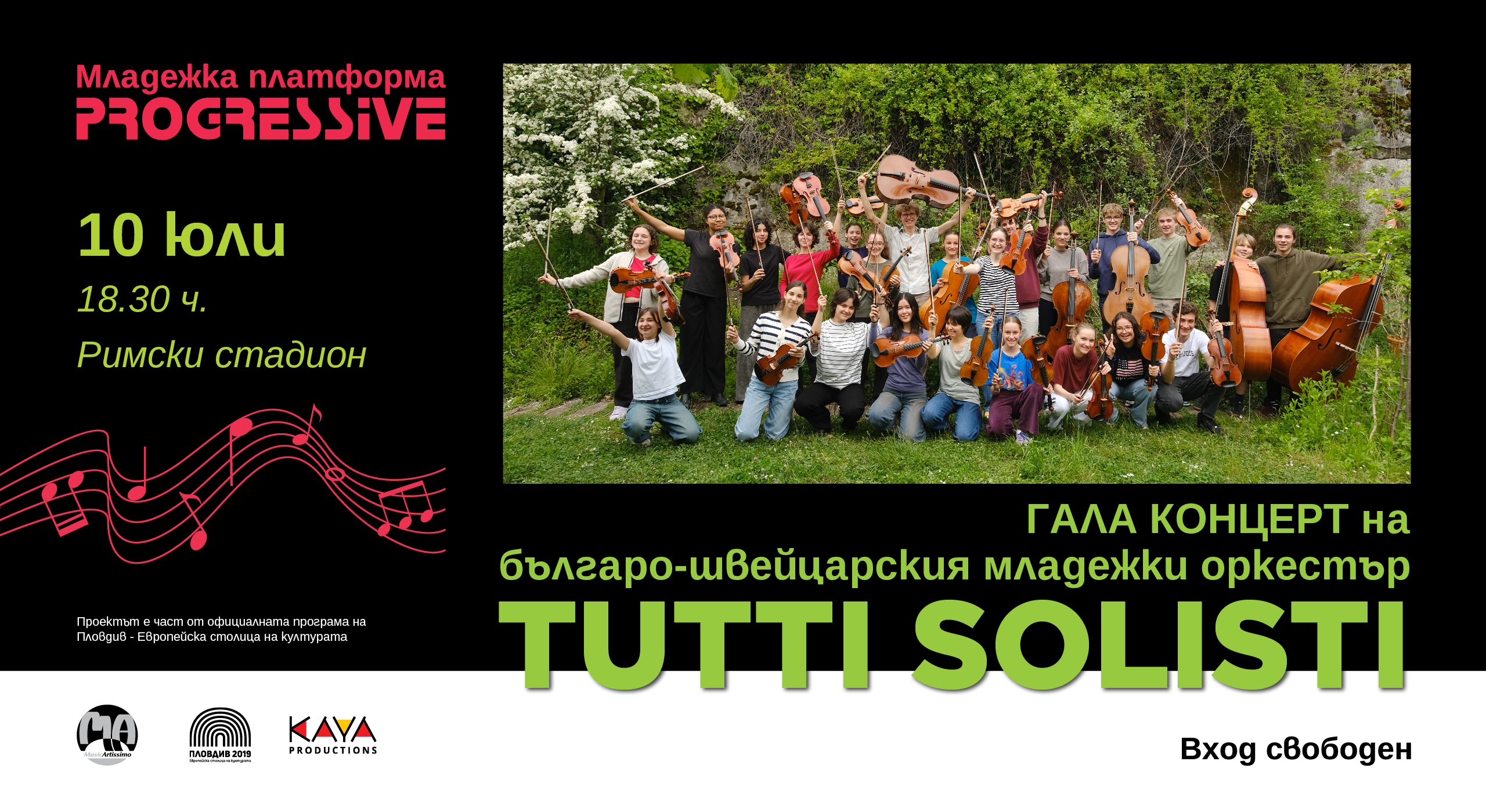 513 Проектът „Младежка платформа PROGRESSIVE-Гала концерт на българо-швейцарския младежки оркестър TUTTI SOLISTI” представя международния младежки оркестър TUTTI SOLISTI, съставен от талантливи музиканти от Швейцария и България на възраст от 9 до 18 години. Швейцарските участници се обучават в консерваториите в Лозана и Сион (Швейцария) и са ръководени от изтъкнатата цигуларка Деница Казакова, а българските участници са част от ансамбъл „Концертино”, създаден през 2016 г. към НУИ „Панайот Пипков” – гр. Плевен на основата на ансамбъл от малки цигулари от класа на Елена Николова. Оркестърът се отличава с уникалния си репертоар, който варира от бароковата до съвременна музика и включва не само оригинални произведения, но и аранжименти за солист и струнен оркестър на концерти и пиеси, написани за солист и голям симфоничен колектив. Всички негови членове са едновременно солисти и оркестрови музиканти, откъдето идва и името Tutti solisti. Младите оркестранти получават своята подготовка по време на уроци с изтъкнати преподаватели от България и Швейцария, като кулминацията на усилената им работа е ГАЛА Концертът на 10 юли 2025 г. от 18.30 ч. на Римския стадион в гр. Пловдив. Входът е свободен! Проектът предоставя безценната възможност на български и швейцарски таланти да свирят заедно и да получат подготовка от именитите педагози Паскал Десарзан (професор в консерваторията в Ню Шател, Швейцария), Деница Казакова (професор в консерваторията в Лозана, Швейцария), Елена Николова (преподавател от НУИ „П.Пипков”) и др. Представянето на оркестър от съвсем млади изпълнители от България и Швейцария, които музицират заедно на много високо ниво, представлява мощна притегателна сила и стимул за по-нататъшното развитие и реализация на техните връстници в цялата страна. Проектът е част от Официалната програма на Пловдив – Европейска столица на културата и се осъществява с финансовата подкрепа на фондация “Пловдив 2019” и фондация “Музикартисимо”. Може да ви хареса също AL BANO: Да пея на сцена като Античния театър в Пловдив е чест и вдъхновение Ансамбъл „Тракия“ с нов мащабен спектакъл, вдъхновен от река Марица България с пълен национален отбор за Европейското първенство по стрелба с лък в Пловдив Регионален етнографски музей – Пловдив с работилници за мартеници