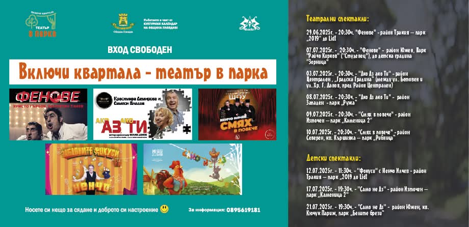 511 „Включи квартала – Театър в парка“ отново гостува в град Пловдив. Ще ви очакваме в парк „Каменица“ на 09 юли от 20:30 ч. с представлението „Смях в повече“. На 17 юли от 19:30 ч. ще може да гледате „Само не Аз“. Вход свободен. Заповядайте! Носете си нещо за сядане и доброто си настроение. Събитието е част от Културния календар на Община Пловдив. Може да ви хареса също Танцово студио DS Magnifique кани на празнична Коледна гала вечер с два концерта От класната стая до книжния рафт: 11-класникът Крис Каблешков представя дебютния си роман „Мадам Маделин Де Фредерикас“ С шествие в Стария град отбелязват еснафския празник на 12 декември Българското гайдарство влезе в Списъка на нематериалното културно наследство на ЮНЕСКО