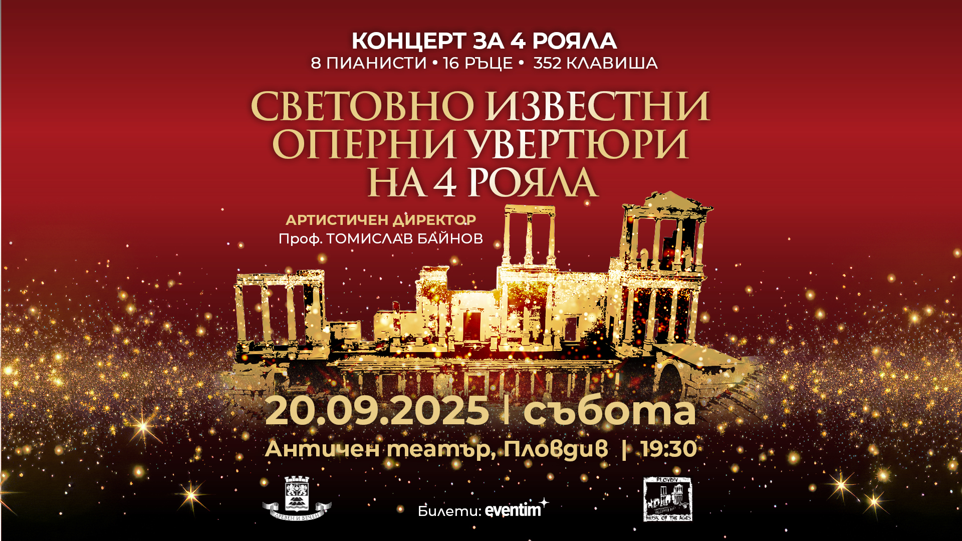 571 Пиано – оркестър от 8 международни виртуозни пианисти от 5 държави ще превърнат четири рояла в могъщ оркестър, изпълнявайки някои от най-популярните оперни увертюри в историята на музиката. Единственият по рода си концерт под звездите „Световно известни оперни увертюри на 4 рояла“ в изпълнение на Baynov-Piano-Ensemble на проф. Томислав Байнов и неговия клавирен ансамбъл ще зарадва пловдивчани и гости на града на 20 септември 2025 г. (събота) от 19:30 ч. в магичната атмосфера на Античен театър в Пловдив. Baynov-Piano-Ensemble създава специални проекти с произведения, които се изпълняват на много ръце — от „Шест ръце на един роял“ до грандиозни постановки за осем рояла и шестнадесет пианисти. Ансамбълът е гостувал на престижни сцени в Германия, Италия, Канада, Словакия, Хонг-Конг, Сърбия, Чехия, Швейцария и Китай, има над 15 диска и десетки телевизионни и радио записи. На 20 септември публиката ще има възможността да се потопи в шедьоври на световната музикална класика. В програмата са включени увертюри и откъси от опери на Моцарт, Бетовен, Вагнер, Чайковски, Росини, Бизе, Глинка, Франц фон Супе и Шарл Гуно, специално аранжирани за изпълнение на осем ръце върху четири рояла – това прави общо 16 виртуозни ръце, които ще интерпретират музика на 352 клавиша! Солисти на концерта в Пловдив ще бъдат: Томислав Н. Байнов (България/Германия), Даниела Манусарди (Италия), Зузана Суханова (Словакия), Соня Ашкар (Германия), Луиджи Казели (Италия), Тинг Йоен (Китай/Германия), Светлана Аннатоли (Германия/Канада) и Хайнрих Байзе (Германия). Организатор и продуцент е „Блу Хилс“. Концертът е включен в Културния календар на град Пловдив и е част от форума Music of the Ages 2025. Идеолог и създател на проекта е българският пианист и педагог професор Томислав Неделкович Байнов. Той е роден през 1958 г. в София в семейство на музиканти. Започва да свири едва четиригодишен и на шестгодишна възраст печели първа награда в Националния конкурс за пиано „Светослав Обретенов“. Байнов следва при проф. Константин Ганев и Джулия Ганева в държавната музикална академия в София. През 1981 г. продължава развитието си във Виена и Париж, а в края на същата година се установява в Германия, където следва, печели множество интернационални награди, концертира, работи усилено и реализира творческите си идеи. През 1989 г. в Германия проф. Байнов основава клавирния ансамбъл Baynov-Piano-Ensemble, който се посвещава на преоткриването и популяризирането на клавирната литература от 6 до 32 ръце! Оттогава ансамбълът концертира неуморно с програми за 6 и 8 ръце, както и с постановки на 4, 6 и 8 рояла до 32 ръце. През 1998 г. Байнов е назначен за професор в Държавния музикален университет в Тросинген, Германия. През 1999 г. става професор. Освен че преподава, композира и подготвя концерти, той е и артистичен директор на редица музикални форуми в Германия. Възпитан и изграден като изпълнител в традициите на българската и немската клавирни школи, проф. Байнов впечатлява с богат репертоар, обхващащ над 40 клавирни концерта и многобройни солови и камерни произведения. Концертира на пет континента, а дискографията му включва студийни записи и изпълнения на живо, предавани по цял свят. Билетите са в продажба в системата на Eventim, на касите в Пловдив – Билетен център пред Община Пловдив, каса „МаскАрт“ в ДК „Борис Христов“, в Туристически информационен център на п