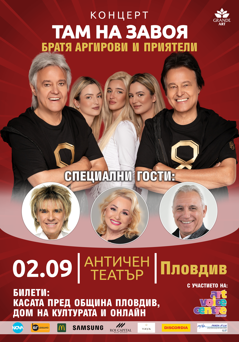 697 На 2 септември 2025г., почетните граждани на Пловдив – братята Благовест и Светослав Аргирови, ще изнесат за първи път свой самостоятелен концерт на най-престижната сцена под тепетата – Античния театър. Началото е в 20.00 часа. В спектакъла „Братя Аргирови и приятели“ ще чуем както любимите танцувални хитове, запазена марка на обичаните близнаци, така и ще се насладим на изпълнения на техните специални гости и приятели – Васил Найденов и Тони Димитрова, които са сред безспорните любимци на публиката. Още един почетен гражданин на Пловдив ще бъде специален гост на концерта – великият футболист Христо Стоичков, който за първи път ще представи в Пловдив биографичната си книга и ще раздава автографи след концерта. В „Там на завоя“ – „Братя Аргирови и приятели“ на 2 септември участие ще вземе и новата вокална група на Братя Аргирови – талантливите момичета от Хисаря – Нина, Наталия и Борислава. Братята ги срещат случайно в Зала 1 на НДК през април, по време на концерта на Мими Иванова, където те изпълняват „Песен за Хисаря“ и ги канят да се включат като вокална група в лятното им турне. Момичетата ще чуем и със самостоятелно изпълнение. Поредното доказателство, че Благовест и Светослав подават ръка на млади таланти е и участието на деца от пловдивската музикална школа „Арт Войс Център“ с ръководител Руми Иванова. Билети за концерта „Там на завоя“ – „Братя Аргирови и приятели“ се продават в Билетен център пред община Пловдив, Дом на културата „Борис Христов“, Туристически информационен център на пл. Римски стадион, каса на Античен театър и мрежите на Купи Билети, Грабо и Ивентим. Може да ви хареса също AL BANO: Да пея на сцена като Античния театър в Пловдив е чест и вдъхновение Ансамбъл „Тракия“ с нов мащабен спектакъл, вдъхновен от река Марица България с пълен национален отбор за Европейското първенство по стрелба с лък в Пловдив Регионален етнографски музей – Пловдив с работилници за мартеници