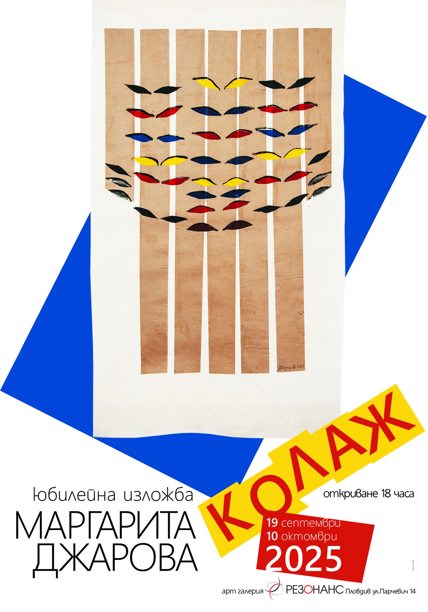 419 Галерия „Резонанс“ кани пловдивчани и гости на града на юбилейна изложба „Колаж“ на известната пловдивска художничка Маргарита Джарова, по повод нейния 75-годишен юбилей. Няколко ключови неща бележат творчеството и жизнения път на Маргарита Джарова и стават крайъгълен камък, върху който тя надгражда с таланта си десетилетия, посветени на изкуството. Събитието е на 19 септември, петък, от 18.00 часа в пространството на галерия „Резонанс“. Колажът. Тя е сред малкото български автори, които се занимават активно с техниката на колажа. Нейна е идеята и амбицията да бъде създаден Музей на колажа в Пловдив, което за пореден път доказва нейната отдаденост към този вид изкуство. Стенописите. Джарова има реализирани няколко фрески в техниките секо и сграфито. Проектът „Арт колаж“. Тя е ръководител на този проект от много години, като в него са участвали художници от четири континента. Проектът се радва на голям успех и е допринесъл за популяризирането на колажа като форма на изкуство. Дългогодишна преподавателска дейност. Като дългогодишен директор и преподавател в НХГ „Цанко Лавренов“ Пловдив, Маргарита Джарова е обучавала поколения млади художници. Маргарита Джарова е родена на 04.05.1950г., през 1975 завършва Стенопис в ателието на доц. Никола Гелов – ВТУ. От 1975 става член на Дружество на пловдивските художници. От 2001 г. е Почетен член на „Аrtcolle“ – Сержин, Франция. От 2012 е член на Дружество на бургаските художници. От 1992 –2011 е директор на НХГ ”Цанко Лавренов” Пловдив. От 1975 година участва в над 100 общи, групови, национални и международни изложби, представя 15 самостоятелни изложби, изпълнява 7 стенописа в техниката секо и сграфито, Участва в 7 Международни изложби на колажа в Париж, в 16 национални и международни пленери и симпозиуми и получава 8 награди от МОН, МК,ДПХ и Салон на колажа Париж. От 2000г. до 2017г. организира 20 изложби по проекта Арт колаж Пловдив, от тях – 9 международни симпозиума, включващи работен процес при отворени врати, срещи и обсъждане на колажа в литературата и изкуството. Организира 9 Национални изложби Арт колаж. През 2000г. открива изложба Колаж на почетния гост Георги Божилов Слона/България/ и Марлена Рати/Италия/. Творбите на Маргарита Джарова са притежание на Национална художествена галерия – София, Държавна художествена галерия – Пловдив, Музея на колажа “Artcolle”- Франция, частни колекции в София, Пловдив, Габрово, Санкт Петербург, Минск, Лайпциг, Брюксел, Лиеж, Тервюрен, Париж, Нова Зеландия. Изкуството на Маргарита Джарова е ярко и запомнящо се. Тя е един от най-характерните съвременни български художници. Темите, материалите, изразните средства, които използва, за да реализира идеите си са изключително разнообразни. Преди години тя се изявяваше като артист, който овладява големи пространства. Голямоформатните й композиции носят нещо от духа на модернизма в неговите най-добри, класически образци. Пространствените форми градят хармония която се базира на мелодичността както на линията, така и на цвета. Художничката последователно започва да създава композиции от хартия – в началото лаконични и опростени, а по късно – все по детайлизирани и обогатени от цвета. Нейните колажи са нещо подобно на застинали фрагменти музика. Търсенията й винаги са били в посока на универсалната хармония. Точно тази концептуална линия пра