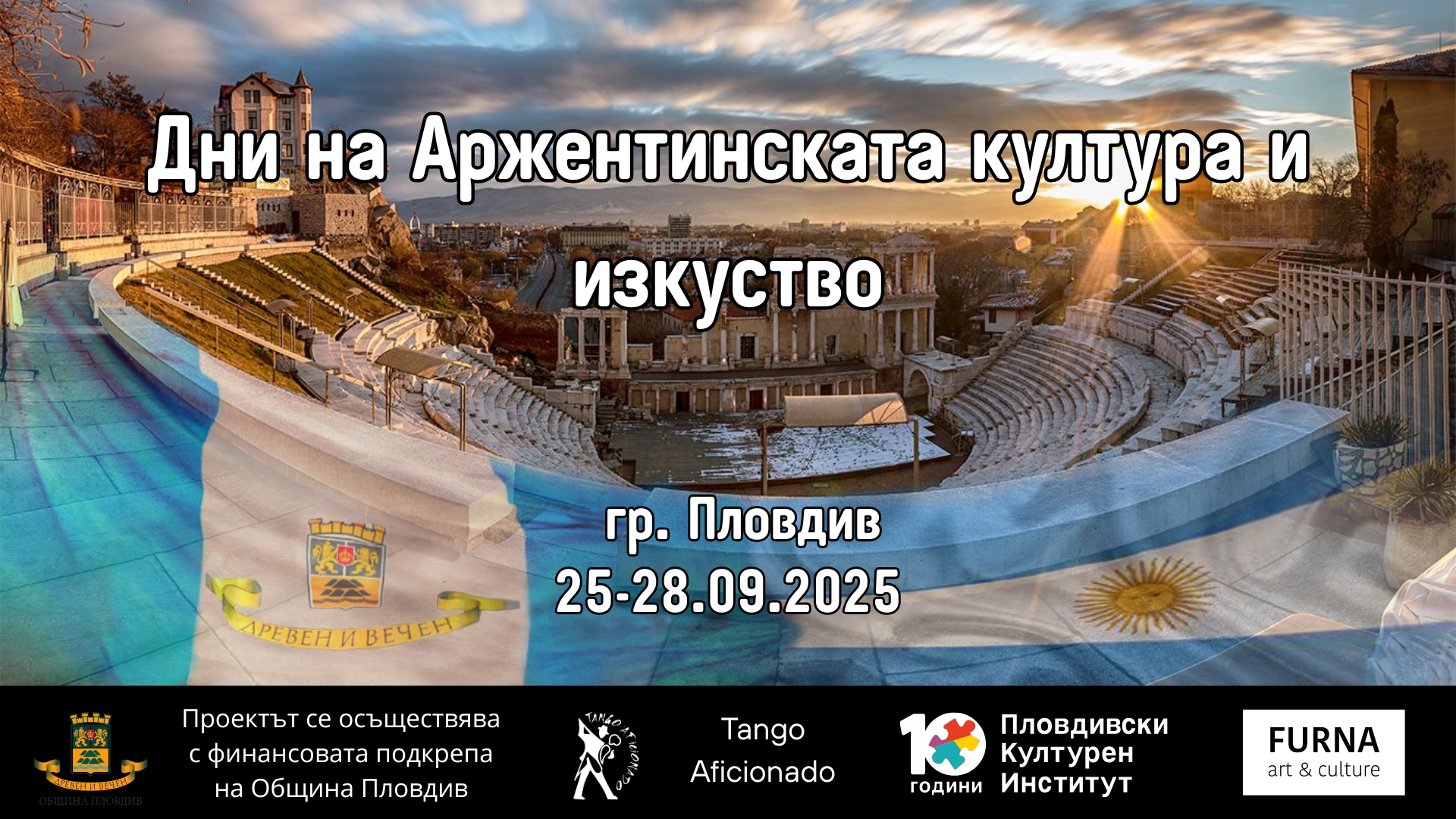 536 „Пригответе се за четири вълнуващи дни, в които Пловдив ще се превърне в сцена на аржентинската страст, изкуство и култура! Дни, в които ще създадем диалог между културите и вдъхновение за всички възрасти! Това е културно събитие, което ще предостави на жителите и гостите на Пловдив възможността да се потопят в богатството и разнообразието на аржентинската култура. В продължение на четири дни, участниците ще могат да се насладят на множество събития, които ще представят както традиционни, така и съвременни аспекти на Аржентина.“ С това малко въведение, организаторите на новия за град Пловдив проект – „Дни на аржентинската култура и изкуство“ от школата за аржентинско танго Танго Афисионадо канят пловдивчани и гости на града от 25 до 28 септември 2025 да се включат в програмата на фестивала. Какво ви очаква? През четирите дни на фестивала ви очакват: изложби, фото разкази, литературни четения, концерти с музиканти от Аржентина и България, пърформанси, уроци по Аржентинско танго и фолклорни танци, милонга …Изкуството ще говори на различни езици – на движението, на образа, на думите и на музиката, а всяко събитие ще ви потопи в духа, страстта и философията на Аржентина. За кого е това събитие? Събитието е подходящо за всеки, който обича изкуството и иска да се потопи в духа на Аржентина – независимо дали е напълно начинаещ, любопитен откривател или вече запален почитател. Ученици, младежи, творци, танцови общности и всички, които търсят вдъхновение и нови преживявания, ще открият нещо за себе си в тези четири дни, изпълнени с ритъм, цвят и емоция. ПРОГРАМА: 25.09.2025 / четвъртък 18:30 часа – Откриване Флашмоб / Дефиле Джумаята – Начало с танцова демонстрация *Локация: Площад Централен – танцова демонстрация 19:30 часа – Представяне на художника Jorge Pogorelski от Мата Джорева *Локация: Пловдивски Културен Институт 26.09.2025 / петък 19:30 часа – Изложба Фото-Разказ: „Аржентина – различна, интересна, завладяваща, вдъхновяваща“ Концерт “По стъпките на тангото” – Ед Лопес и Мартин Пердомо от Аржентина *Локация: Открита сцена на Stage Park 27.09.2025 / събота 11:00 часа – Танго за начинаещи с клуб „Танго Афисионадо“ – безплатен урок 13:00 часа – Танго за средно ниво/напреднали с Марсела Лопес и Мартин Акоста – Техника за двойки: Свързване и интерпретация 14:15 часа – Танго за средно ниво/напреднали с Марсела Лопес и Мартин Акоста – Техника за двойки: Хиро и Сакади в близка прегръдка 19:30 часа – Концерт на Фатима Ел Кощ 21:00 – 01:30 часа – Милонга => Танго шоу с Лаура Рускони и Марио Бурнисен *Локация: Пловдивски Културен Институт Цени, при предварителна регистрация и плащане: 1 урок – 25 лв. / 12,78 EUR Вход милонга – 25 лв. / 12,78 EUR 4 урока и милонга – 100 лв. / 51,10 EUR Цени на място: 1 урок – 30 лв. / 15,33 EUR Вход милонга – 30 лв. / 15,33 EUR Линк за регистрация за танцовите работилници и милонгата: https://forms.gle/3uJ8FWdnmzUdJSed9 28.09.2025 / неделя 13:00 часа – Аржентински фолклорни танци – Чакарера с Марсела Лопес и Мартин Акоста 14:15 часа – Аржентински фолклорни танци – Замба с Марсела Лопес и Мартин Акоста 16:30 часа – Литературно матине: => Литературно четене – среща с творчеството на Хорхе Луиз Борхес с Нелиан Николова => Интерактивна лекция „История на Аржентинското танго”с Мата Джорева => Литературно четене – среща с творчеството на Хорхе Букай с Нелиан Николова 19:30 часа – Концерт на „Tango Cats“ *Локация: Пловдивски Културе