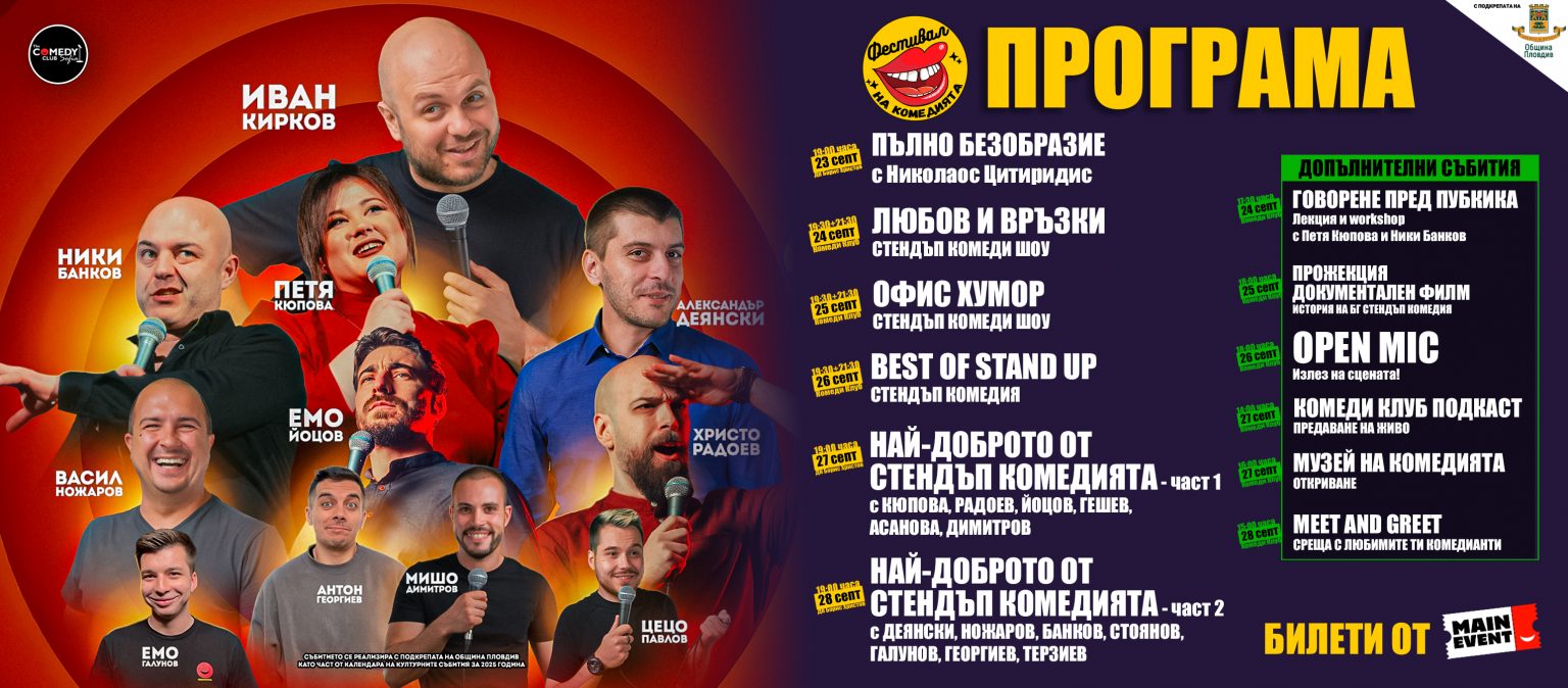 390 Есента на смеха започва в Пловдив тази вечер с шоуто „Пълно безобразие с Николаос Цитиридис“ в Дом на културата „Борис Христов“ от 19.00 часа в голямата Зрителна зала. Между 23 и 28 септември 2025 градът посреща 9-тия Фестивал на комедията – шест дни, посветени на стендъп комеди и най-добрите комедианти от комеди клуб сцената в България. Основните локации са Дом на културата „Борис Христов“ и Комеди Клуб Пловдив. Шестдневният фестивал се организира от Комеди Клуб с подкрепата на община Пловдив и носи разнообразна програма от стендъп шоута, уъркшопи, срещи с комедиантите отблизо и безплатни вечери за млади ентусиасти. В различните дни от програмата на Фестивала ще вземат участие някои от най-известните български стендъп комедианти, сред които: ИВАН КИРКОВ, ПЕТЯ КЮПОВА, НИКИ БАНКОВ, ЕМО ЙОЦОВ, ВАСИЛ НОЖАРОВ, АЛЕКСАНДЪР ДЕЯНСКИ, ХРИСТО РАДОЕВ и други млади таланти. 23 септември 19:00 часа Пълно безобразие с Николаос Цитиридис – Дом на Културата Борис Христов – Зрителна Зала – Билети 24 септември 17:30 часа Работилница Лекция по Говорене пред Публика – Лекция и Уъркшоп с Петя Кюпова и Ники Банков – Комеди Клуб Пловдив – Запиши се 19:30 и 21:30 часа Хумор за Любов и връзки – Комеди Клуб Пловдив – Билети 25 септември 18:00 Прожекция на документален филм – История на Стендъп Комедията в България – зала Комеди Клуб Пловдив 19:30 и 21:30 часа Офис Хумор – Комеди Клуб Пловдив – Билети 26 септември 18:00 часа Отворен Микрофон (Open Mic) – конкурс за млади любители и таланти в стендъп комедията с професионално жури – Комеди Клуб Пловдив – Запиши се за участие 19:30 и 21:30 часа Best Of Stand Up Comedy – Най-доброто от 3 комедианти – Комеди Клуб Пловдив – Билети 27 септември 14:00 часа Комеди Клуб Подкаст на живо – Комеди Клуб Пловдив 16:00 часа Музей на Комедията – Откриване – Дом на Културата Борис Христов – фоайе 19:00 часа Най-доброто от Българската Стендъп Комедия част I с Петя Кюпова, Христо Радоев, Емо Йоцов, Стоян Гешев, Пери Асанова, Мишо Димитров – Дом на Културата Борис Христов – Зрителна Зала – БИЛЕТИ 28 септември 14:00 часа Отворена среща с комедианти – Meet and Greet – Комеди Клуб Пловдив 15:30 часа Конкурс за най-добър любителски комедиен плакат/ карикатура – Зала Комеди Клуб Пловдив 19:00 часа Най-доброто от стендъп комедията част II със Сашо Деянски, Васил Ножаров, Ники Банков, Жоро Стоянов, Емо Галунов, Тони Георгиев, Кристиян Терзиев – Дом на Културата Борис Христов Зрителна Зала – БИЛЕТИ Фестивалът на комедията е ежегодно организирано събитие от Comedy Club Bulgaria и се провежда всяка година от 2014 насам. Той се утвърди във времето като традиция, която събира на една сцена както популярни стендъп артисти, така и любители на хумора, и е считан за най-големия организиран комедиен фестивал на Балканите. Фестивалът на комедията се осъществява с подкрепата на община Пловдив и е част от Културния календар на града за 2025 година. Билетите могат да се открият в сайта на https://mainevent.bg/. Комеди Фестивал Пловдив 2025: Програма и Билети Може да ви хареса също AL BANO: Да пея на сцена като Античния театър в Пловдив е чест и вдъхновение Ансамбъл „Тракия“ с нов мащабен спектакъл, вдъхновен от река Марица България с пълен национален отбор за Европейското първенство по стрелба с лък в Пловдив Регионален етнографски музей – Пловдив с работилници за мартеници